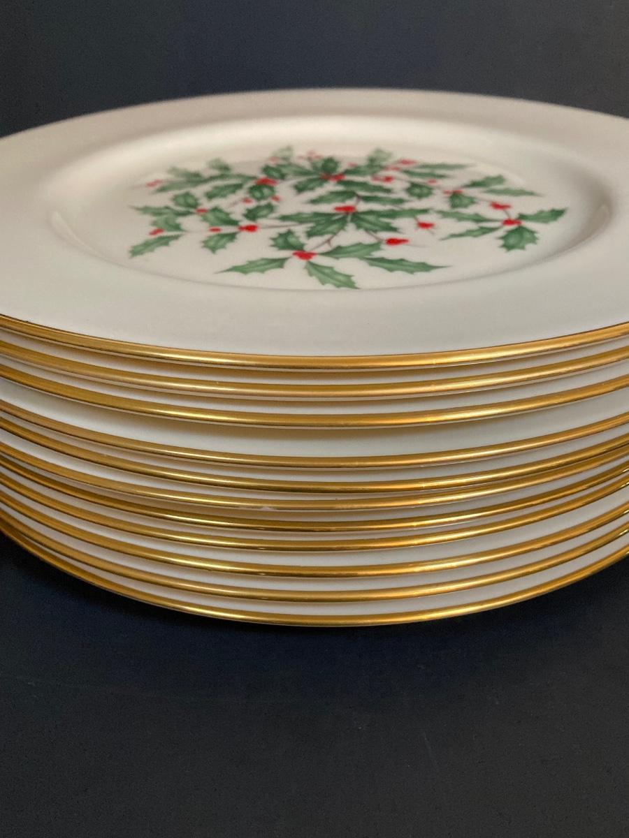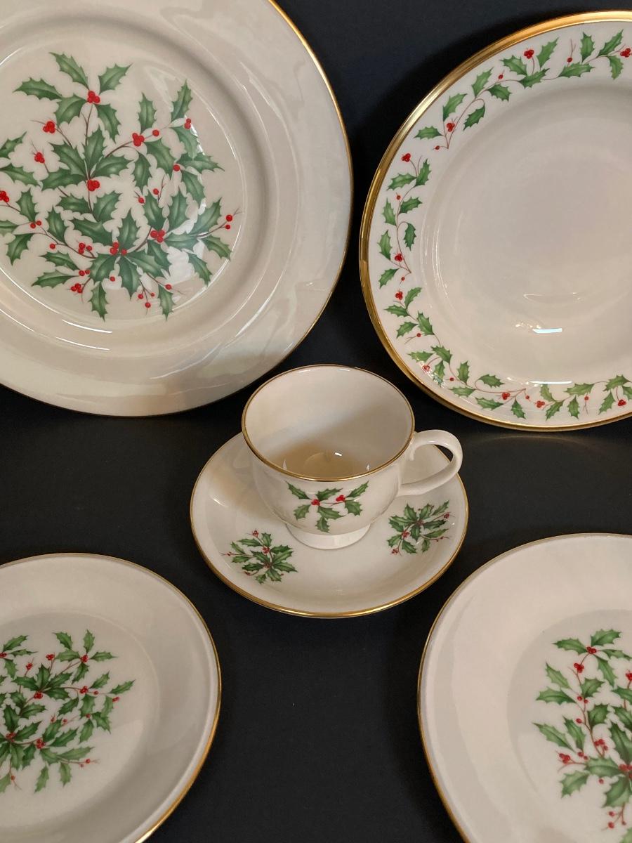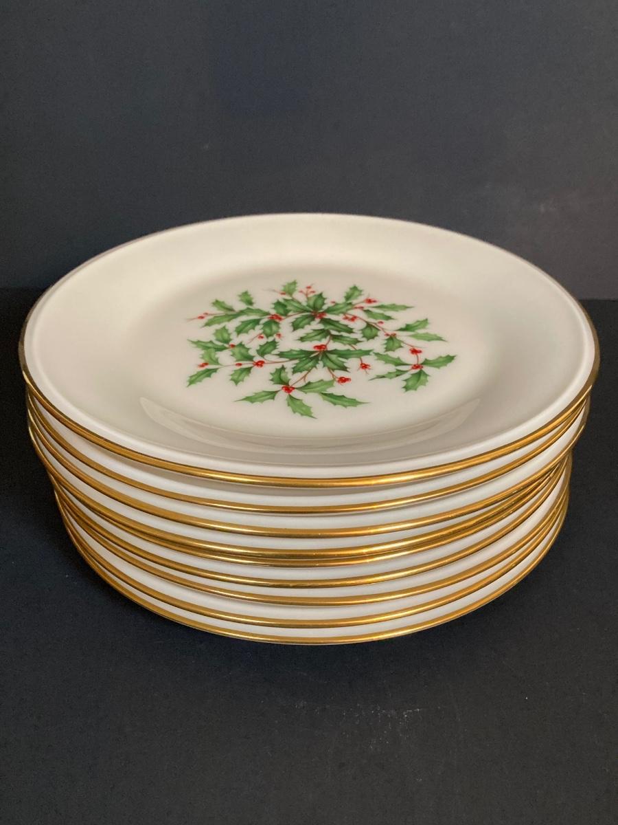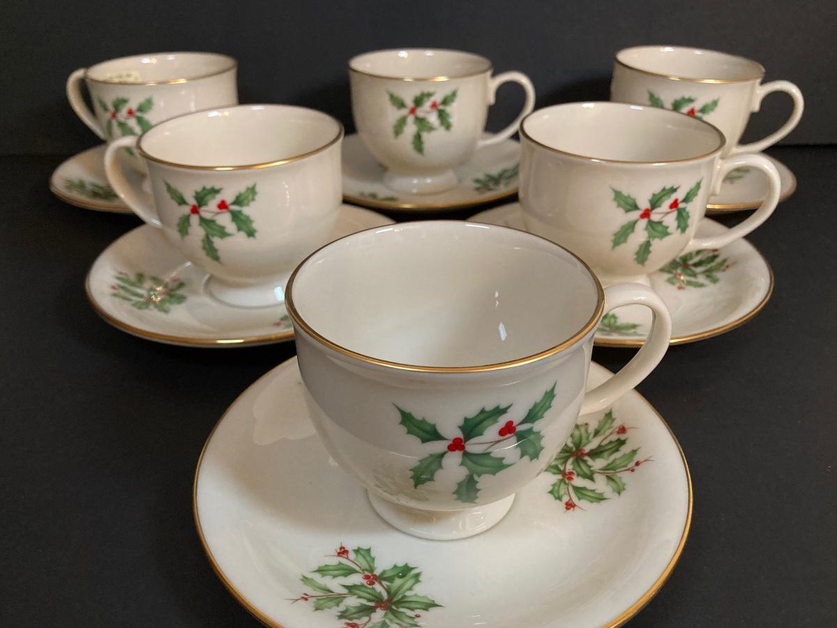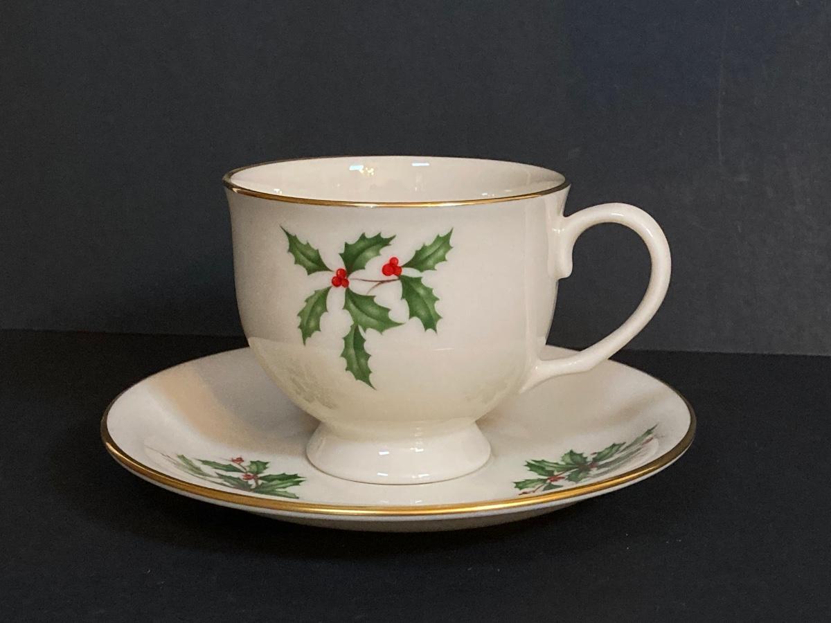 LOT 64D: Lenox Holiday Dinnerware - Holly Cups and Saucers, Dinner Plates, Bowls and Dessert / Salad Plates