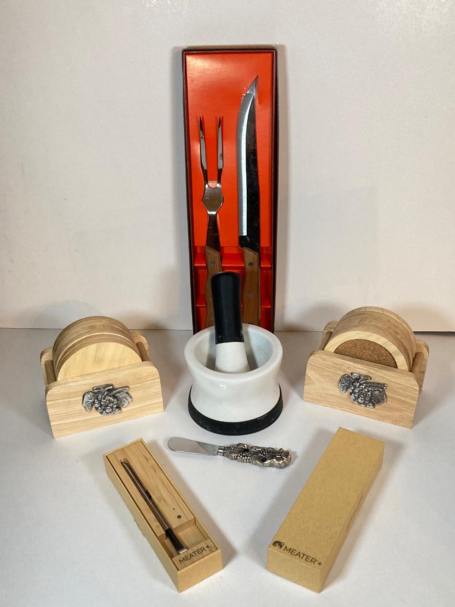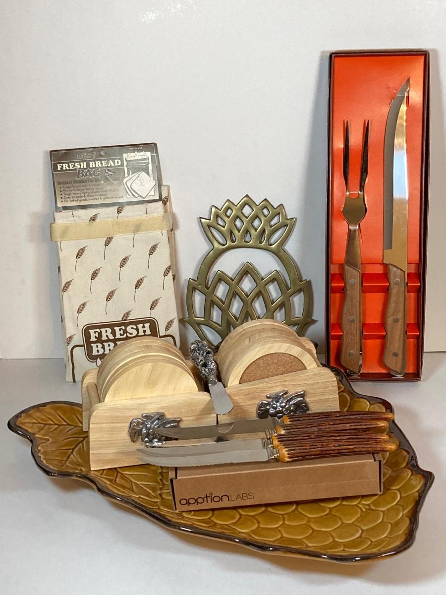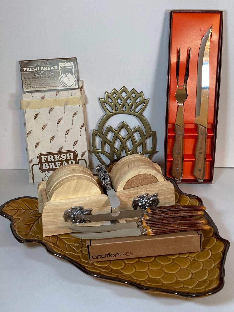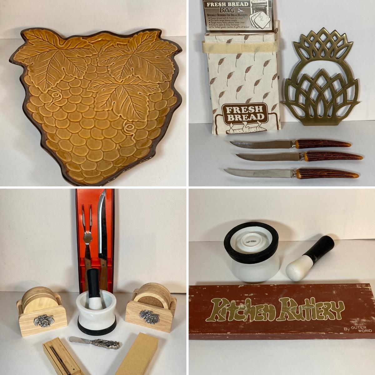 LOT 71D: Kitchen Collection - Raymond Waites Bordeaux Platter, Brass Pineapple Trivet, "Smart" Meat Thermometer, Regal Crest Steak Knives, Mortar and Pestle, Kitchen Kutlery set & More