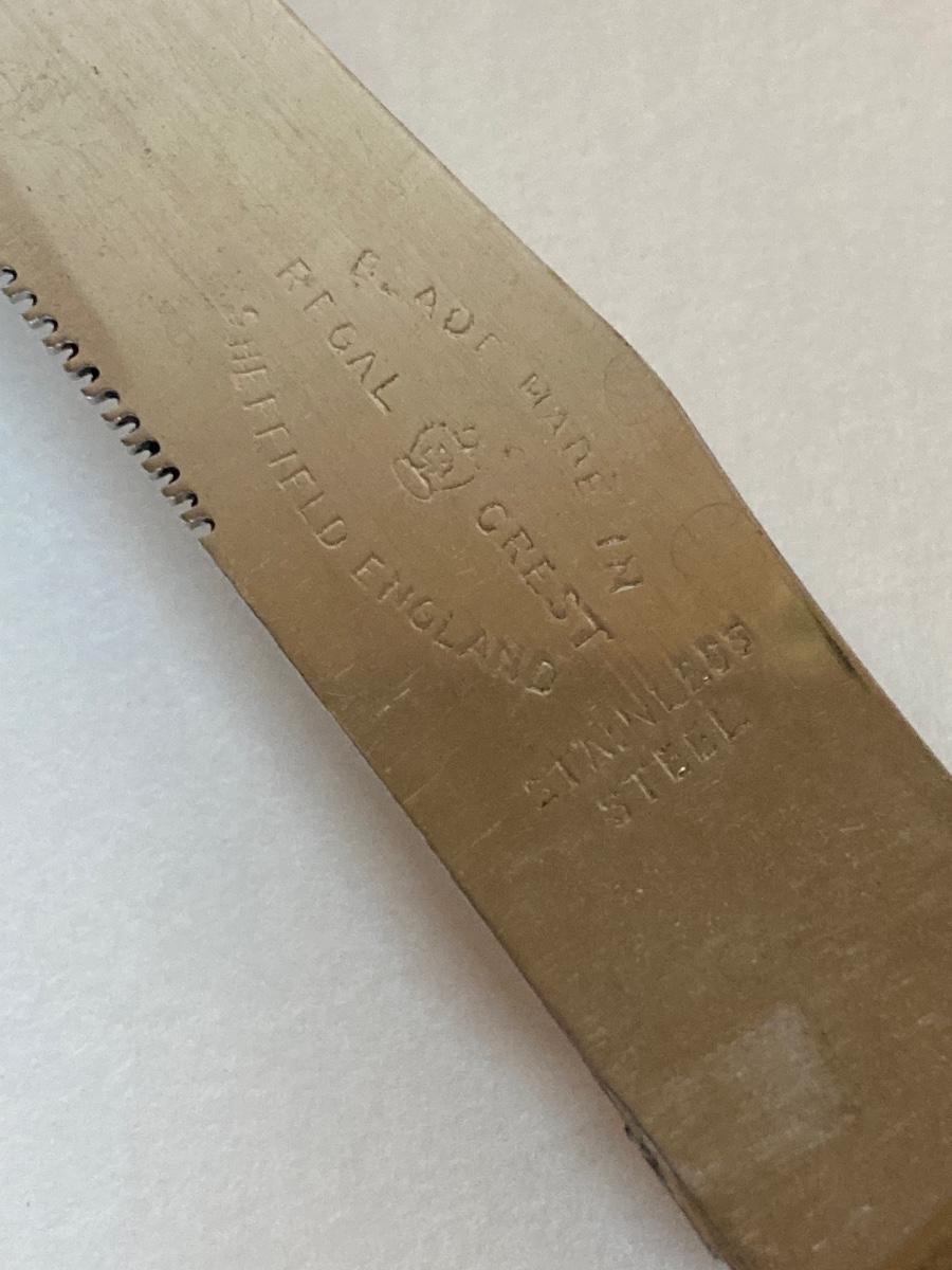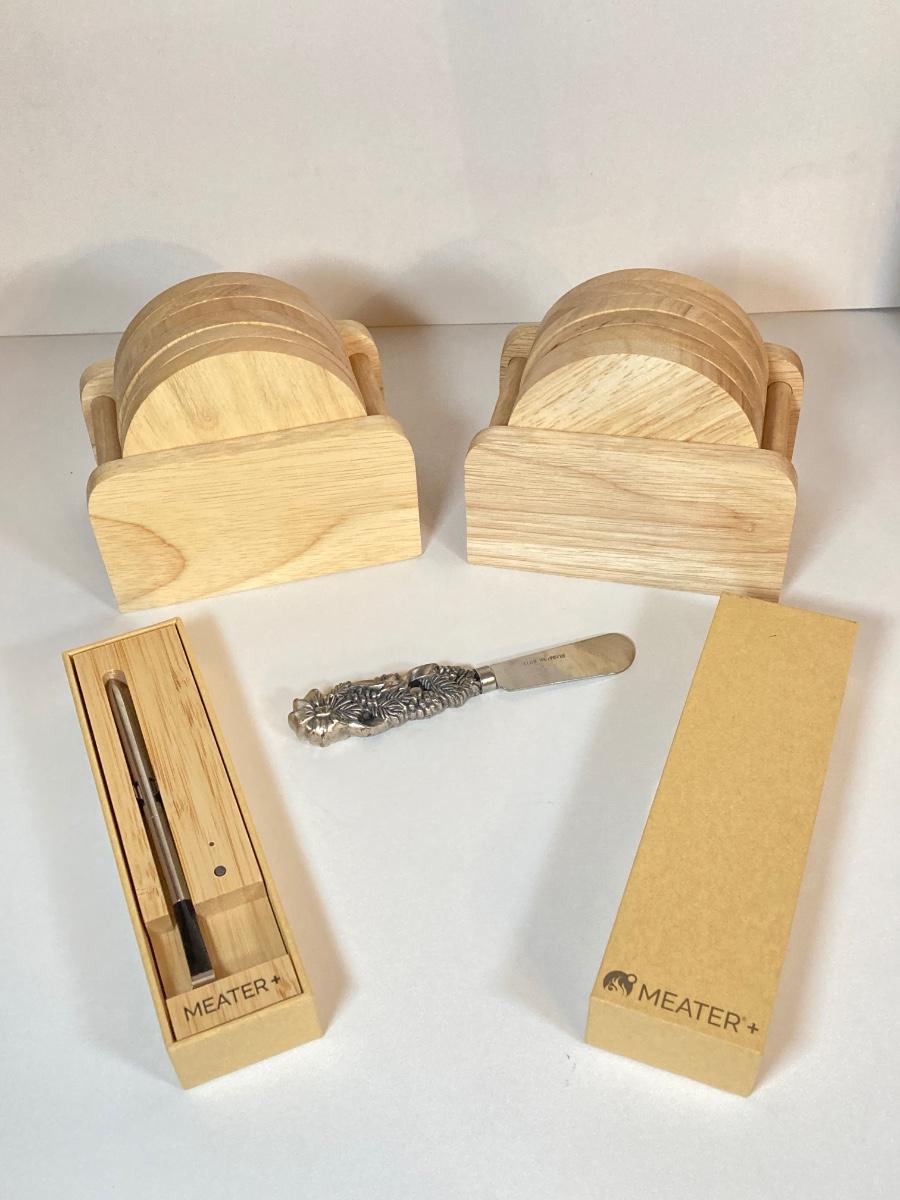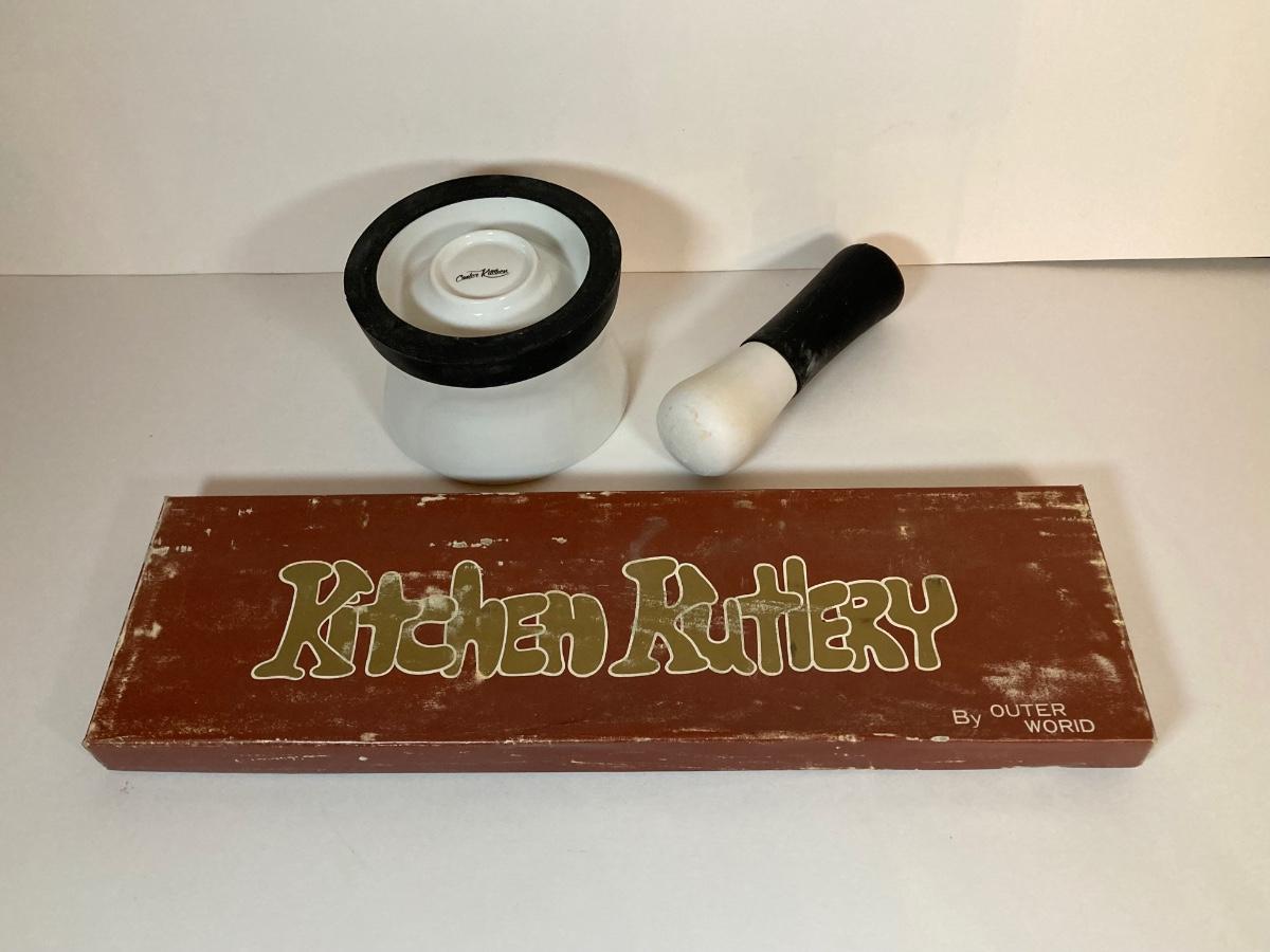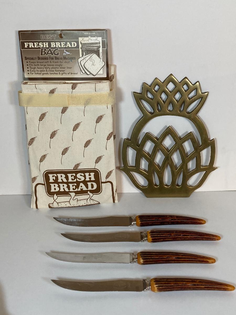 LOT 71D: Kitchen Collection - Raymond Waites Bordeaux Platter, Brass Pineapple Trivet, "Smart" Meat Thermometer, Regal Crest Steak Knives, Mortar and Pestle, Kitchen Kutlery set & More
