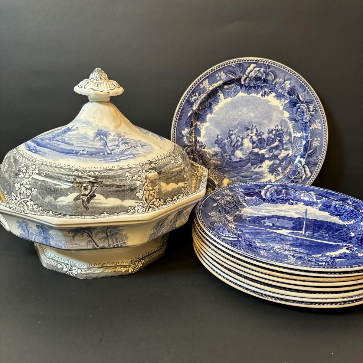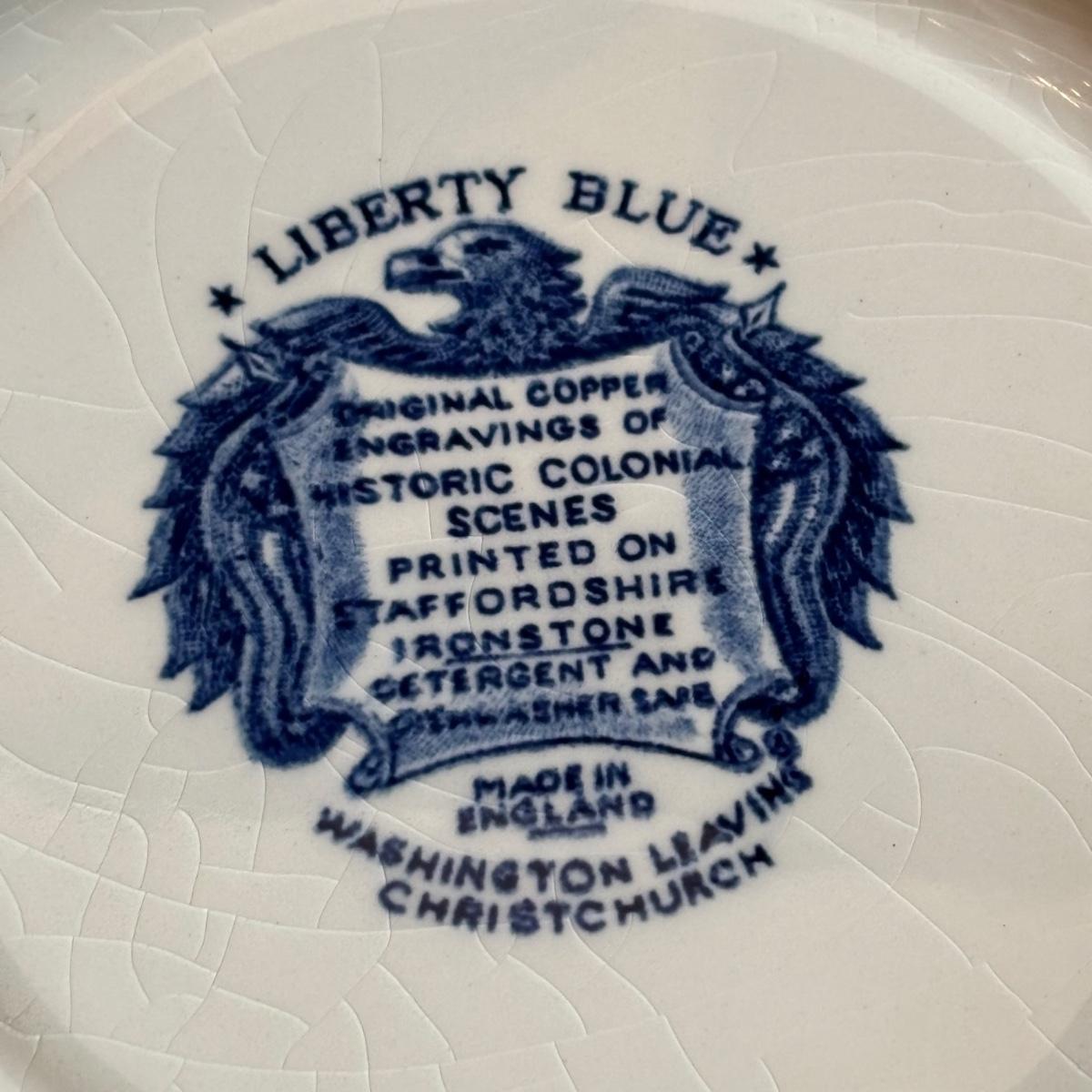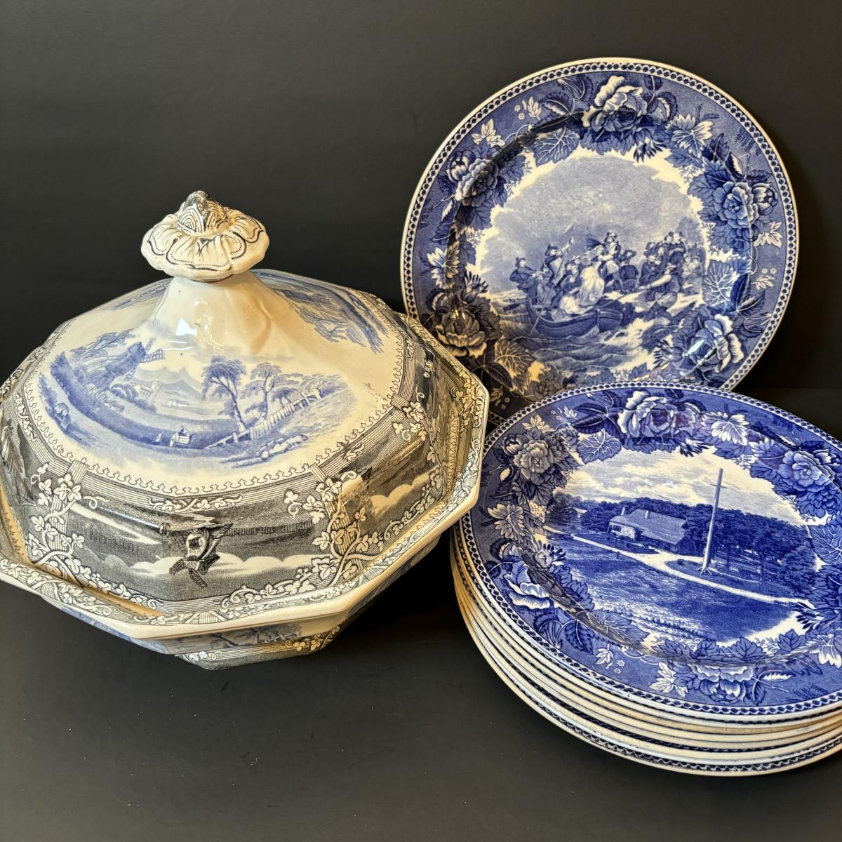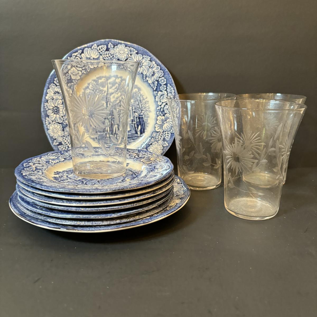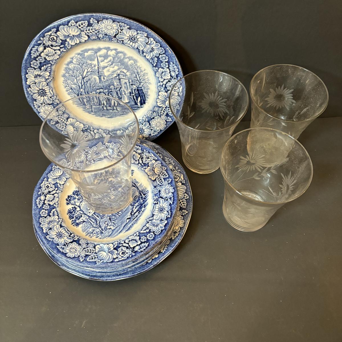 LOT 85: Vintage Williscroft Ironstone Soup Tureen, Wedgewood Plates, Etched Glasses & Liberty Blue Plates