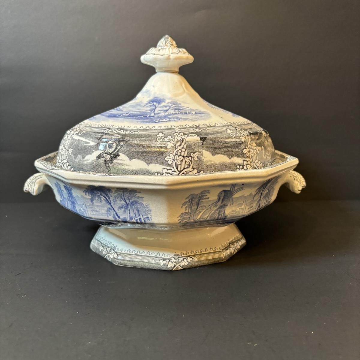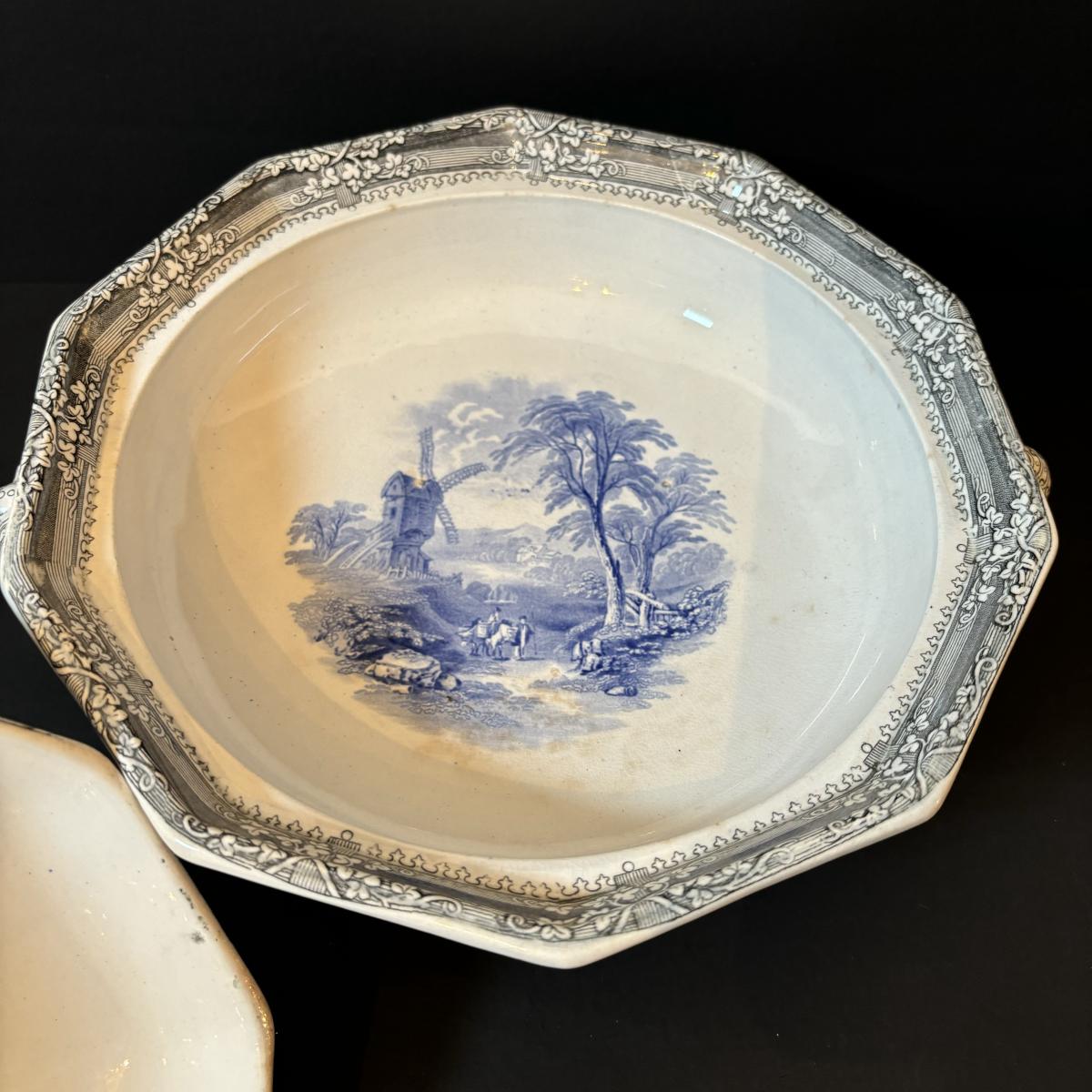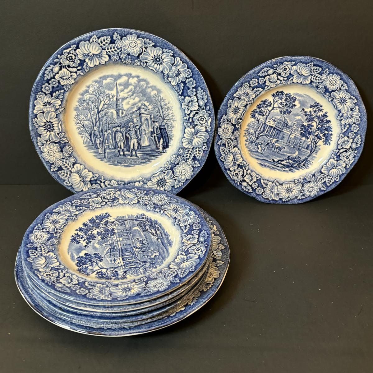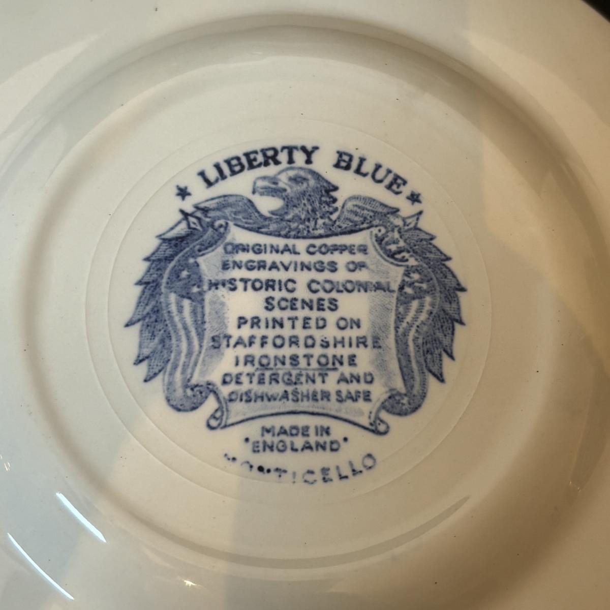 LOT 85: Vintage Williscroft Ironstone Soup Tureen, Wedgewood Plates, Etched Glasses & Liberty Blue Plates