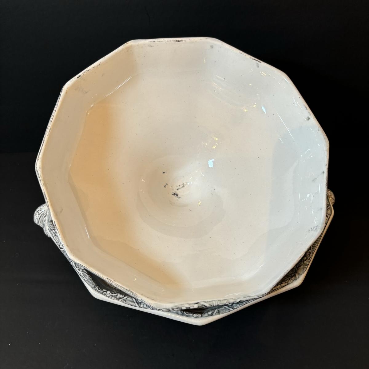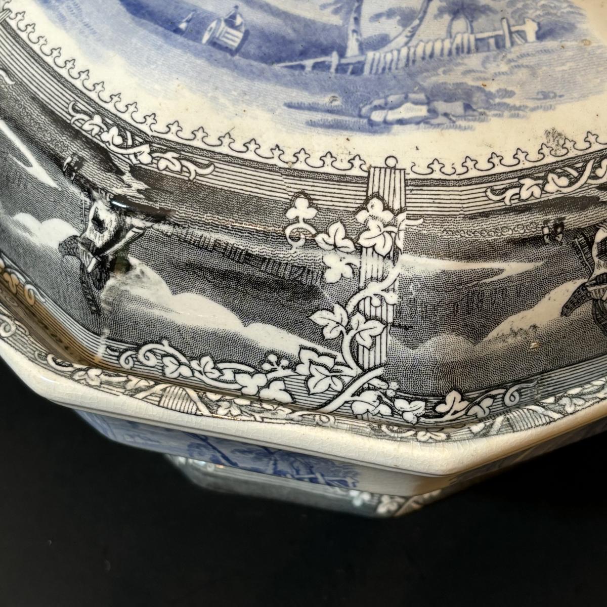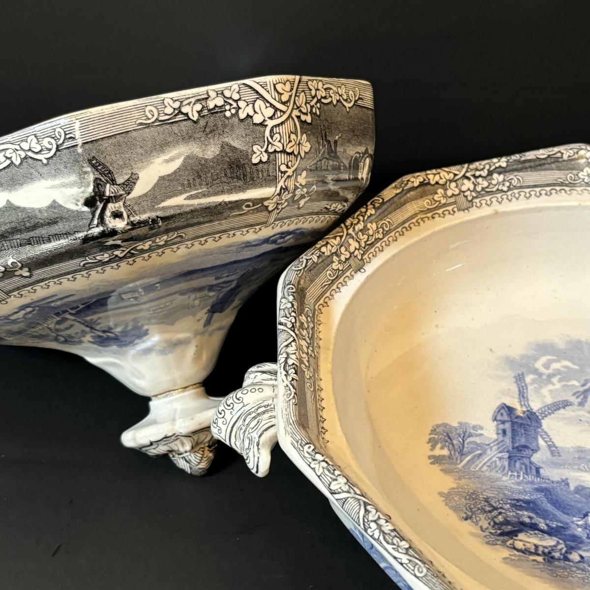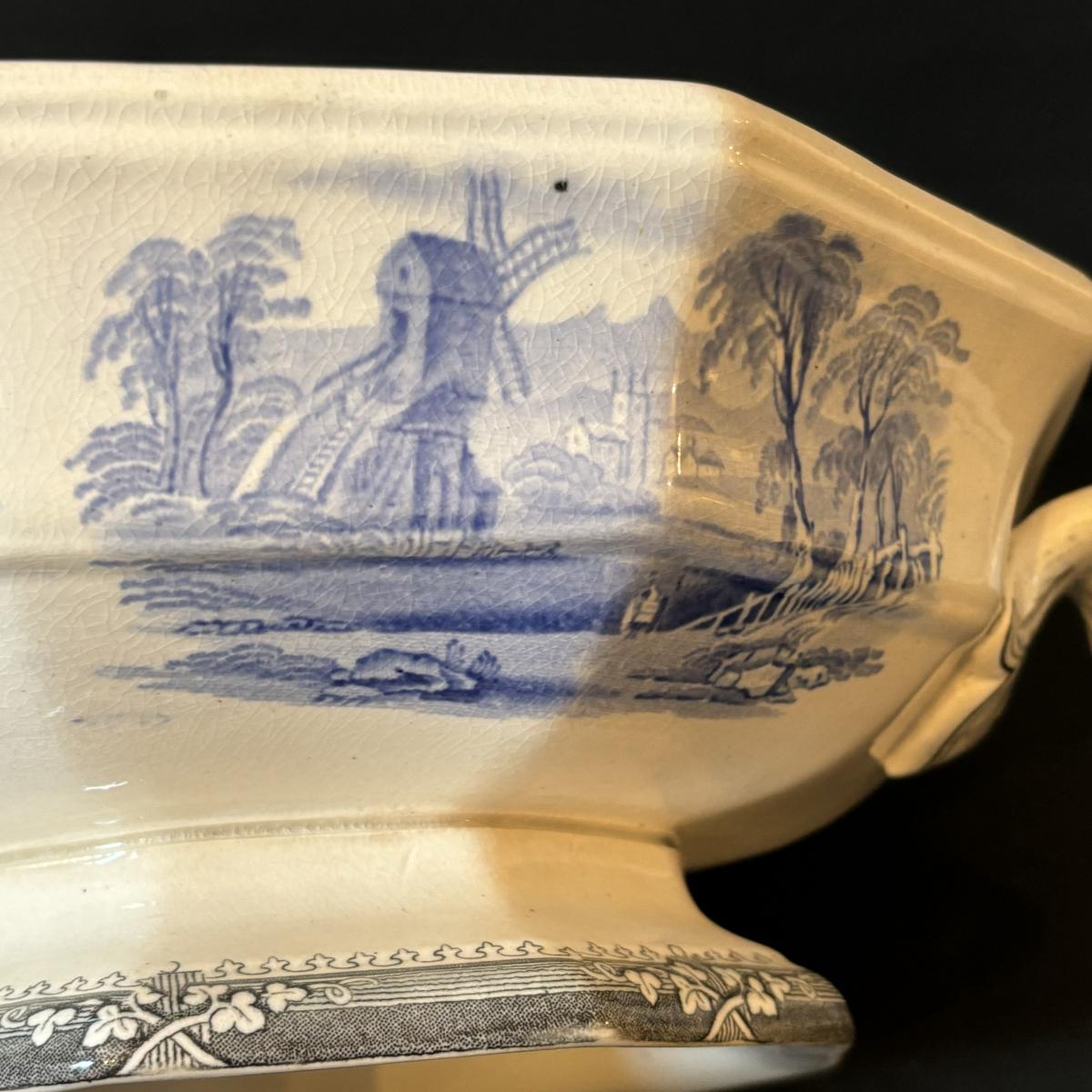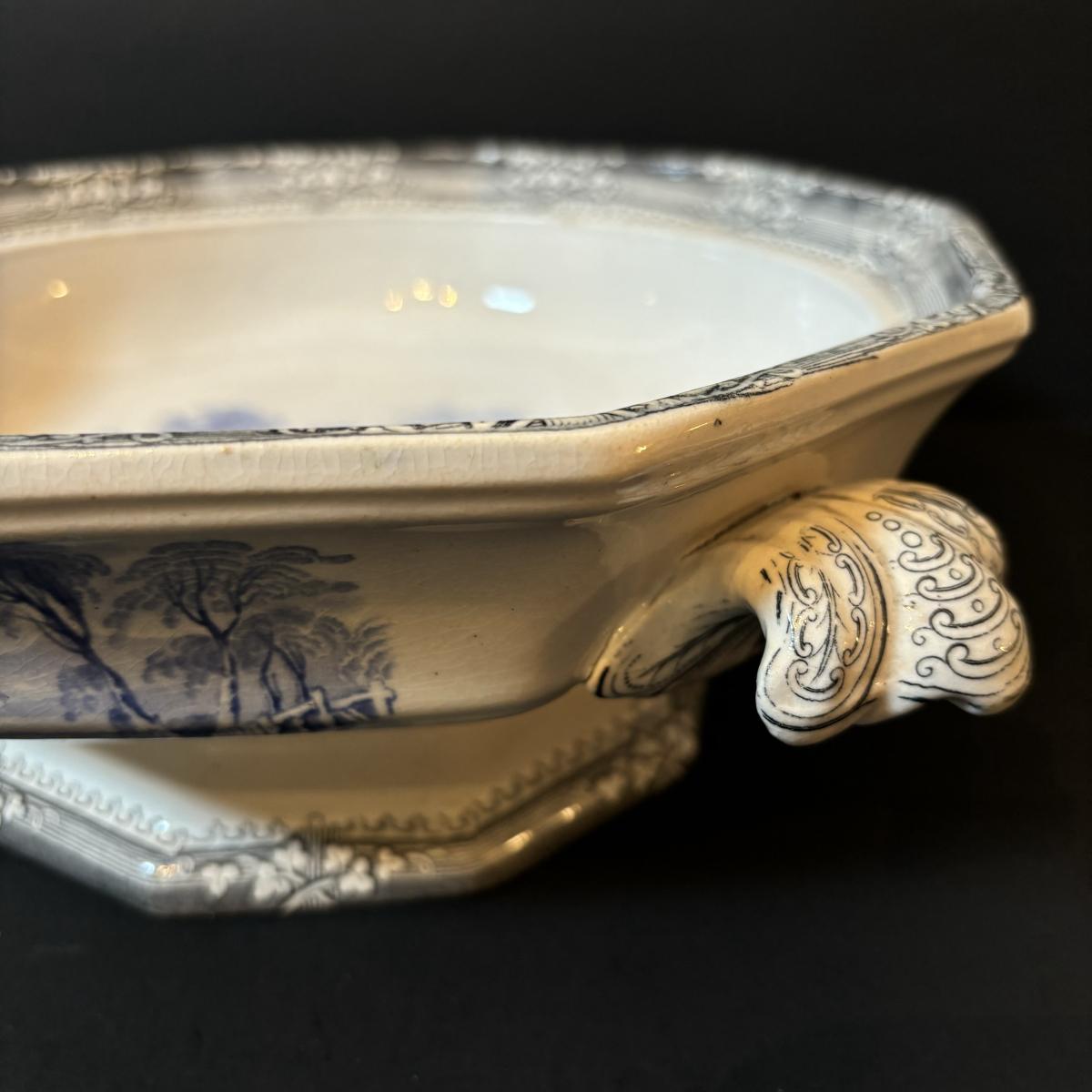 LOT 85: Vintage Williscroft Ironstone Soup Tureen, Wedgewood Plates, Etched Glasses & Liberty Blue Plates