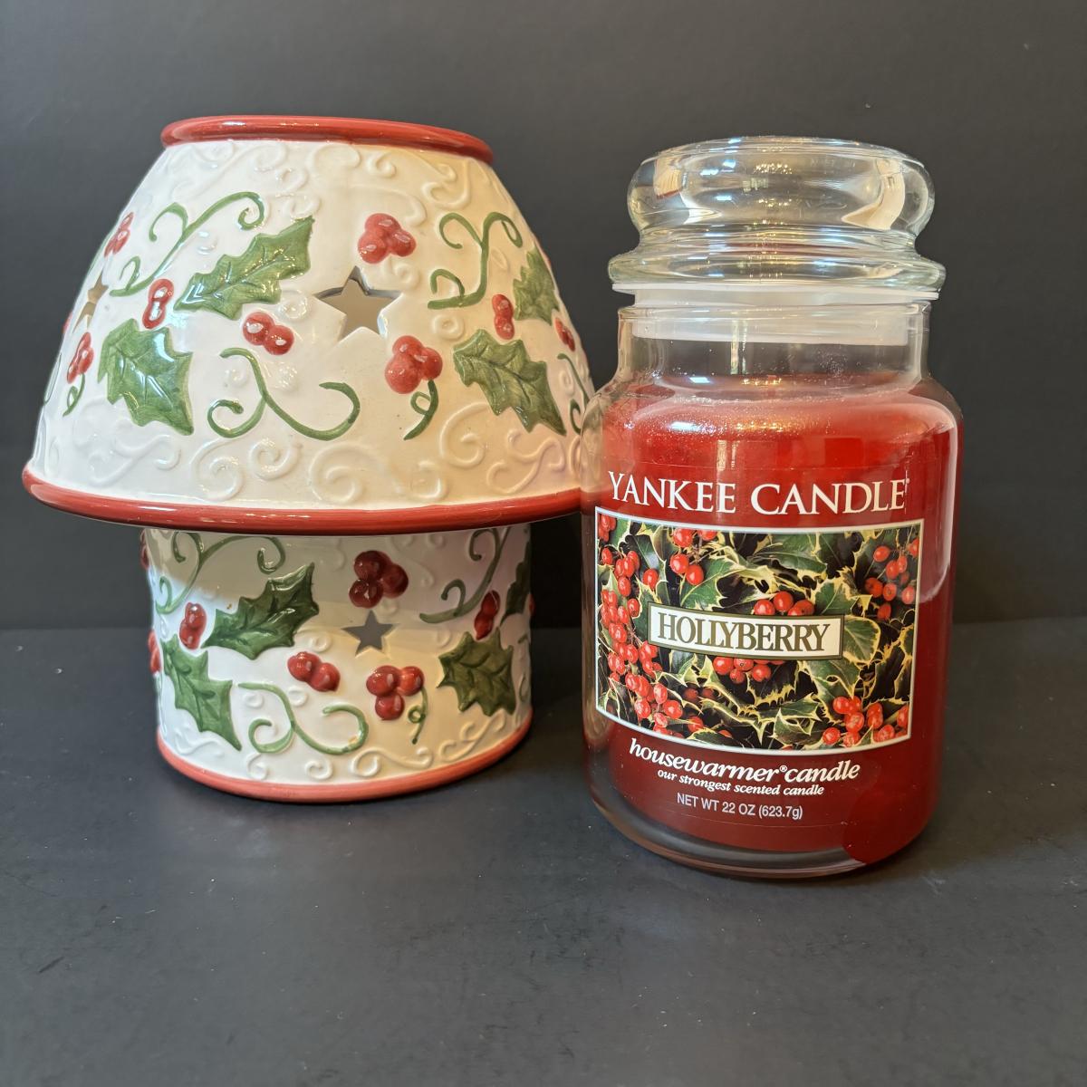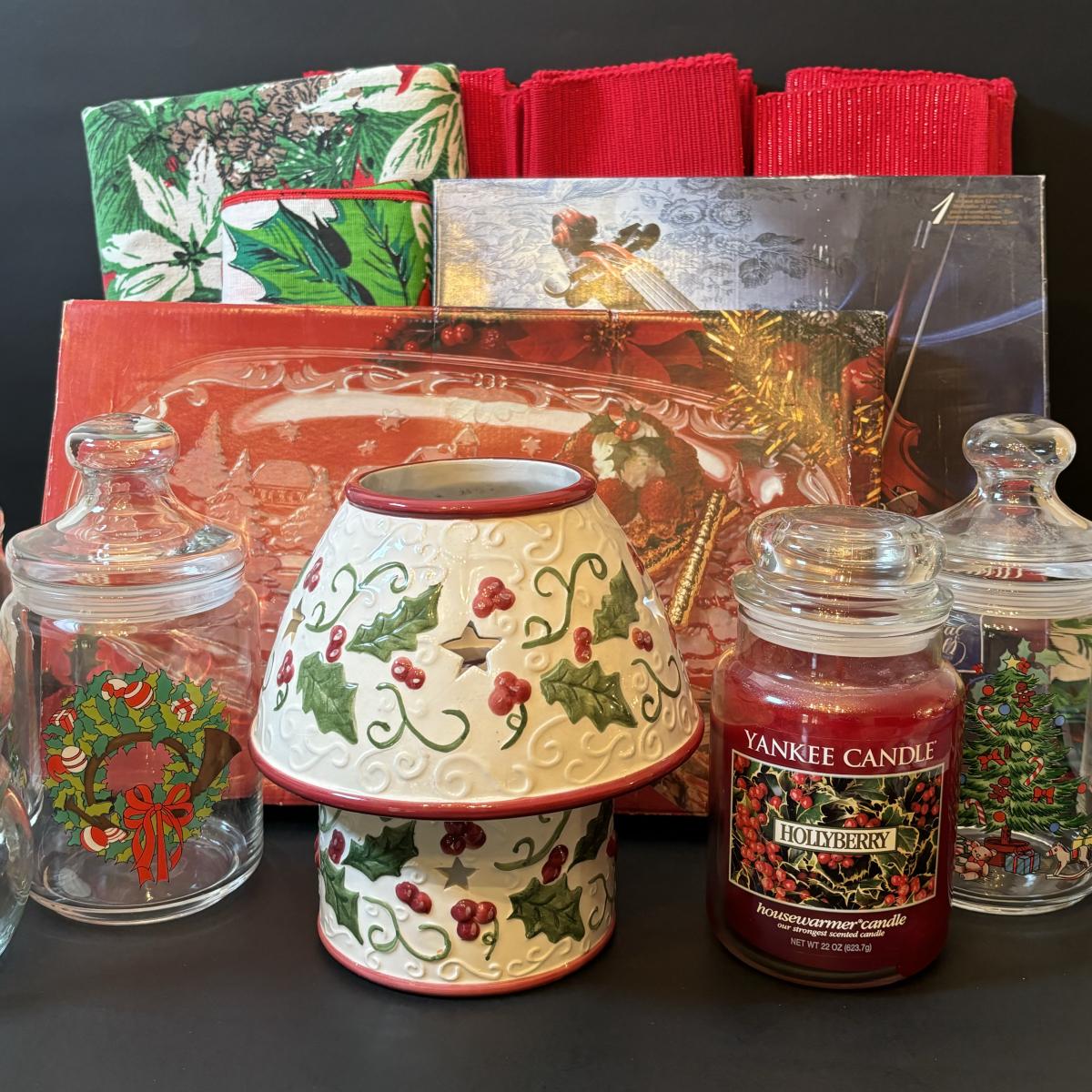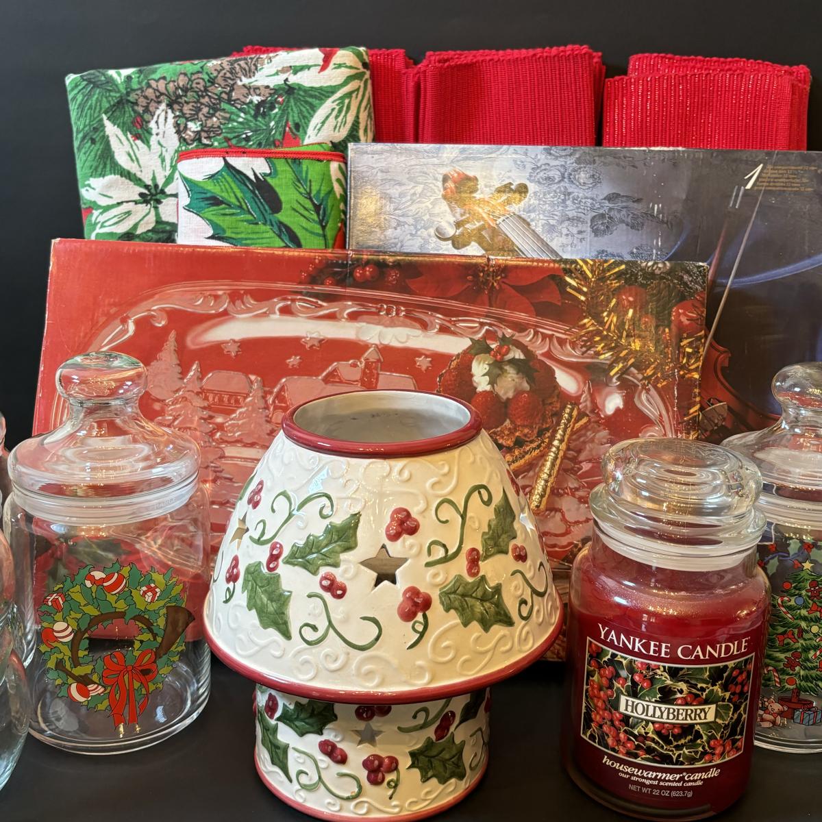 LOT 108: Holiday Yankee Candle w/Candle Holder & Shade, Holiday Fillable Jars, Serving Platters, Placements