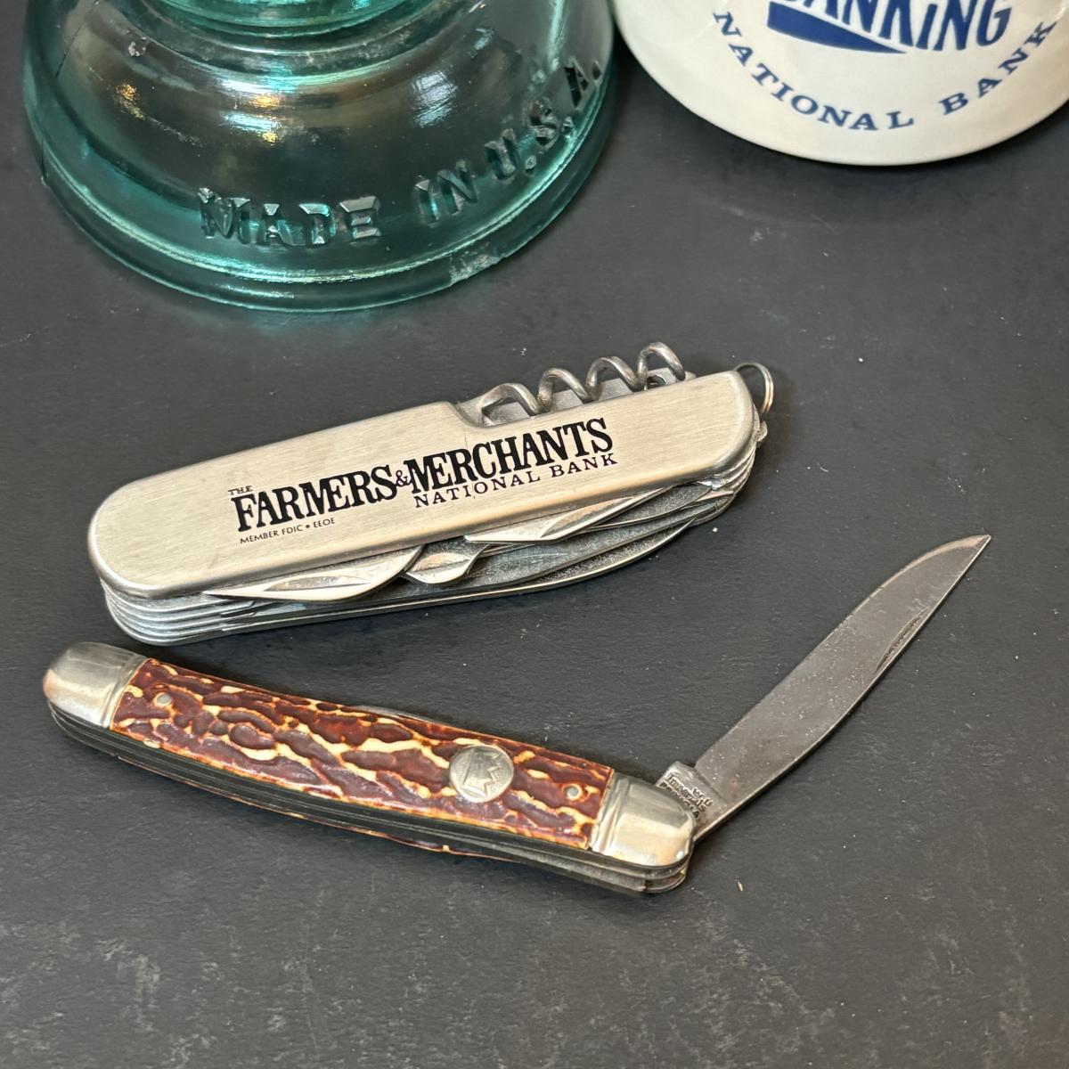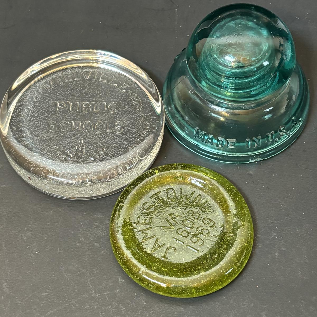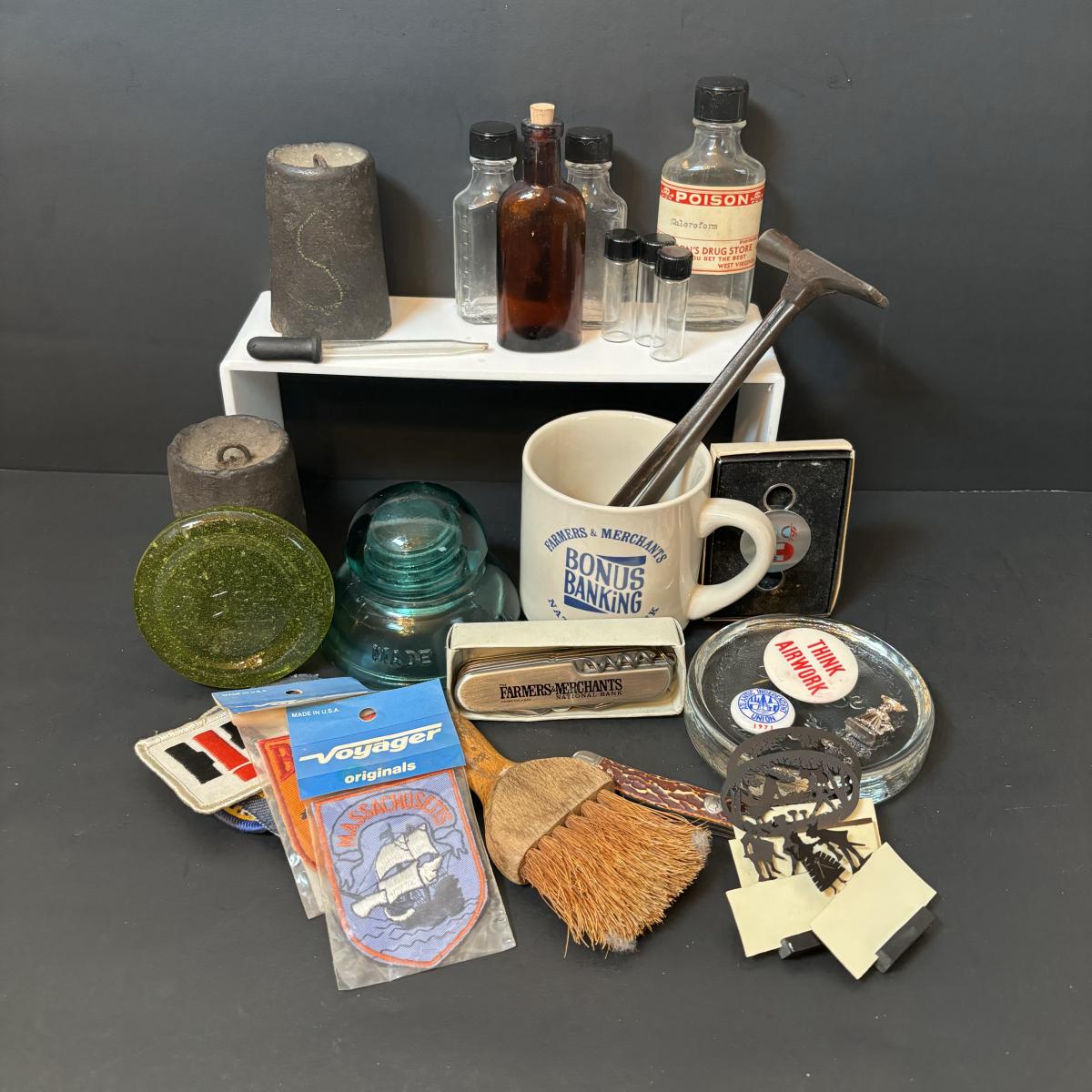 LOT 134: Collection of This & That: Paperweights, Farmers National Bank Pen Army Knife & Mug, Weights, Medicine Bottles & More