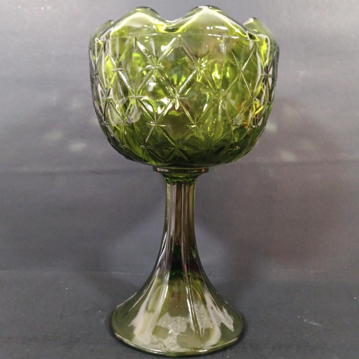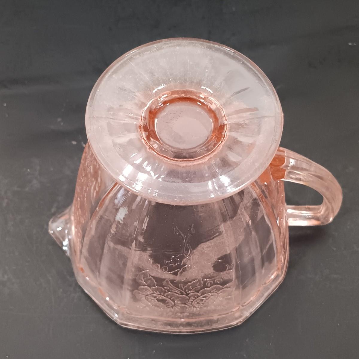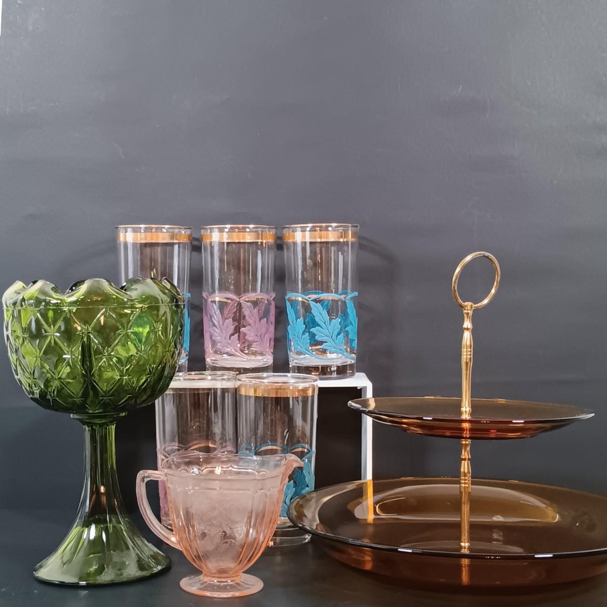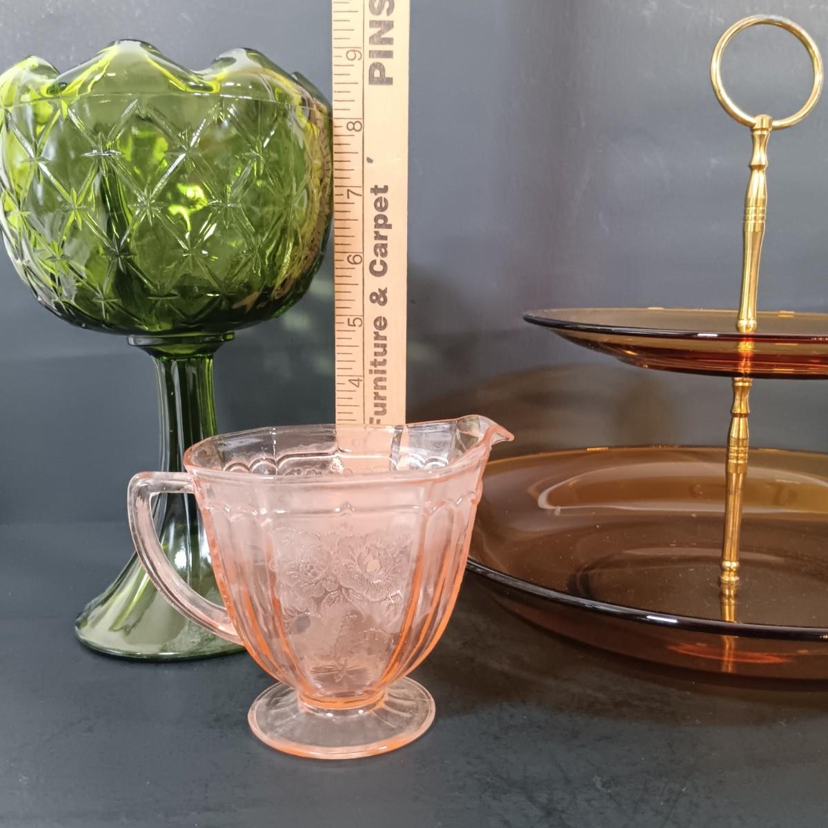 LOT 142: Vintage Libbey Fern Glaze Glasses, Green Compote Bowl, Amber Cake Display & Pink Depression Glass Creamer