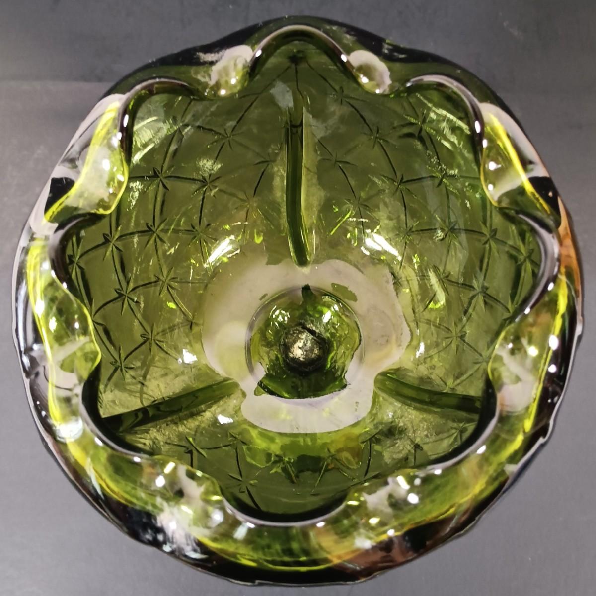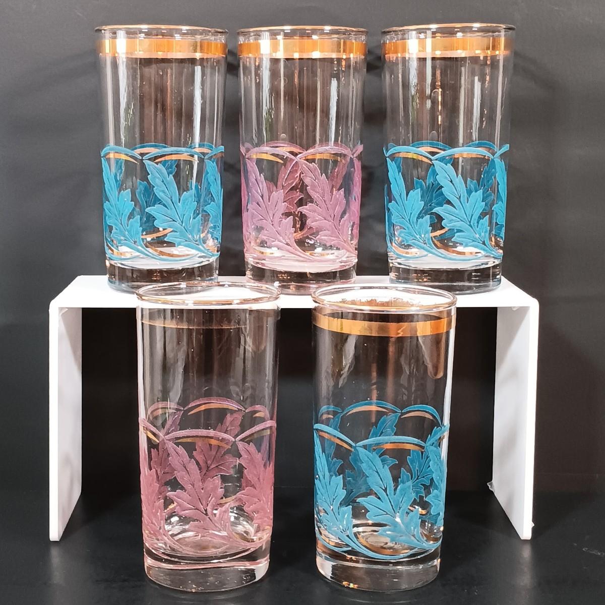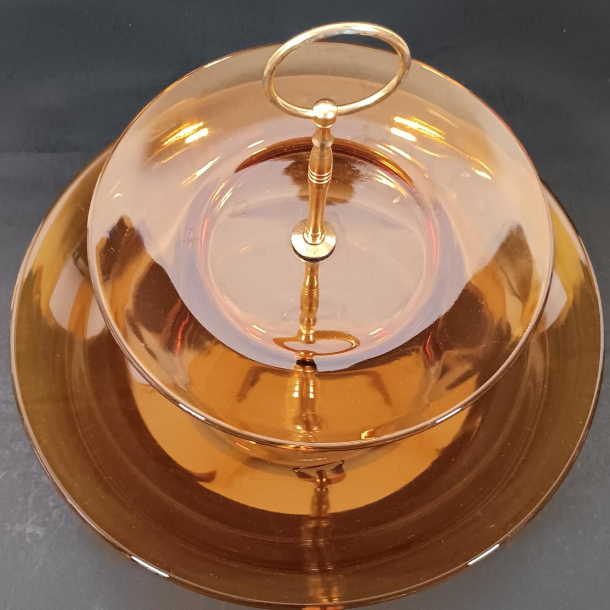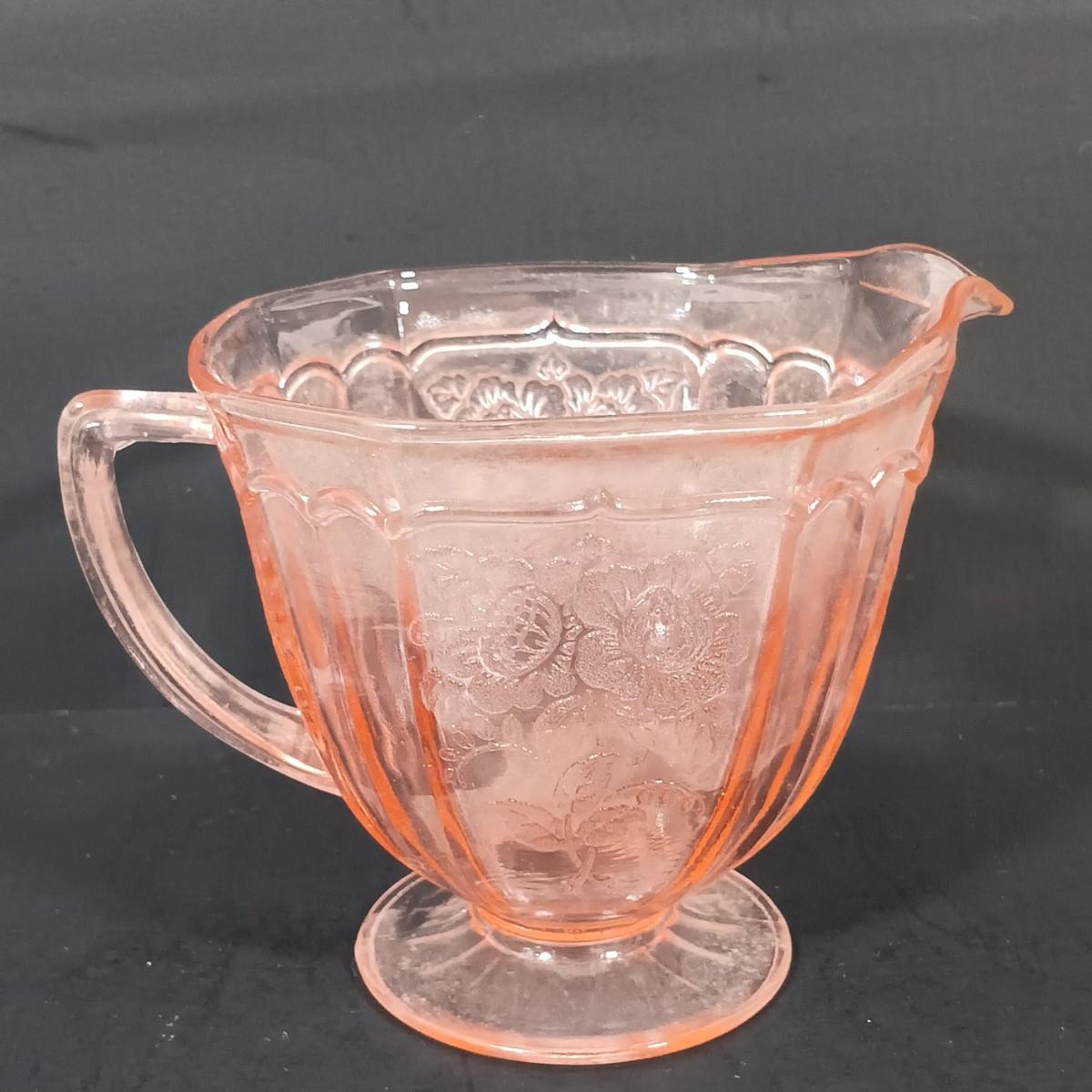 LOT 142: Vintage Libbey Fern Glaze Glasses, Green Compote Bowl, Amber Cake Display & Pink Depression Glass Creamer