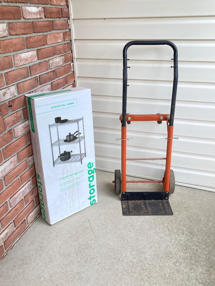 LOT 181G: Three Shelf Storage Unit and Metal Hand Cart / Dolly