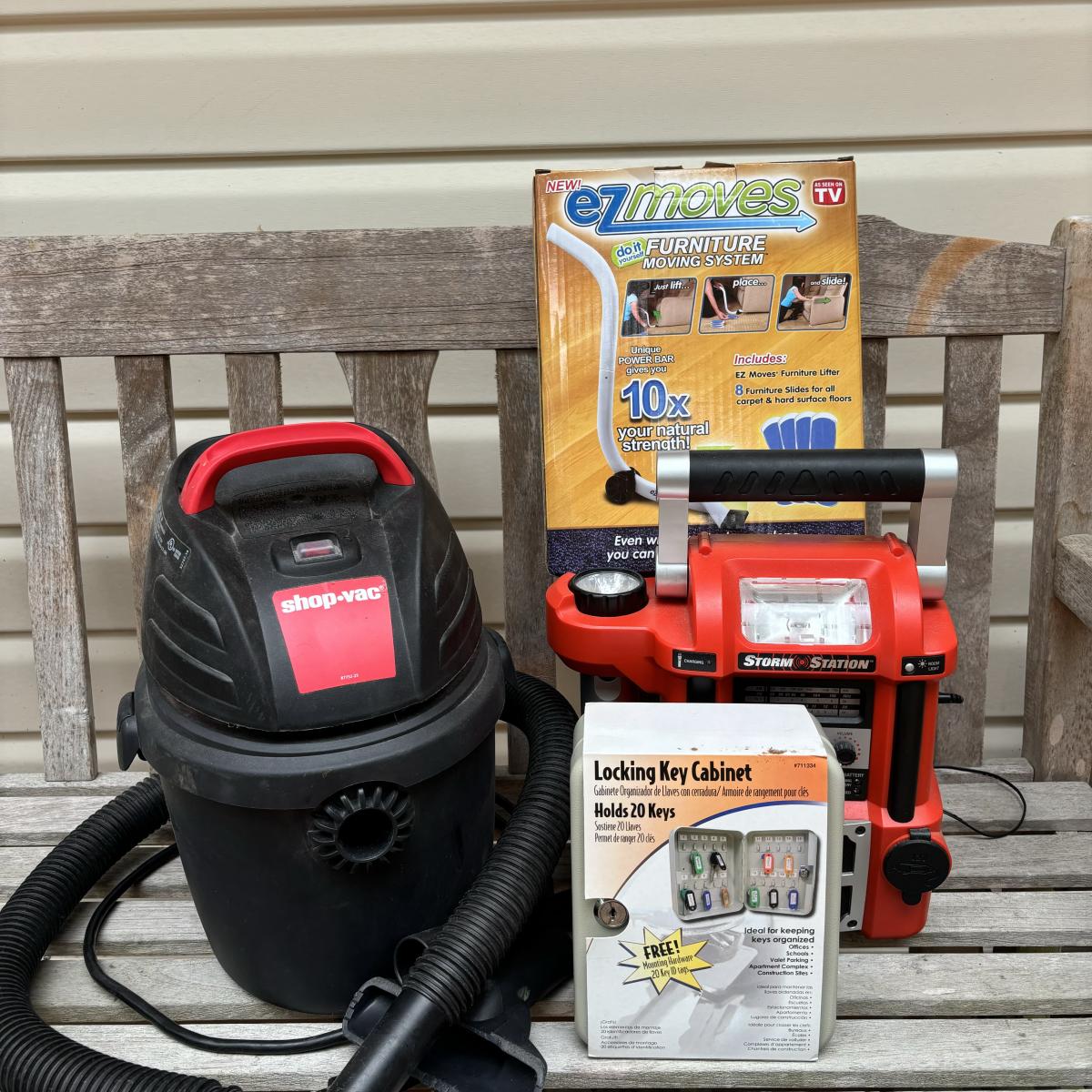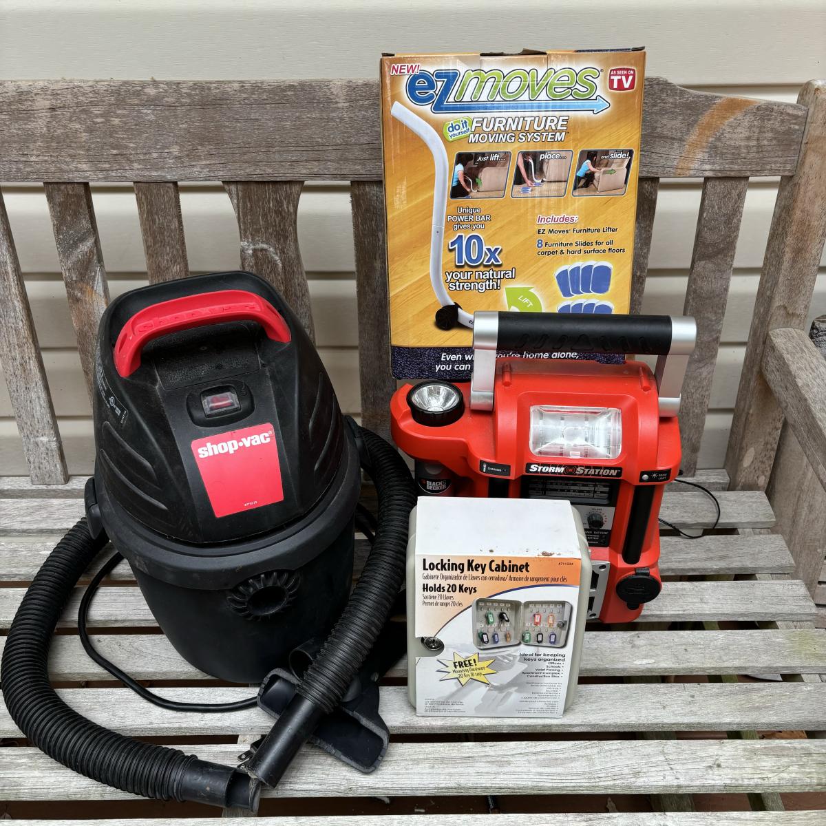 LOT 235: Black & Decker Storm Station, EZ Moves Furniture Moving System, Locking Key Cabinet & Small Shop Vac