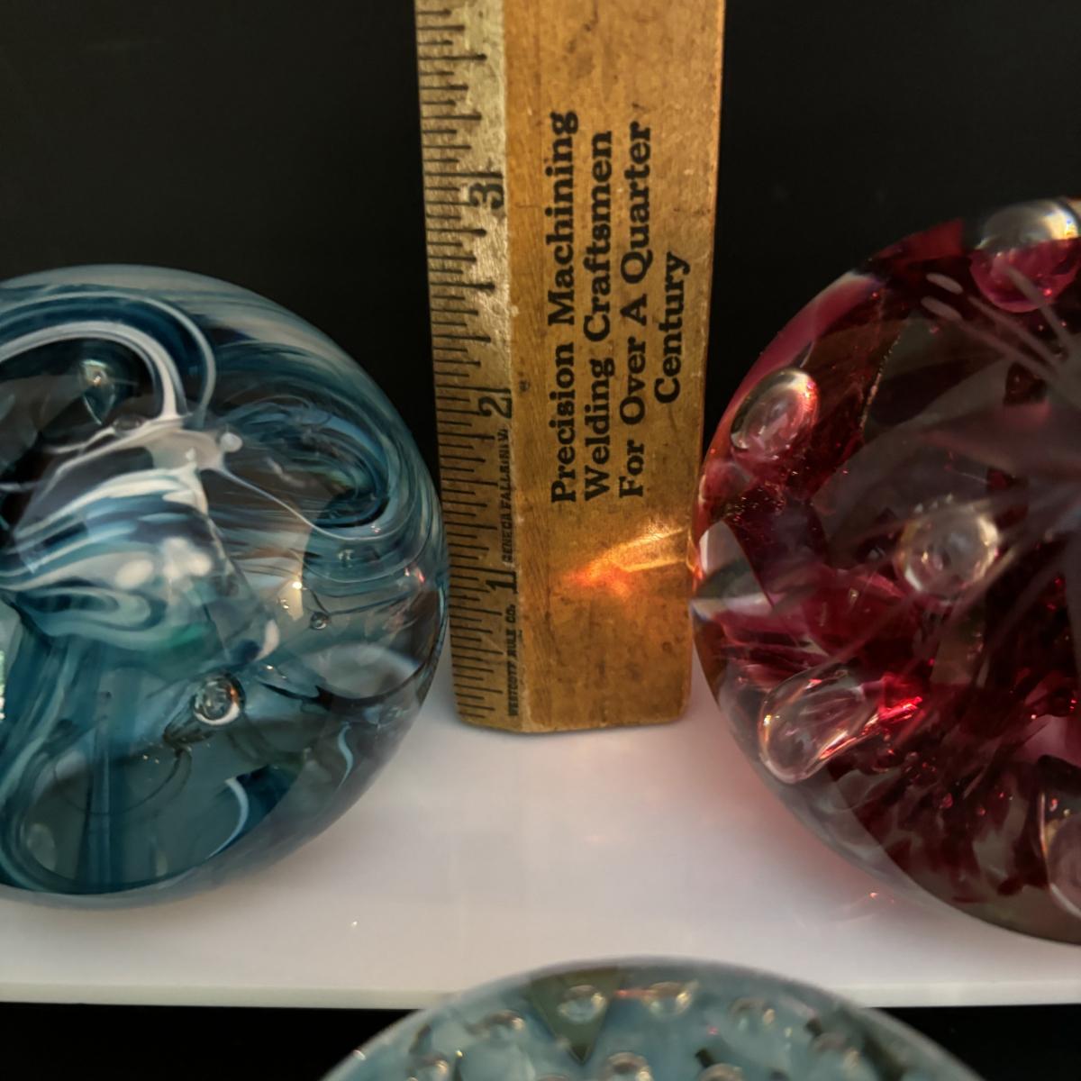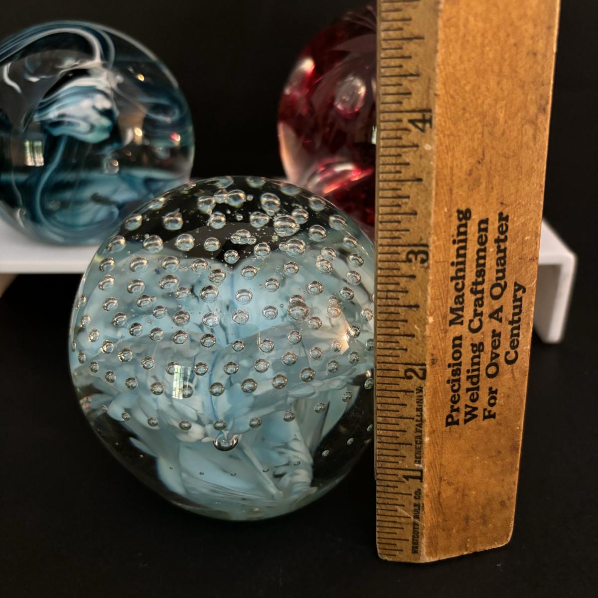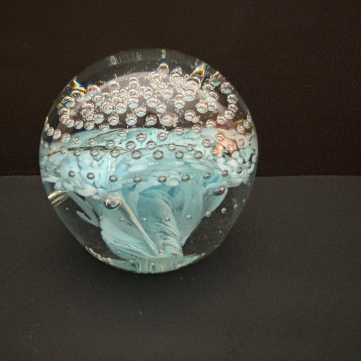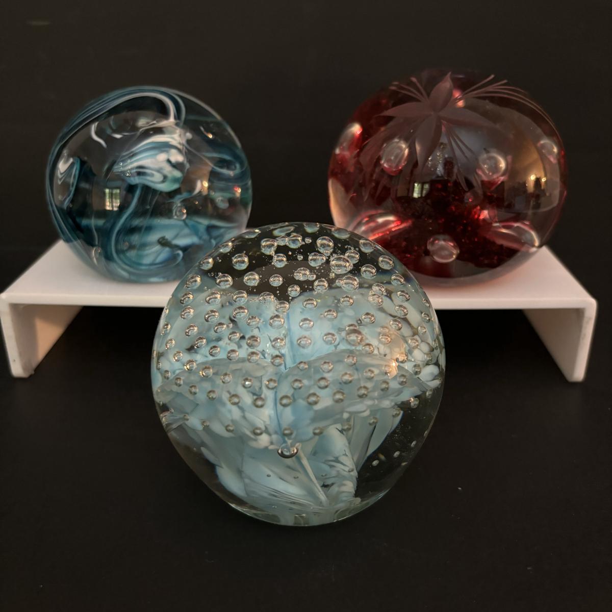 LOT 119: Joe Rice Papereweight w/Etched Floral Design, Blue Swirl Unsigned Paperweight & Light Blue Floral Swirl Unsigned Paperweight