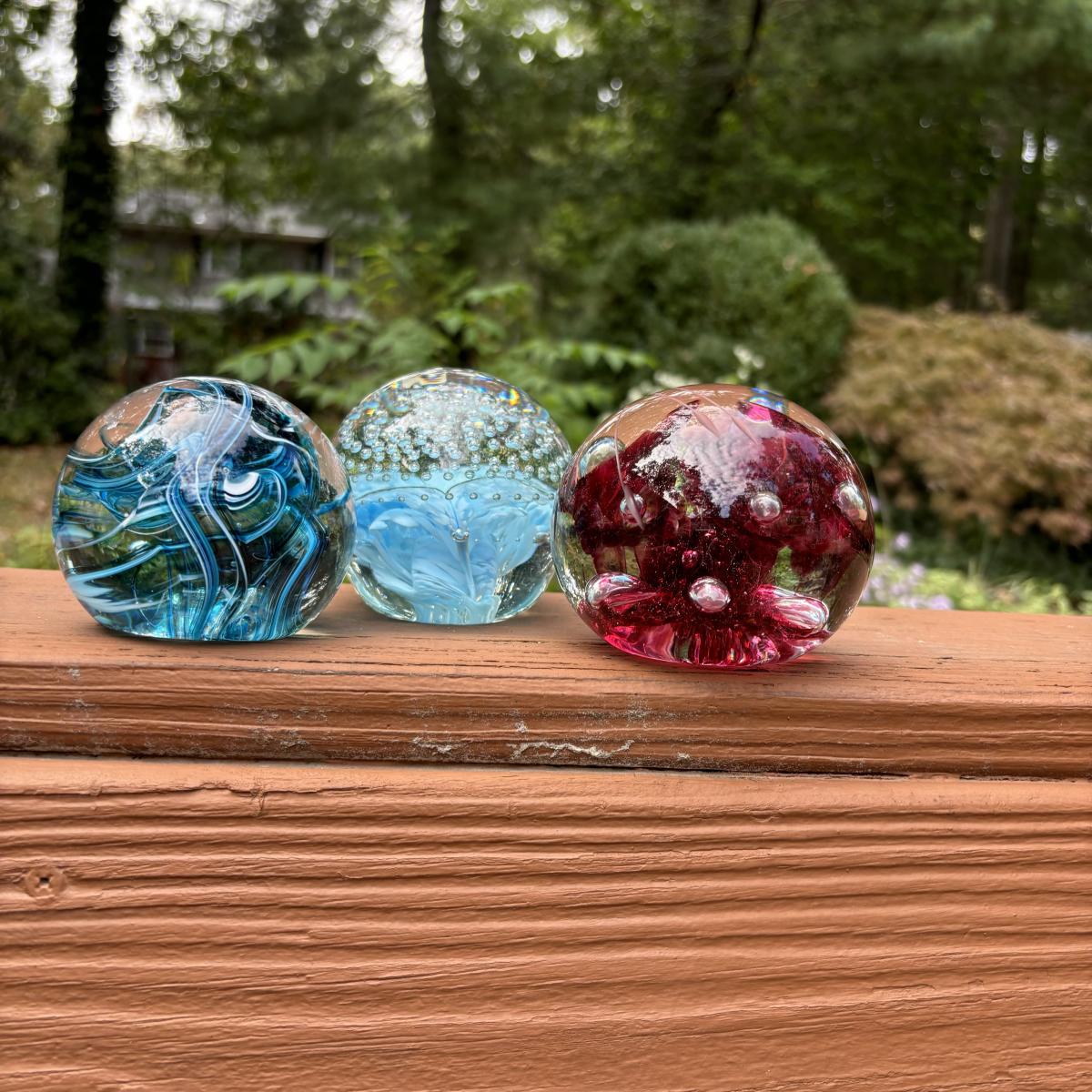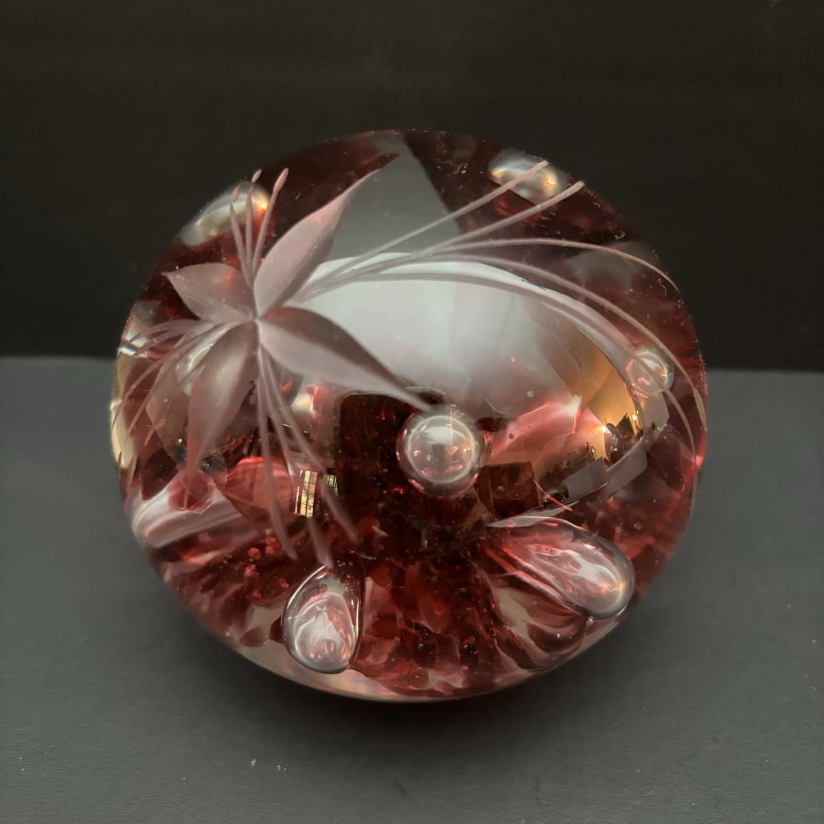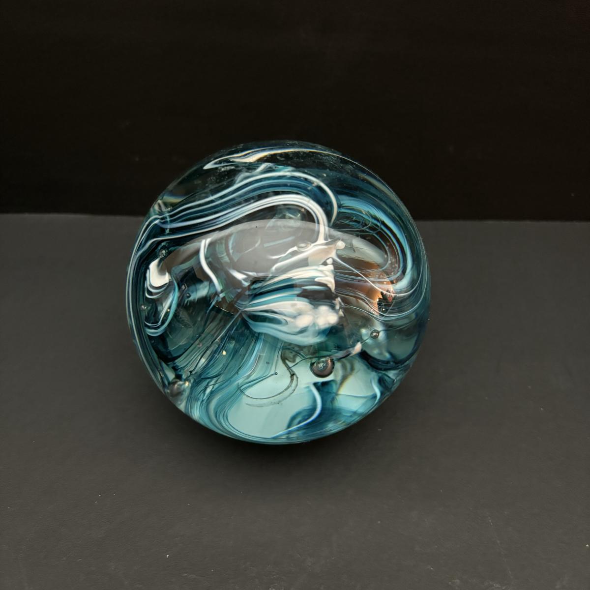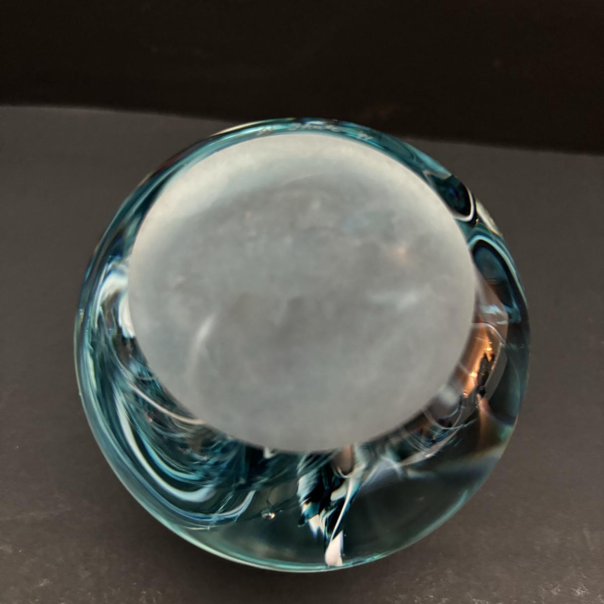 LOT 119: Joe Rice Papereweight w/Etched Floral Design, Blue Swirl Unsigned Paperweight & Light Blue Floral Swirl Unsigned Paperweight