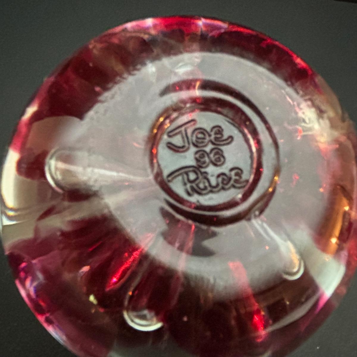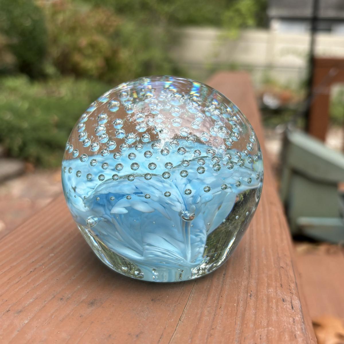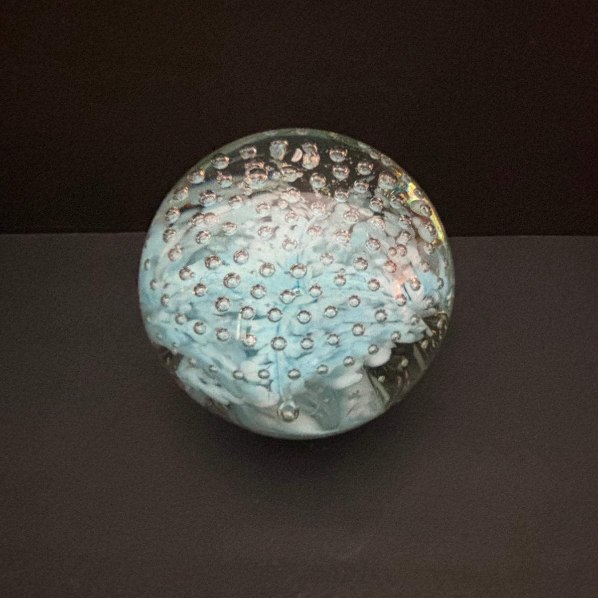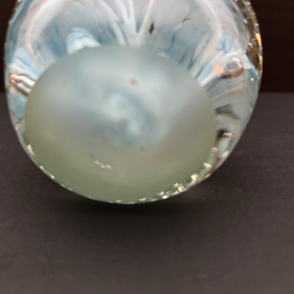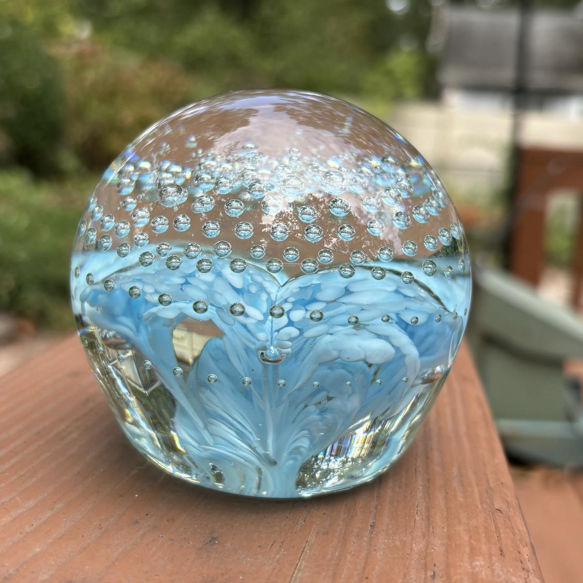 LOT 119: Joe Rice Papereweight w/Etched Floral Design, Blue Swirl Unsigned Paperweight & Light Blue Floral Swirl Unsigned Paperweight