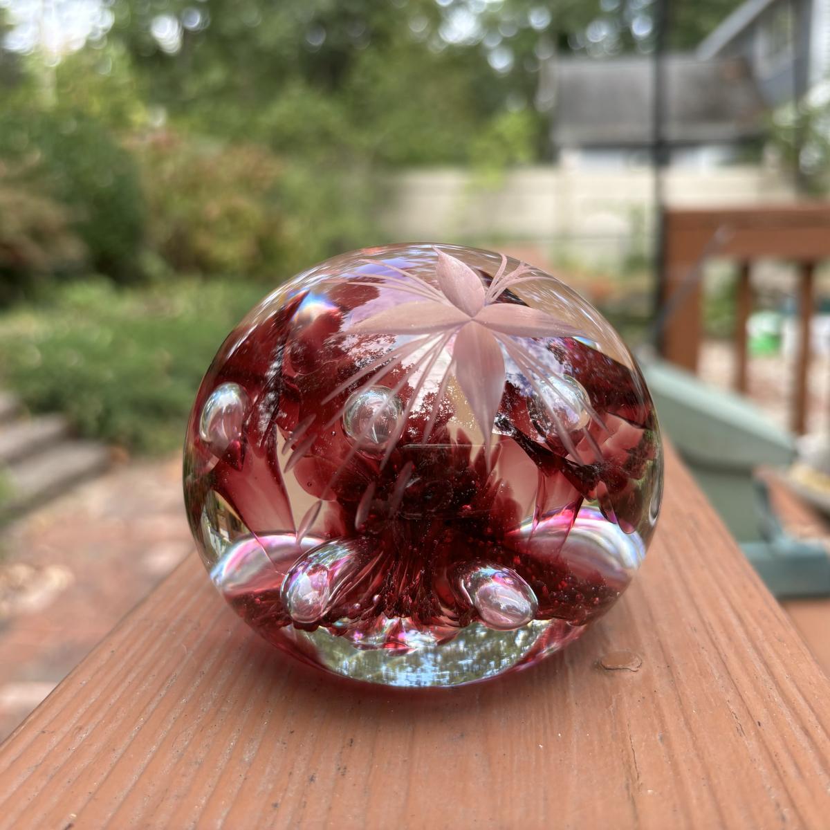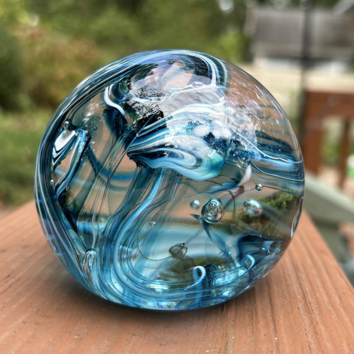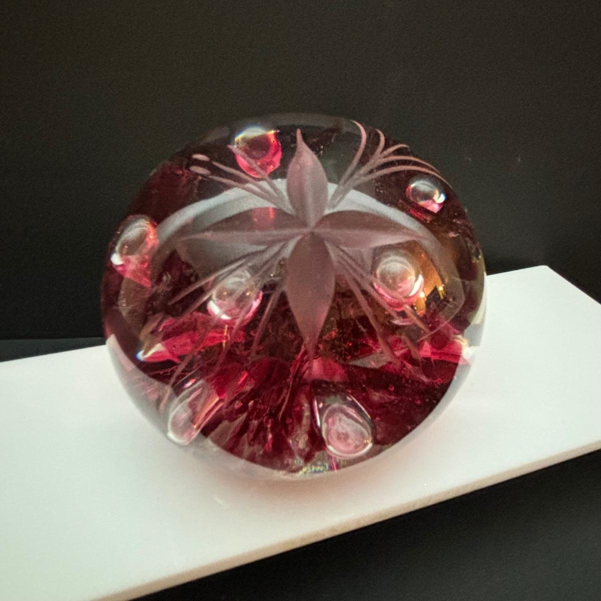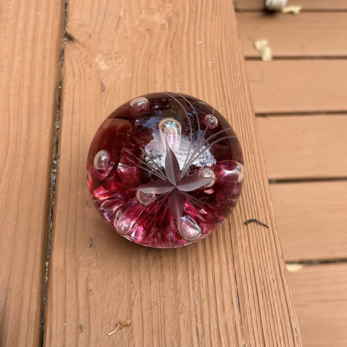 LOT 119: Joe Rice Papereweight w/Etched Floral Design, Blue Swirl Unsigned Paperweight & Light Blue Floral Swirl Unsigned Paperweight