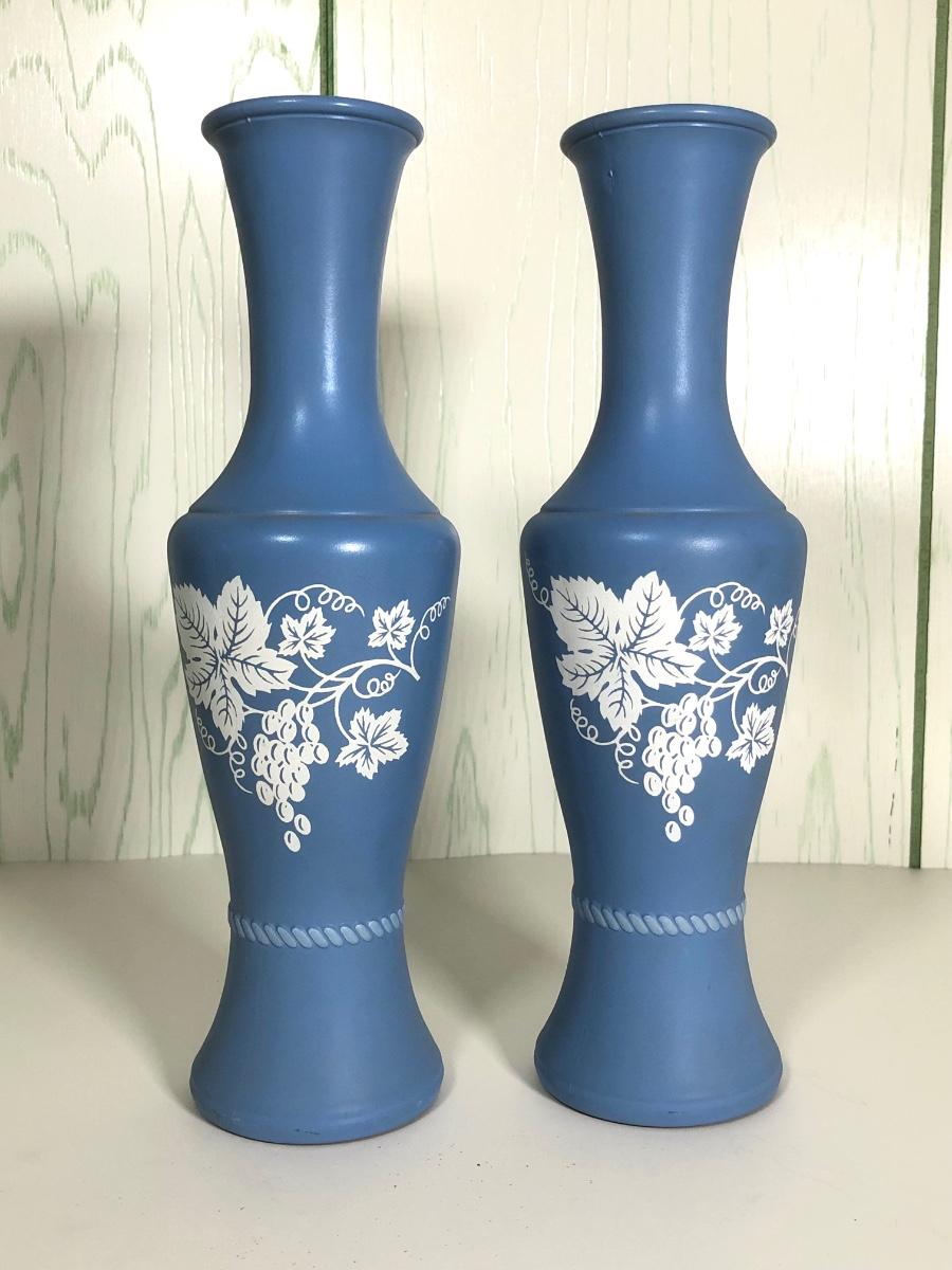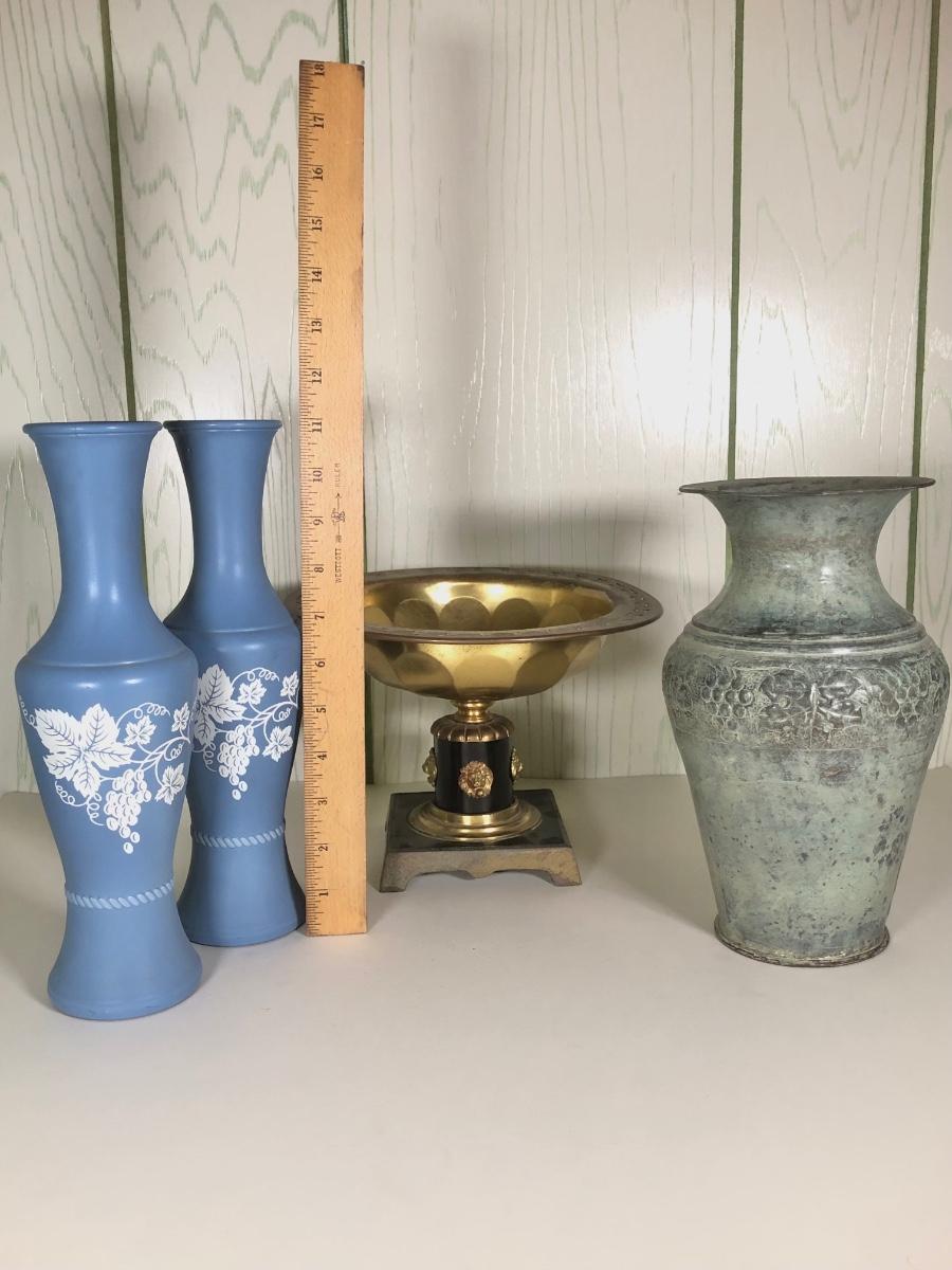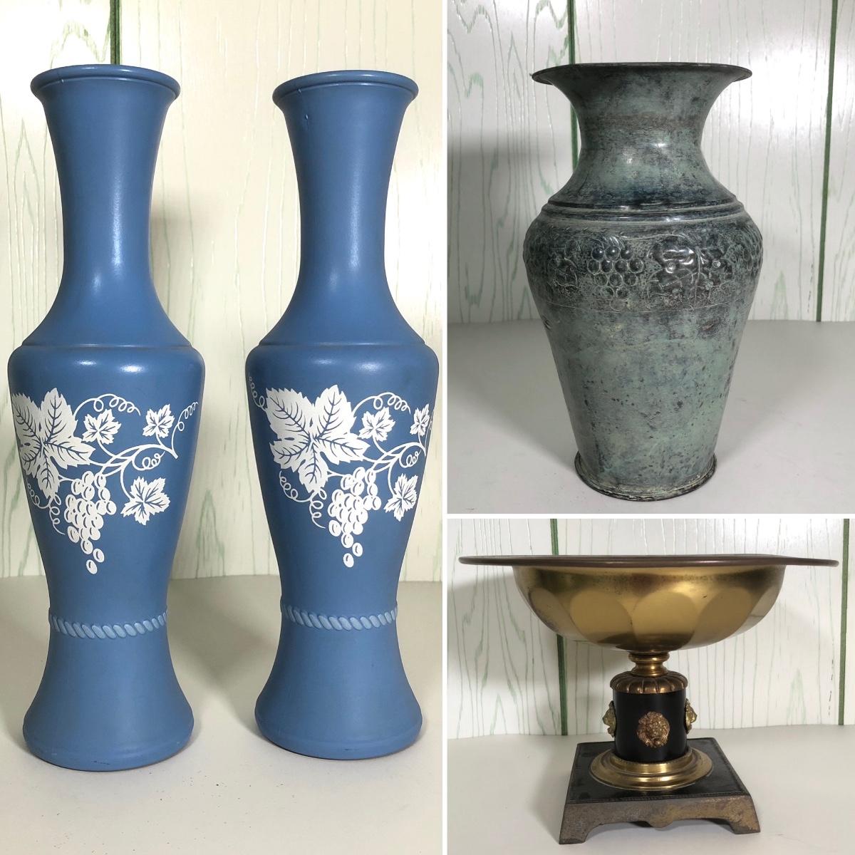 LOT 43: Vintage Blue & White Vases, Lion Head Pedestal Compote & More
