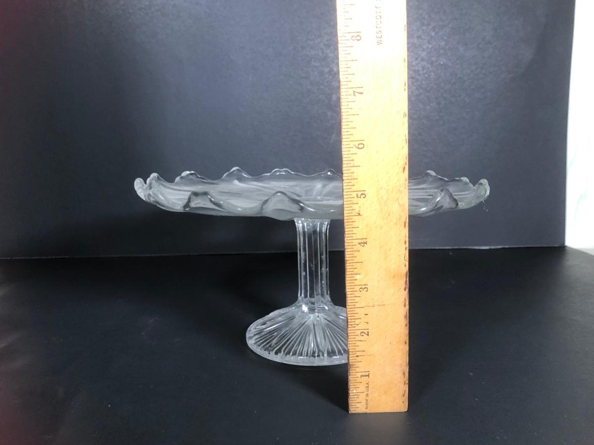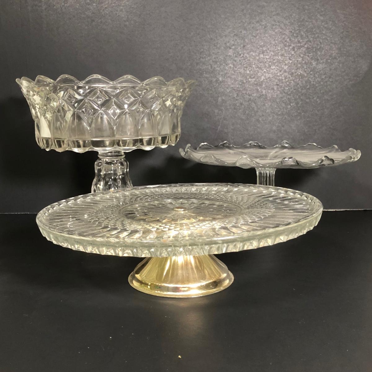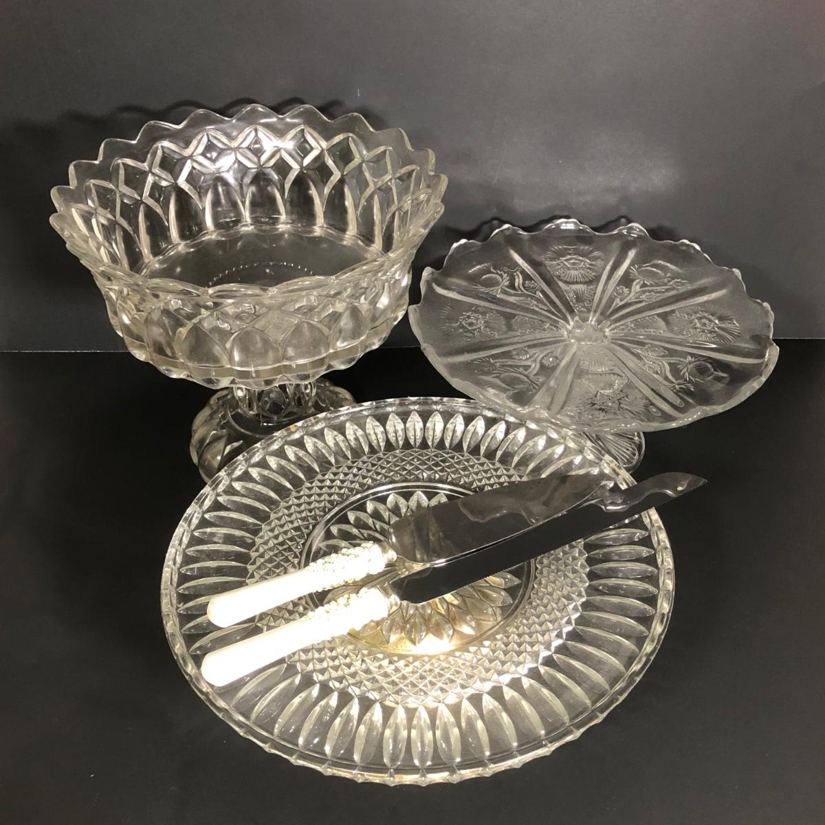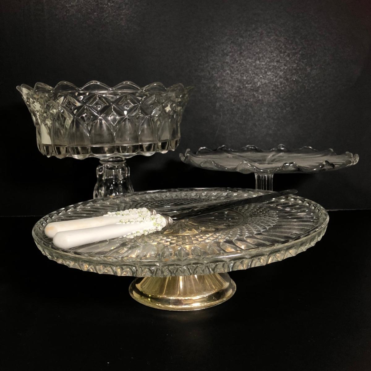 LOT 46: Vintage Glass Cake Plates, Trifle Dish & Sheffield Cake Serving Set w/ Sculpted Floral Handles