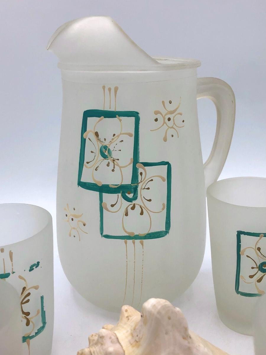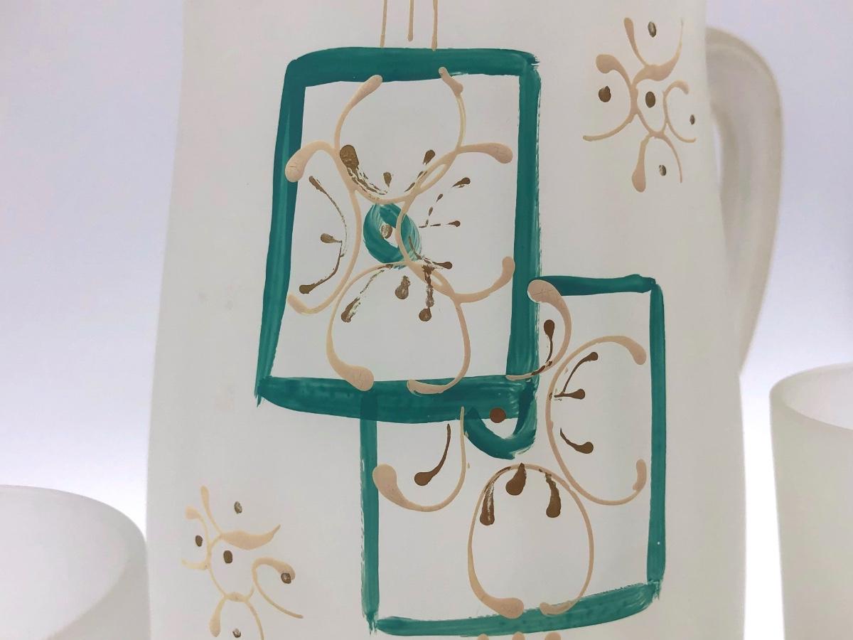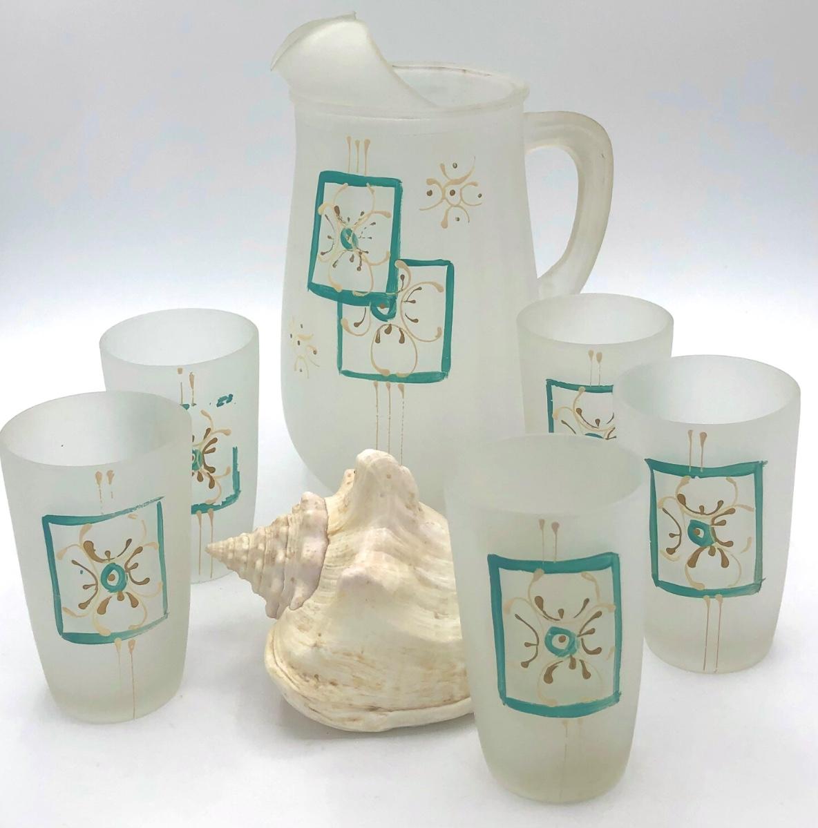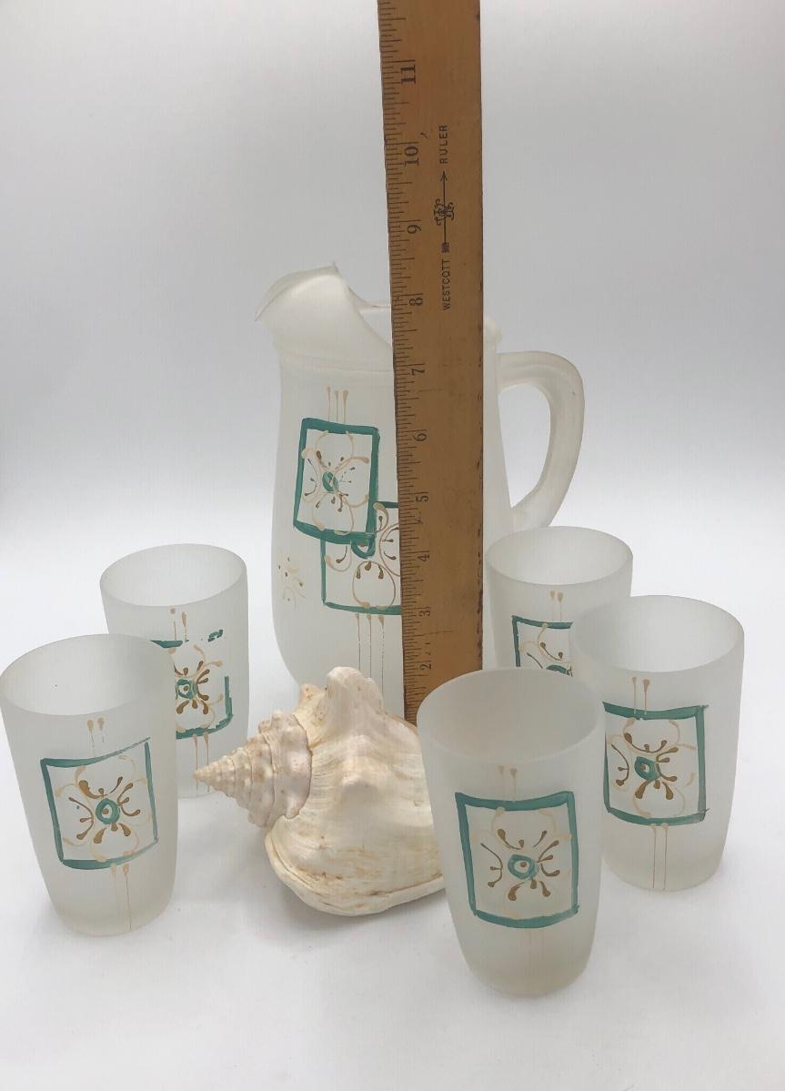 LOT 49: Hand-Painted MCM Teal and White Frosted Glass Pitcher w/ 5 Matching Glasses and a Conch Shell