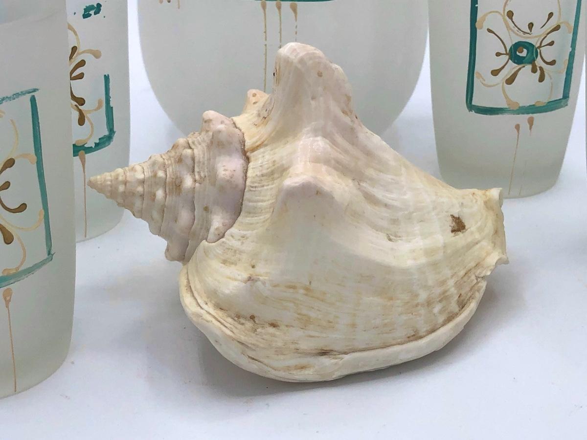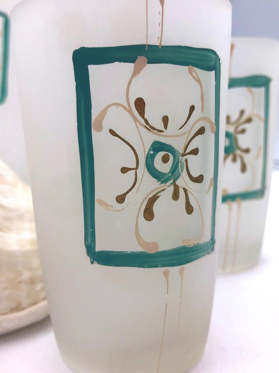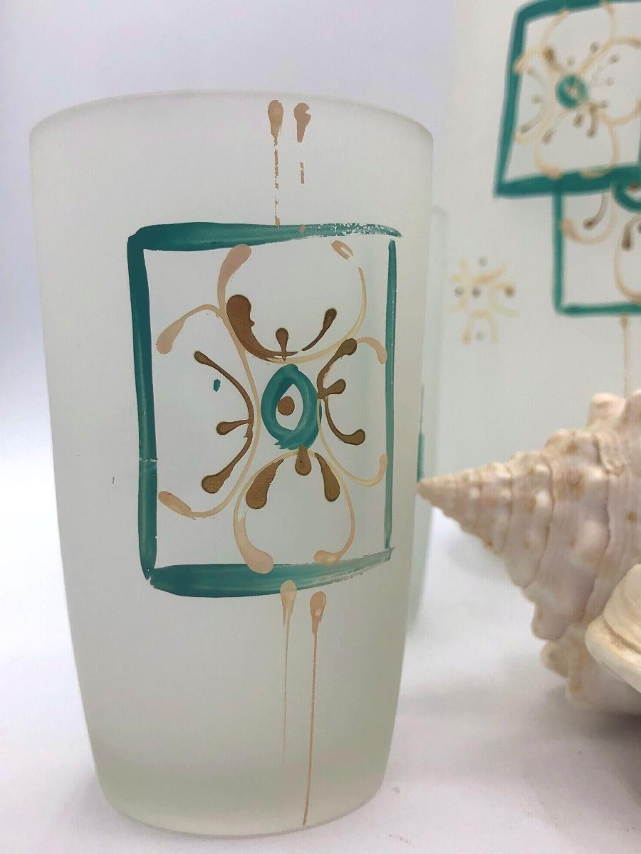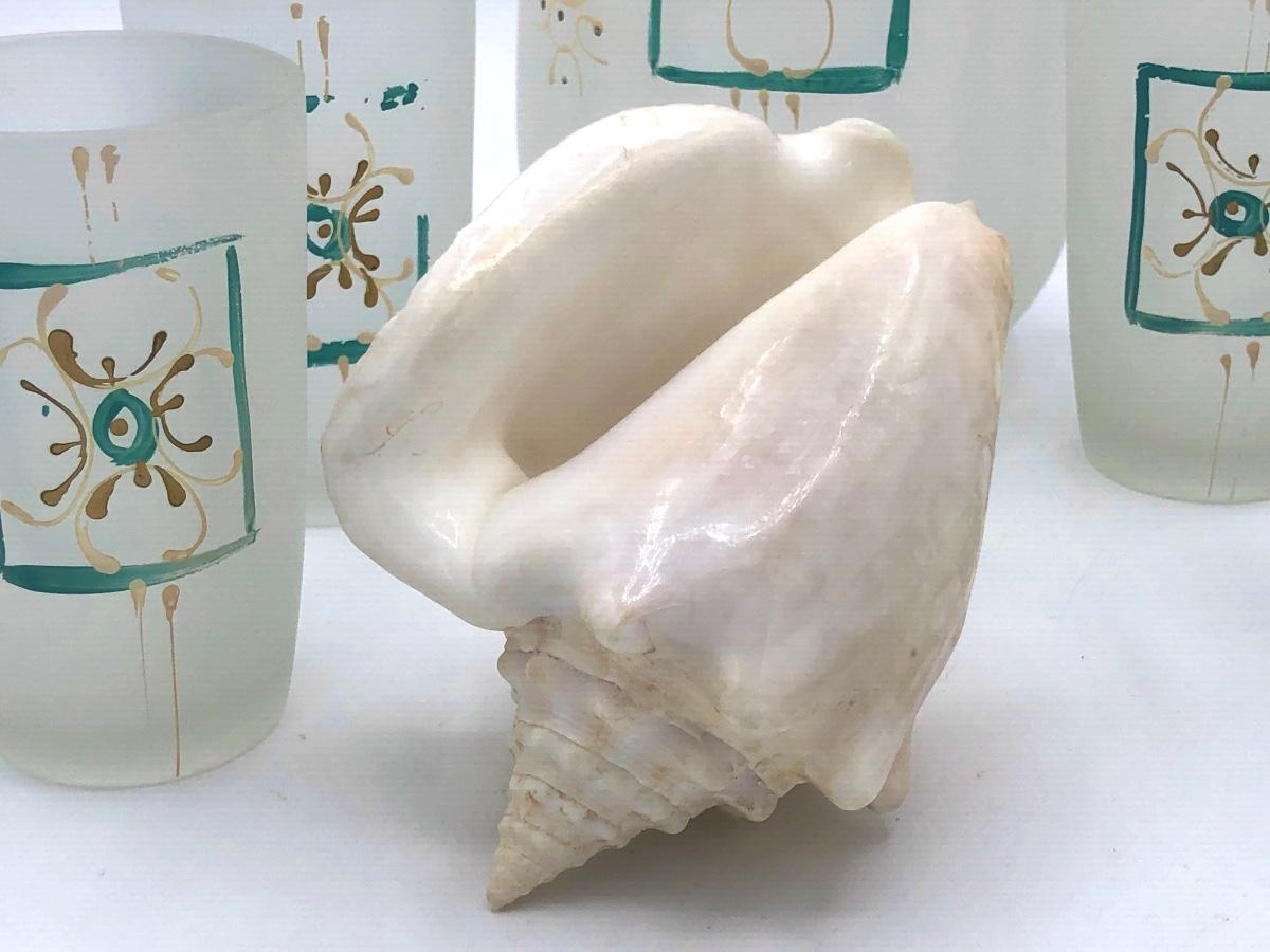 LOT 49: Hand-Painted MCM Teal and White Frosted Glass Pitcher w/ 5 Matching Glasses and a Conch Shell