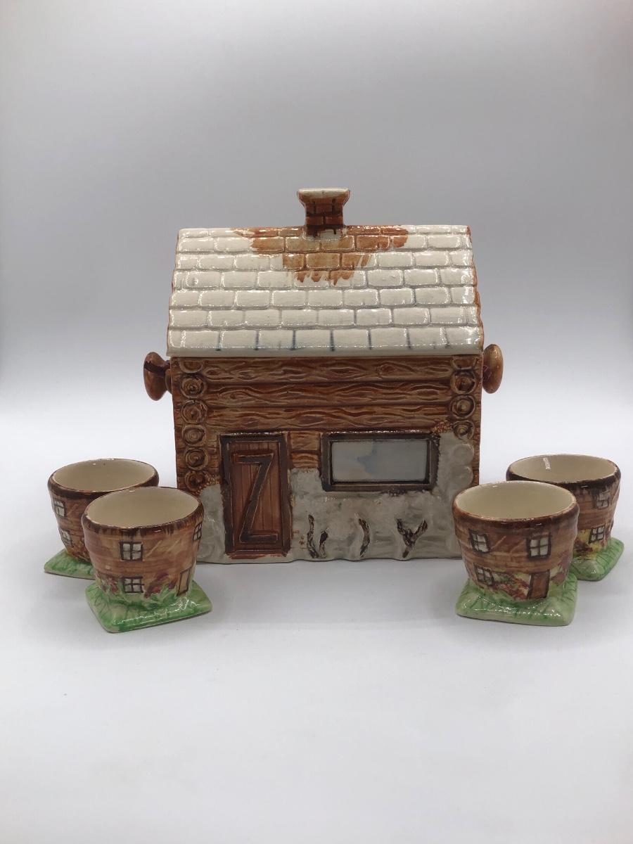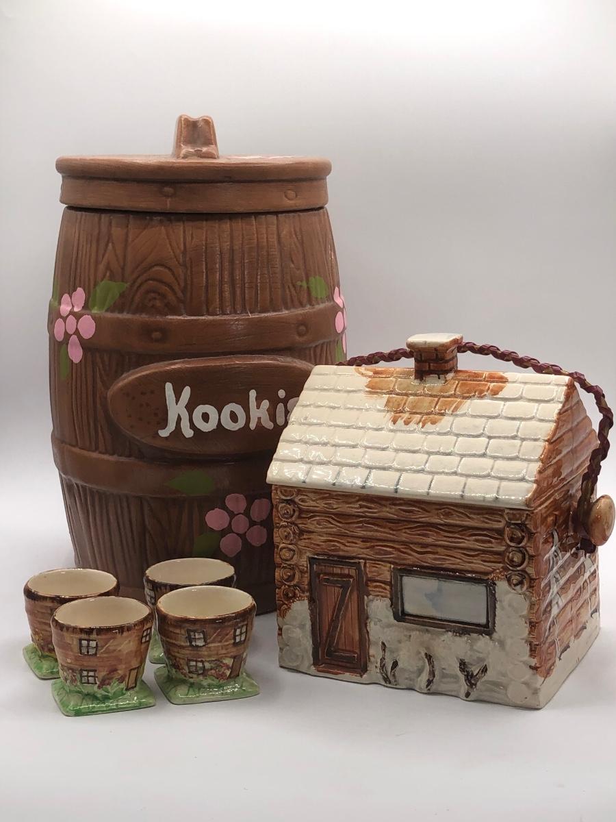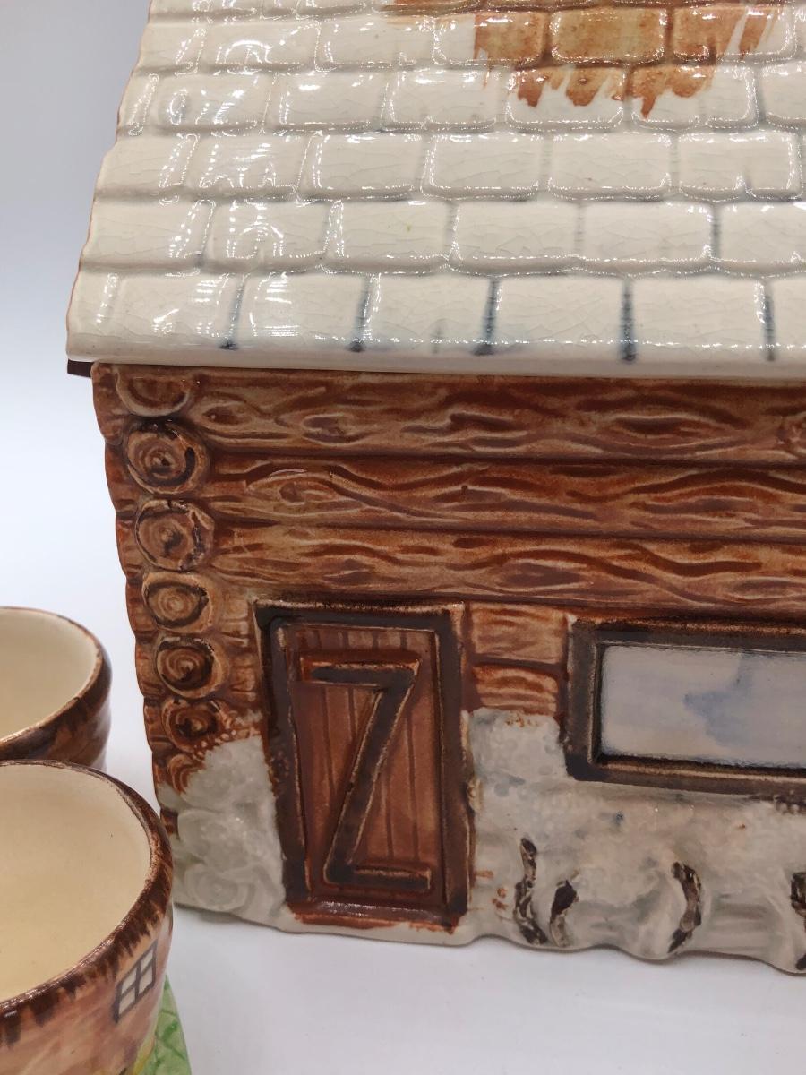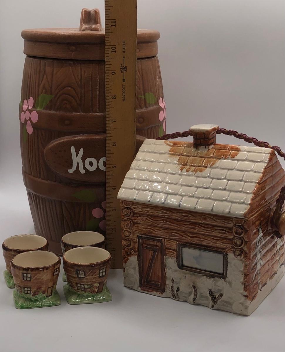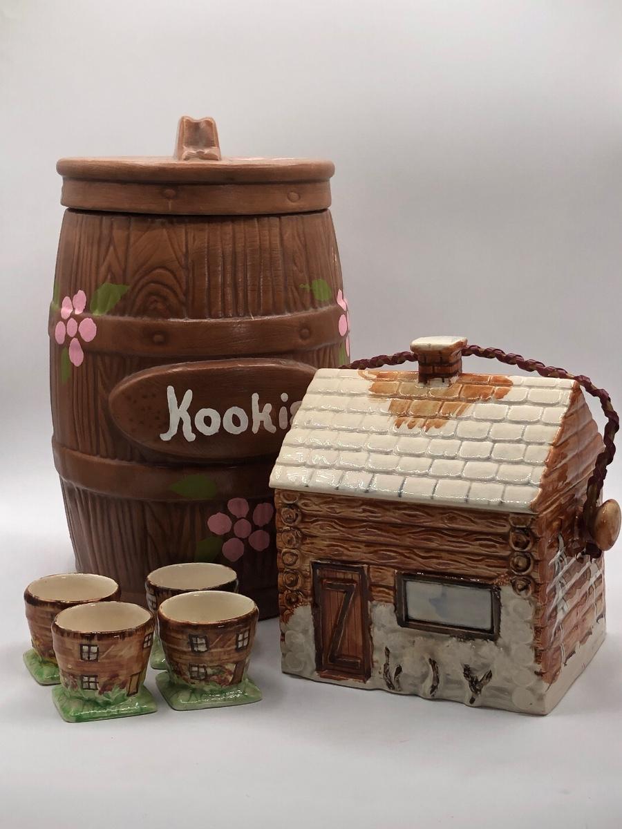 LOT 50: Price Bros England Log Cabin Biscuit Barrel w/ 4 Matching Snack Cups & Ceramic "Kookies" Barrel Shaped Cookie Jar
