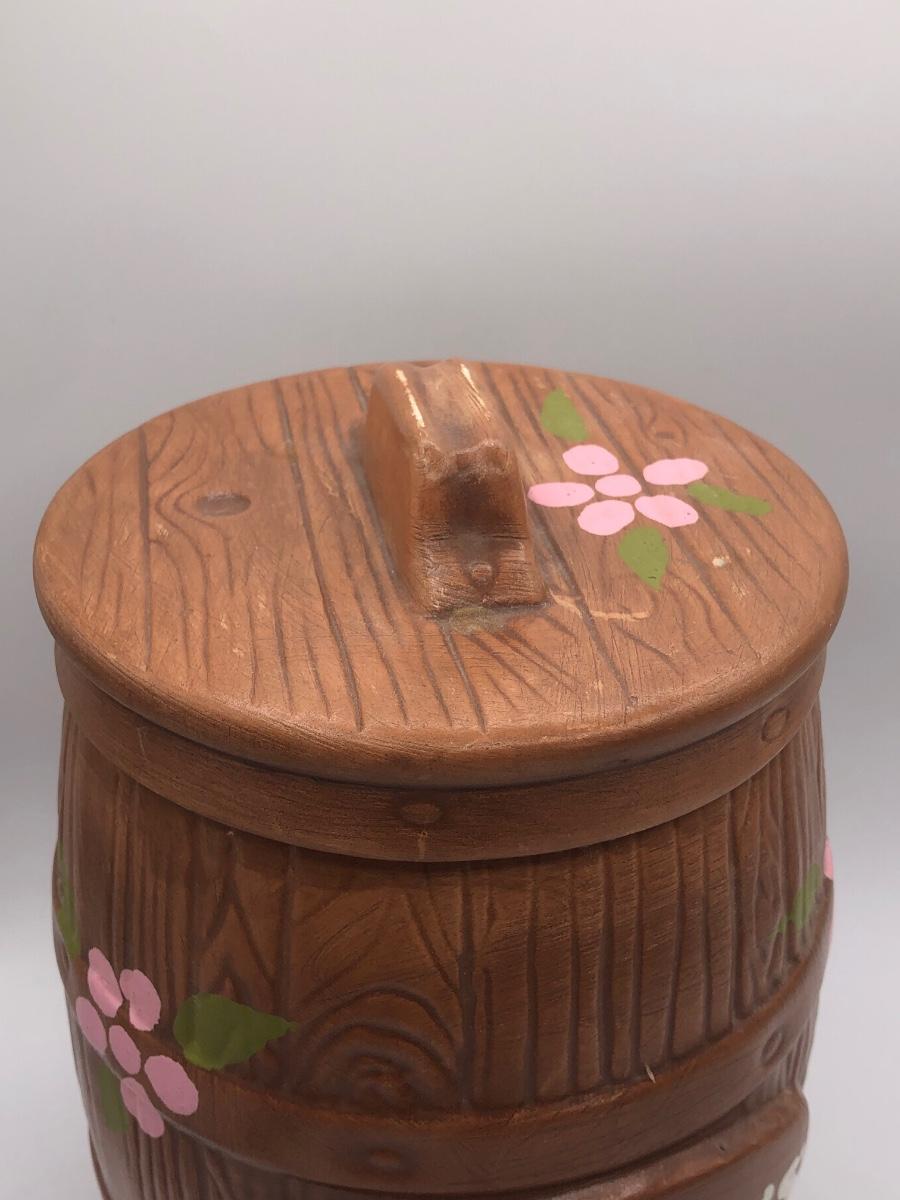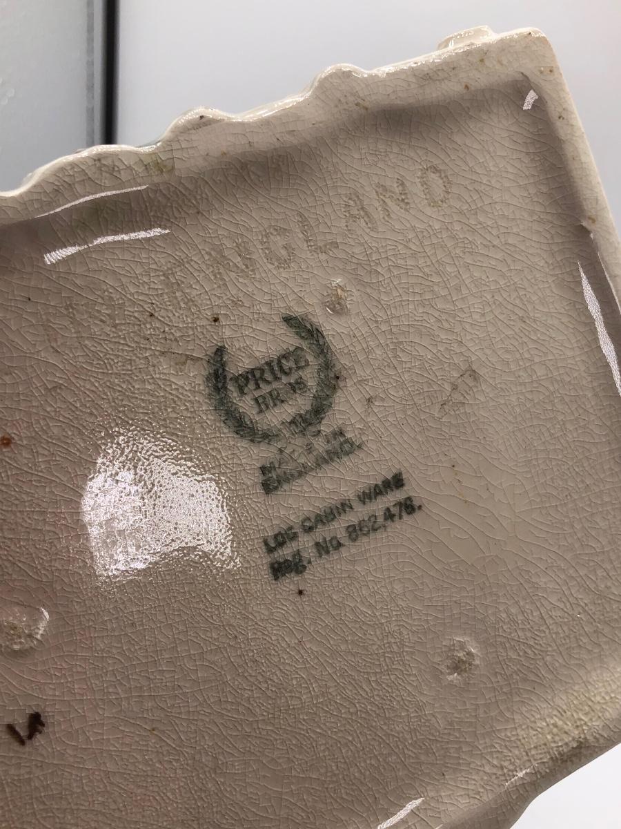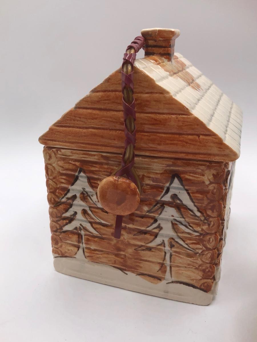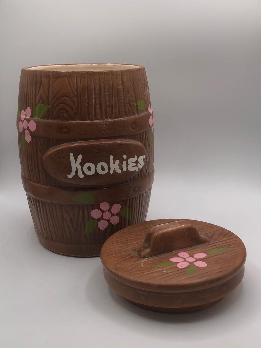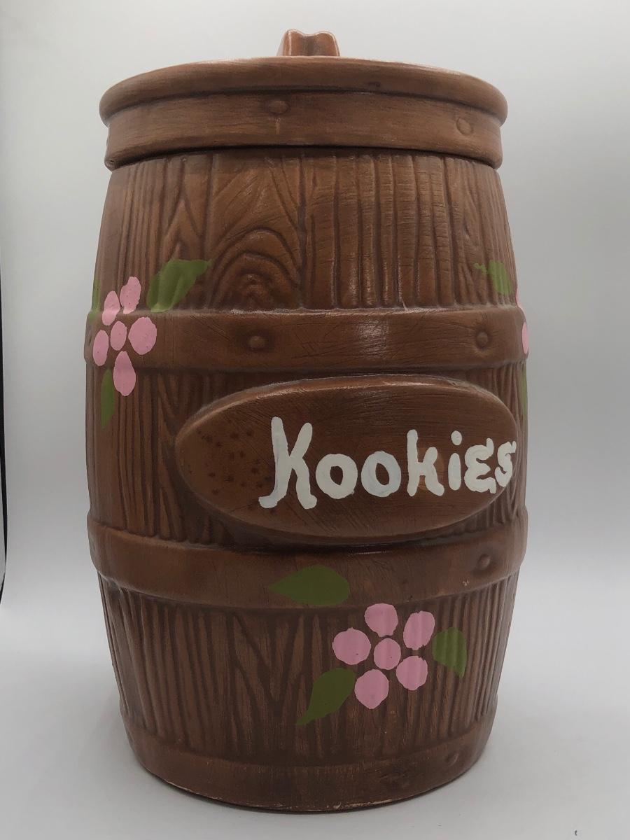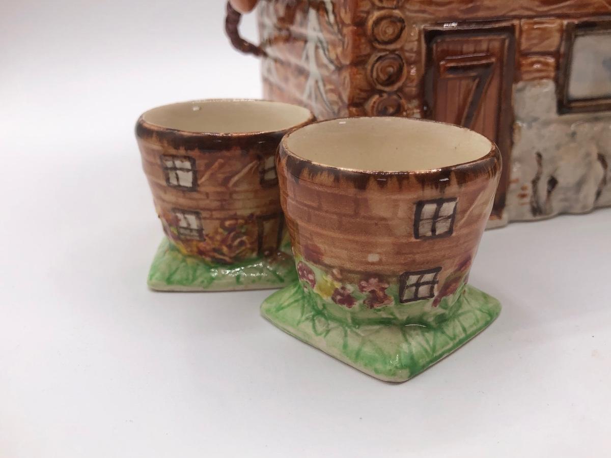 LOT 50: Price Bros England Log Cabin Biscuit Barrel w/ 4 Matching Snack Cups & Ceramic "Kookies" Barrel Shaped Cookie Jar