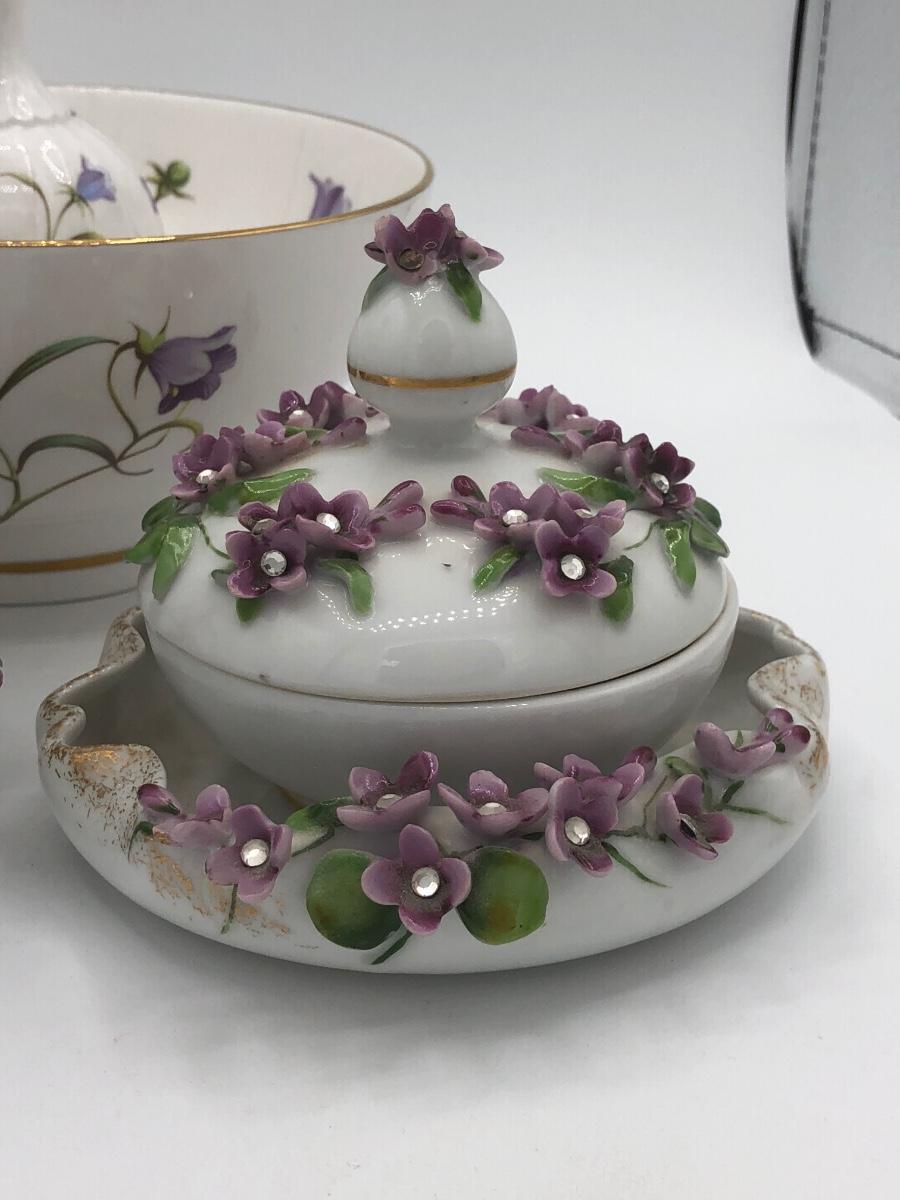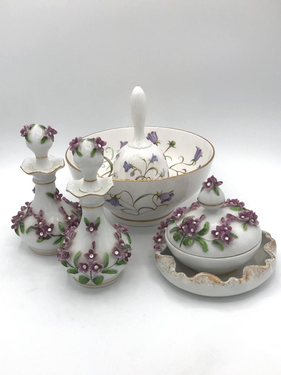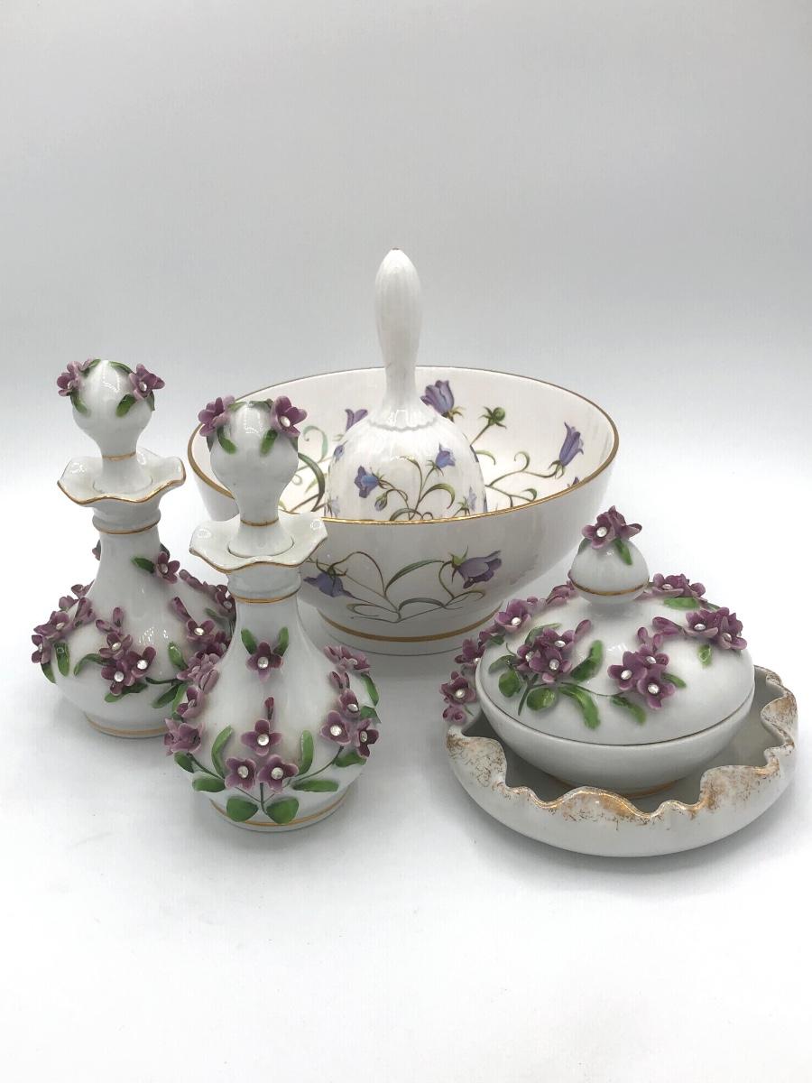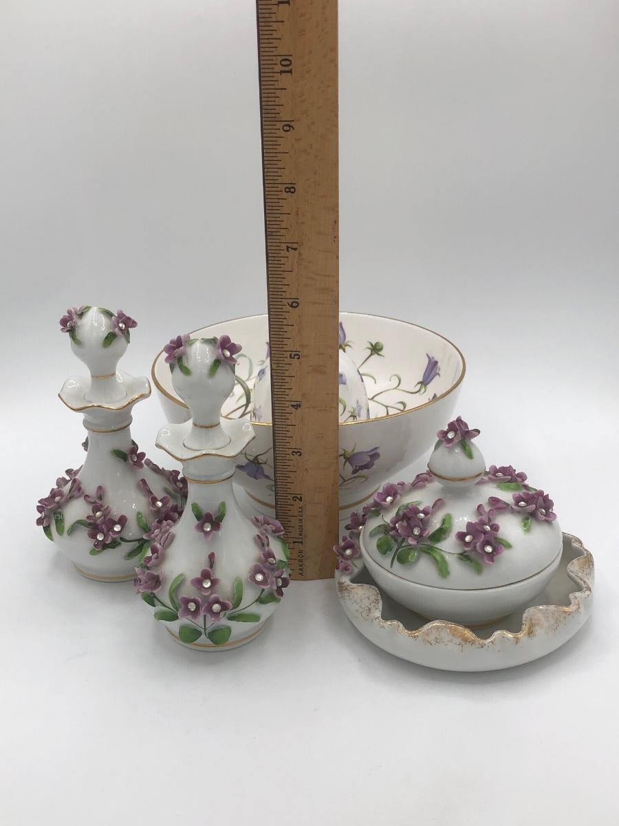 LOT 51: Vintage Lefton Violet Vanity Set & Purple Flower Spode Bowl and Bell