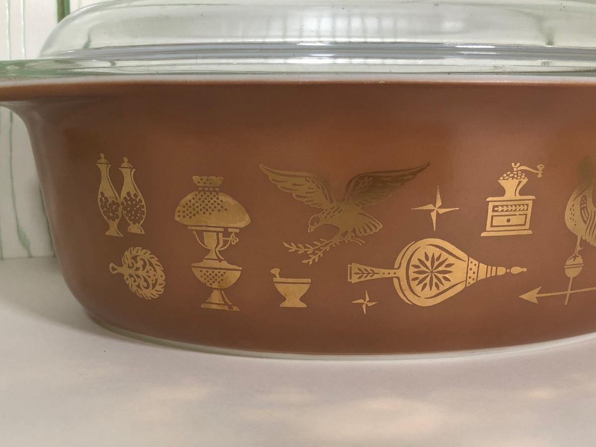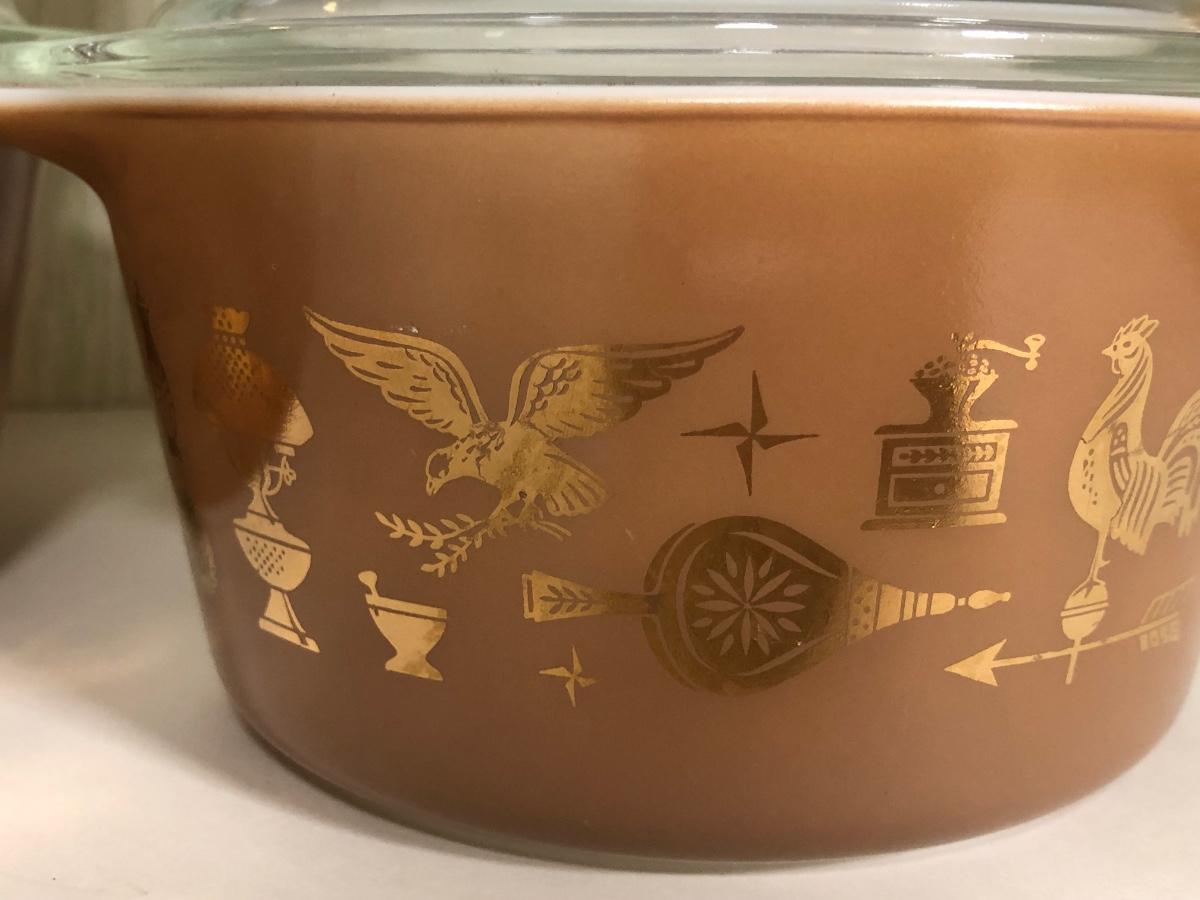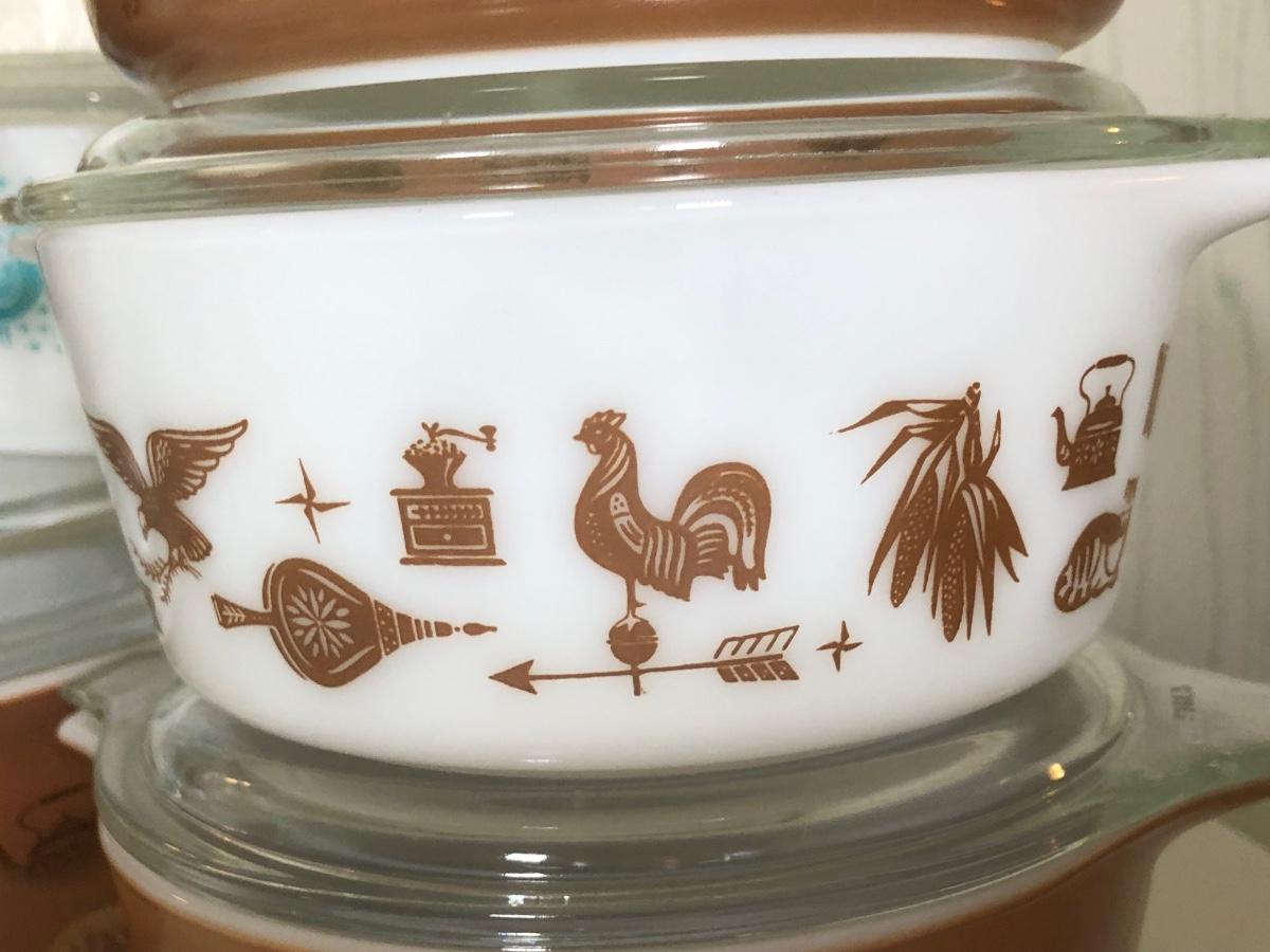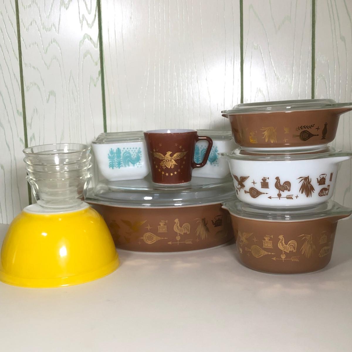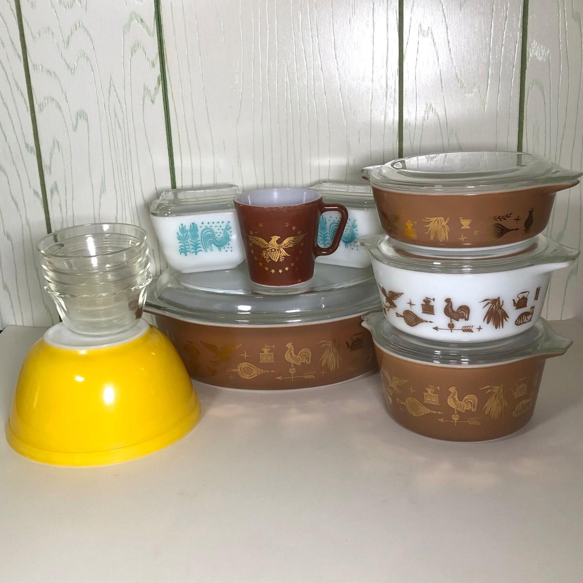 LOT 53: Vintage Pyrex Baking Dishes - Early American Pattern, Eagle Liberty Mug & Amish Butterprint Pattern