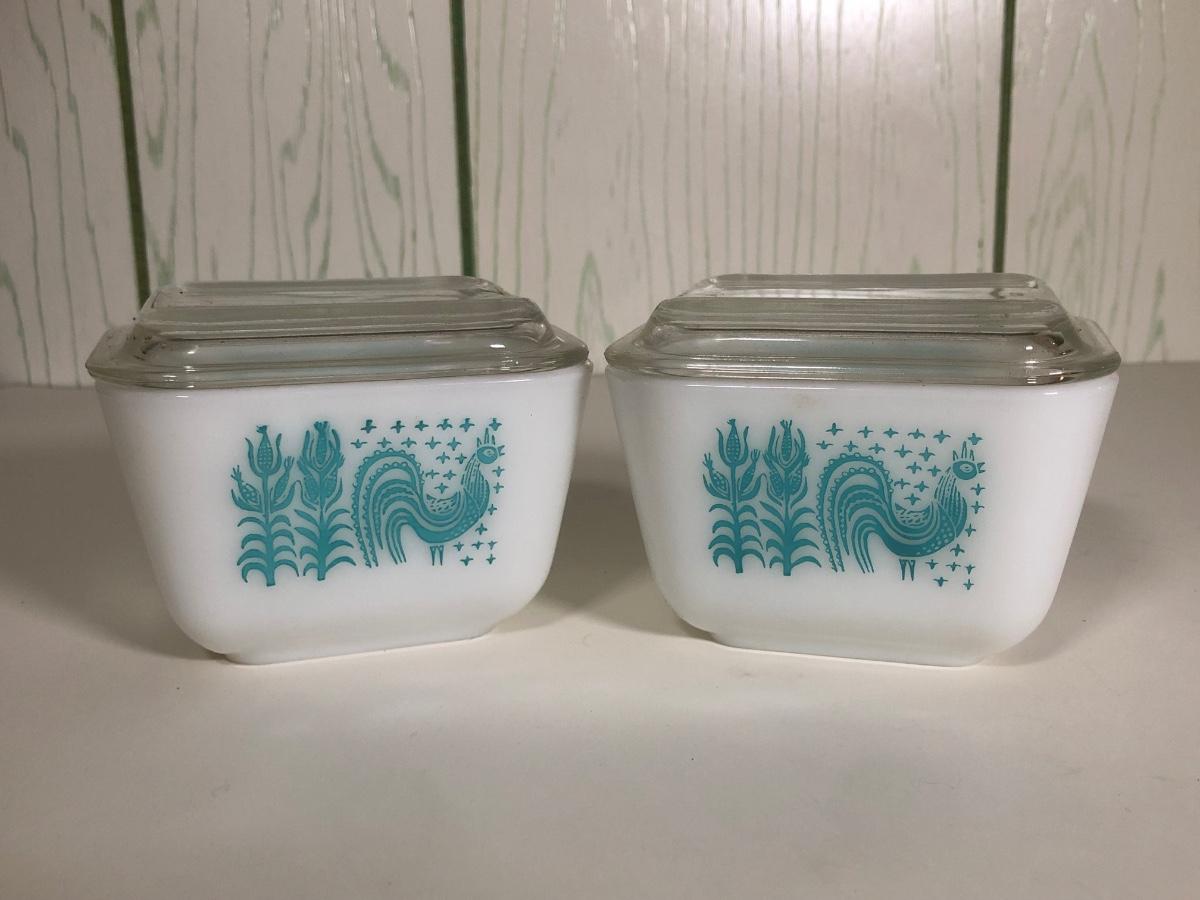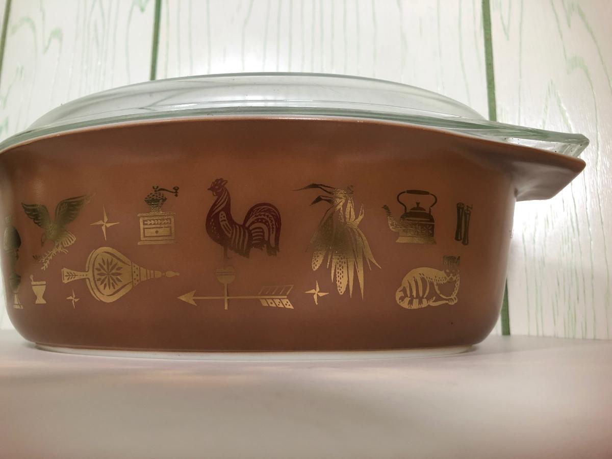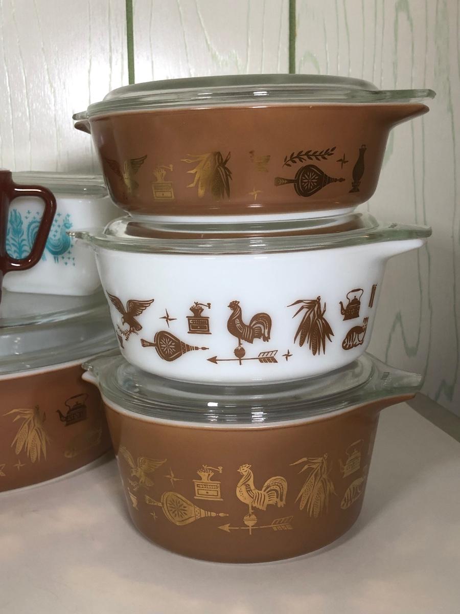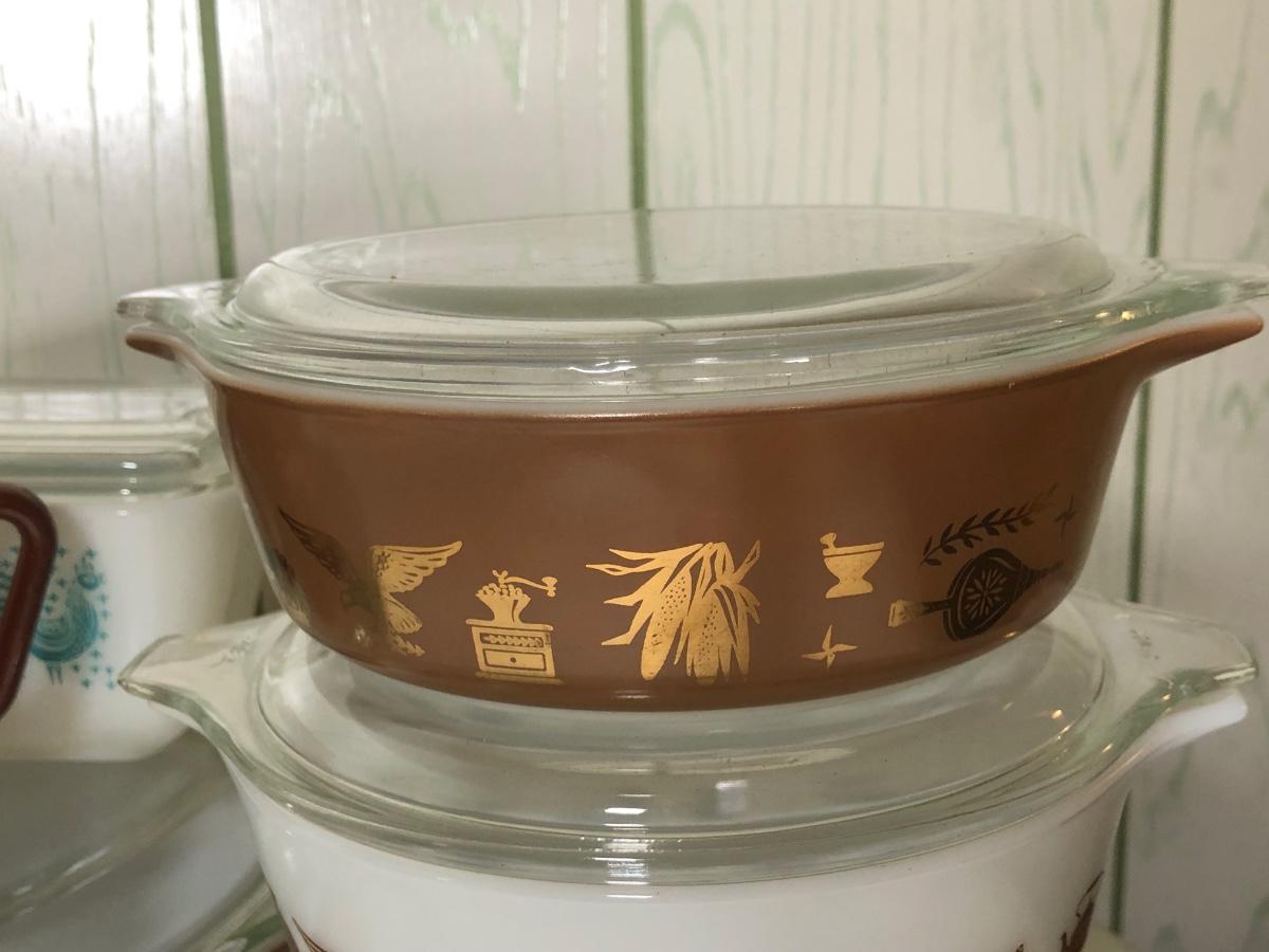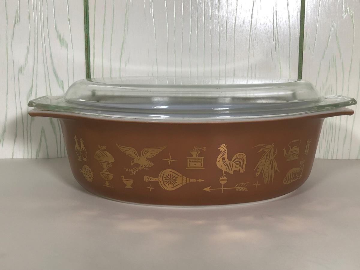 LOT 53: Vintage Pyrex Baking Dishes - Early American Pattern, Eagle Liberty Mug & Amish Butterprint Pattern