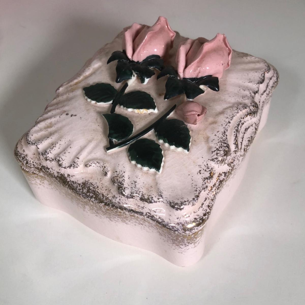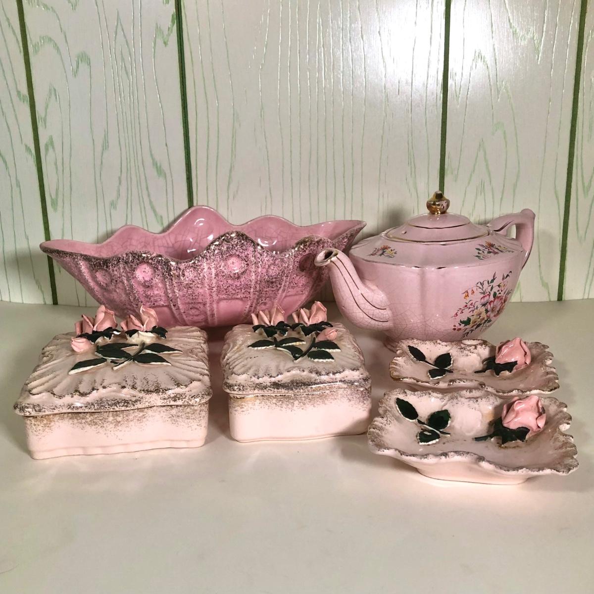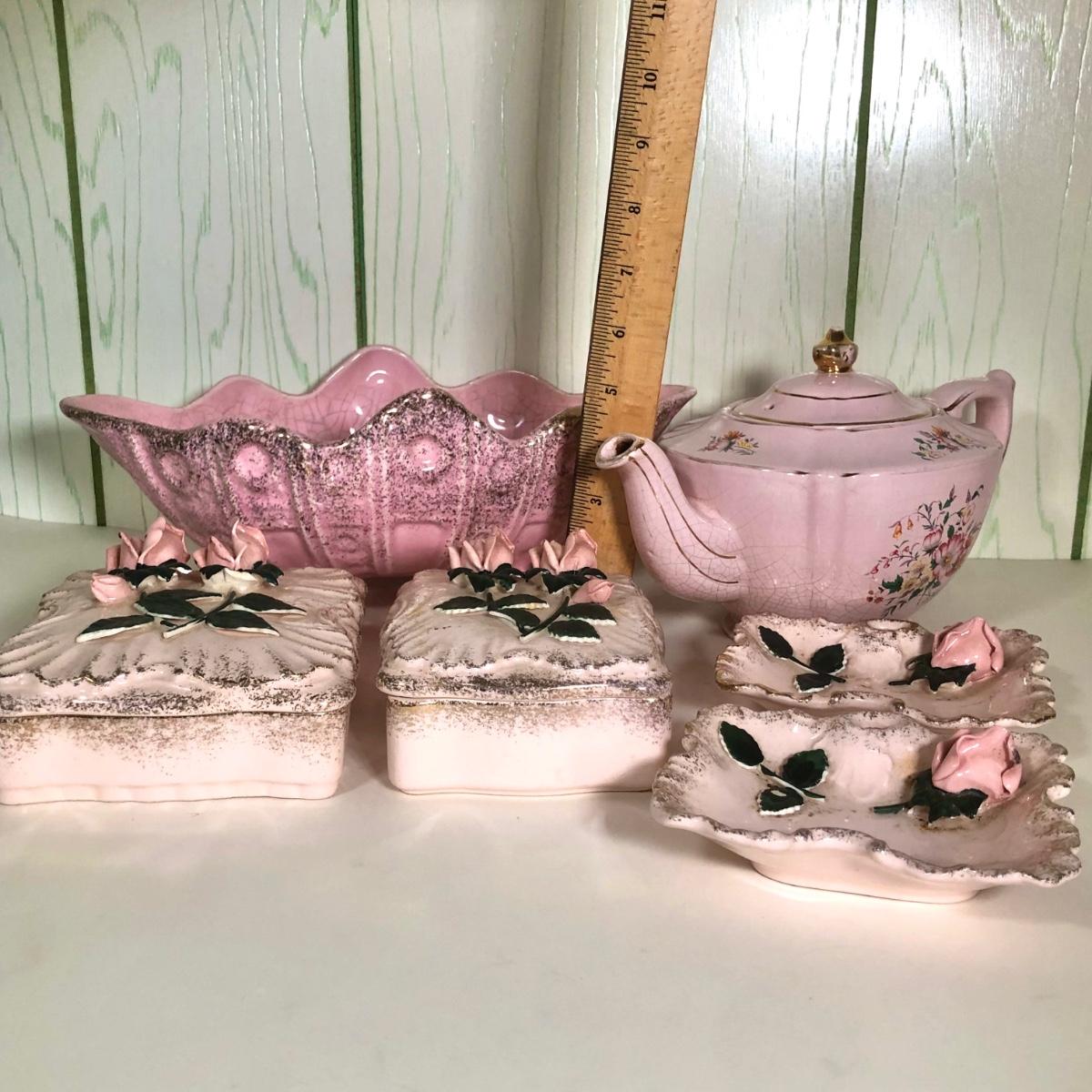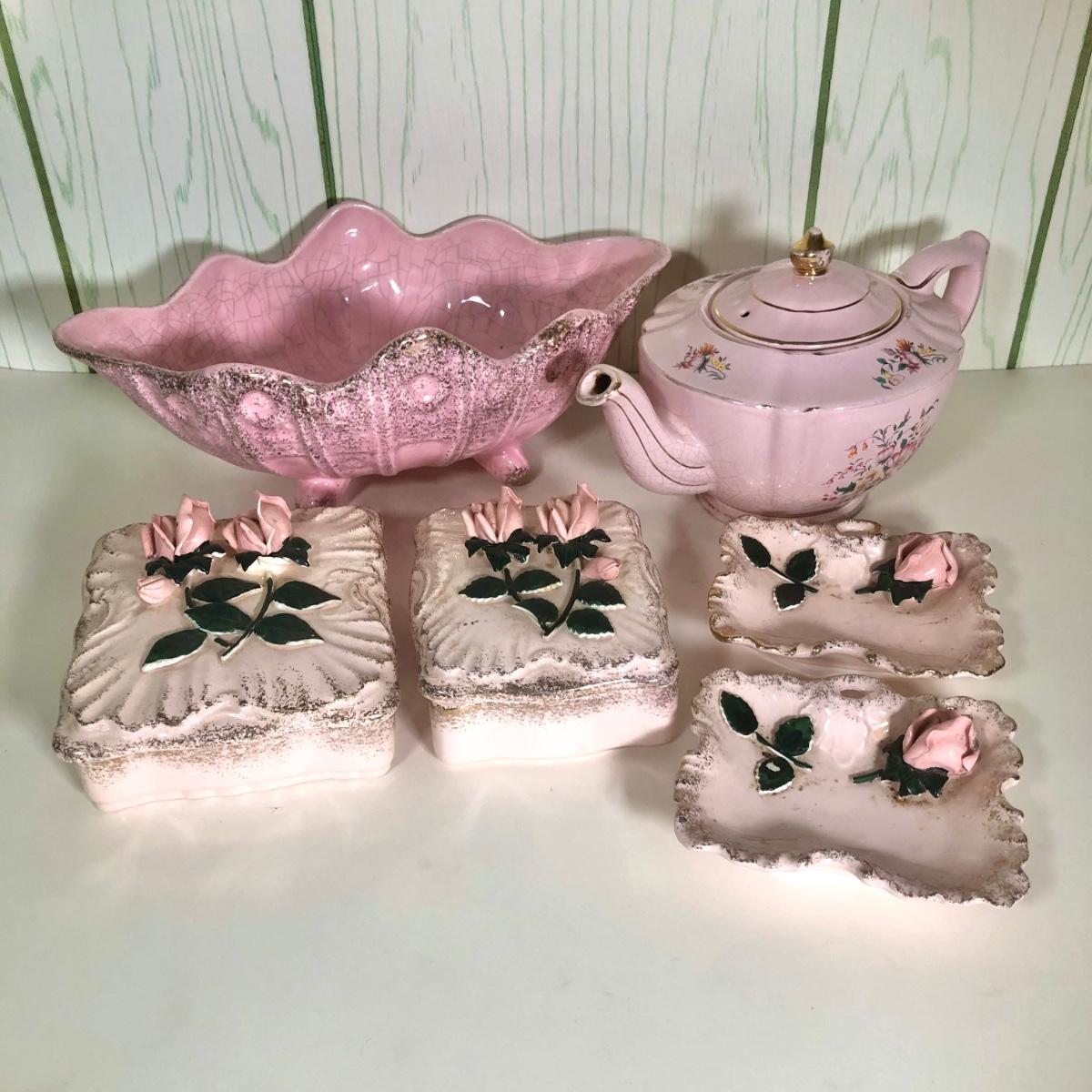 LOT 55: Vintage Pink Collection - Lefton Rose Trinket / Jewelry / Keepsake Boxes, Sadler Teapot & Large Open Mouth Vase