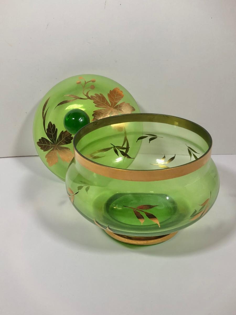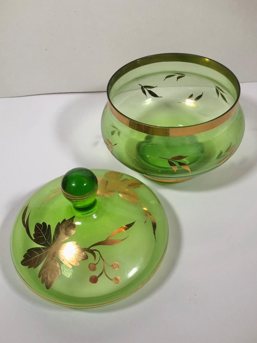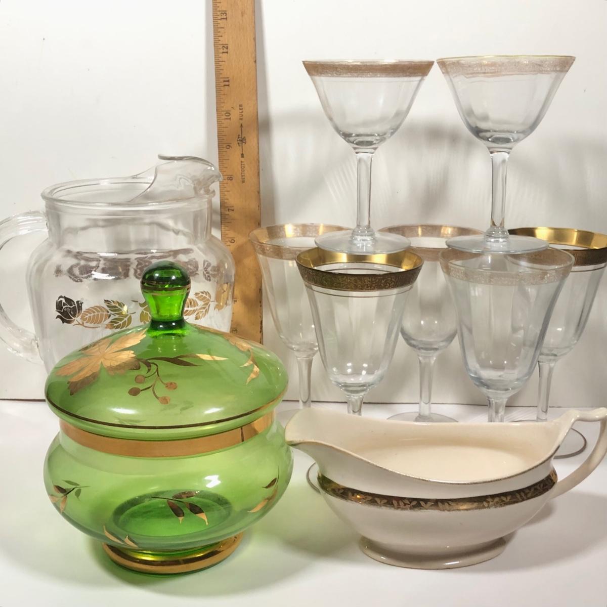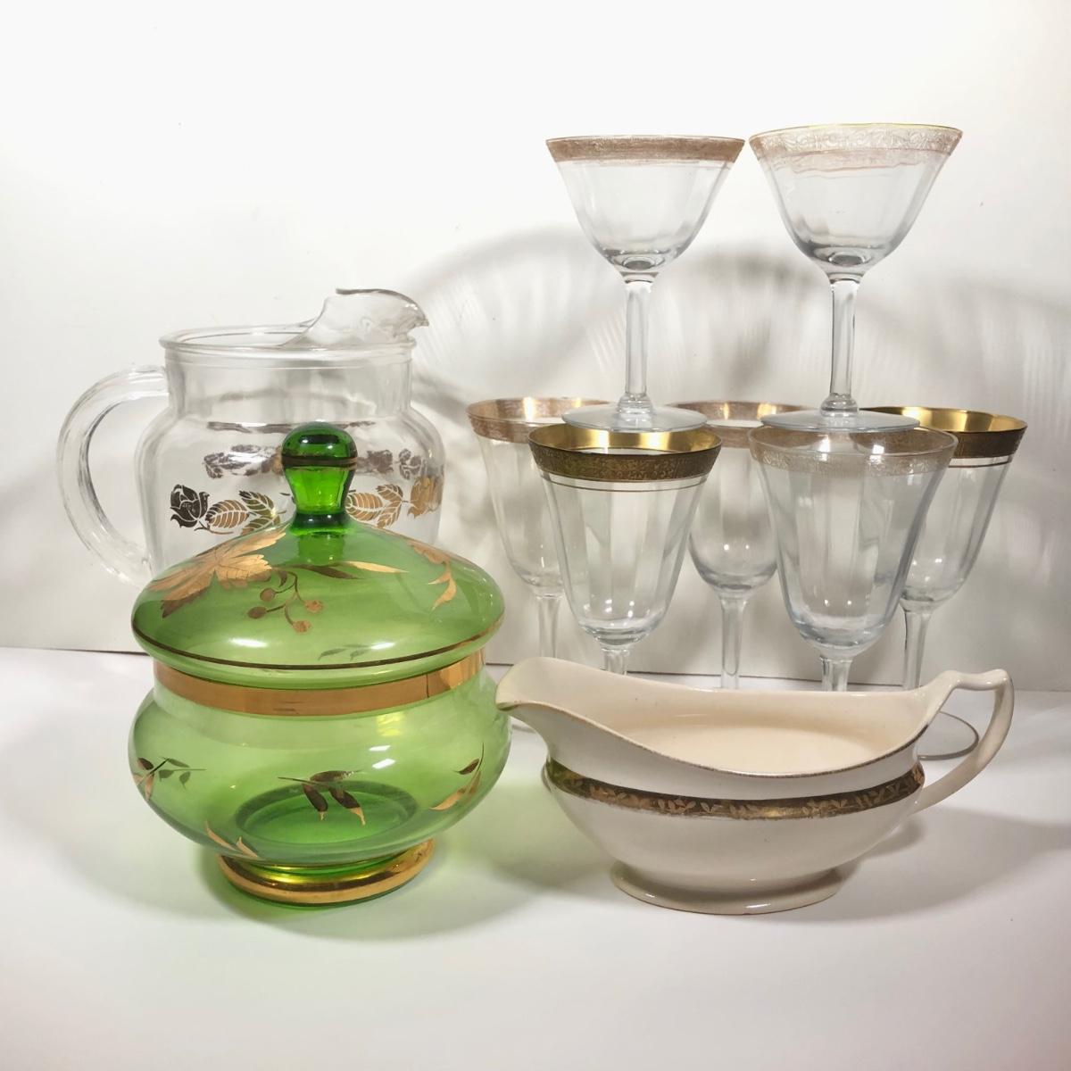 LOT 59: The Etched Design S P Co USA 14K Gold Decorated Gravy Boat, Gold Rimmed Stemware, Gold Leaf Pitcher & Green and Gold Candy Bowl
