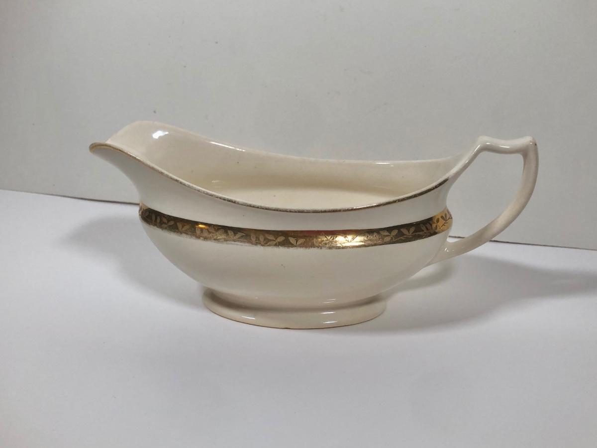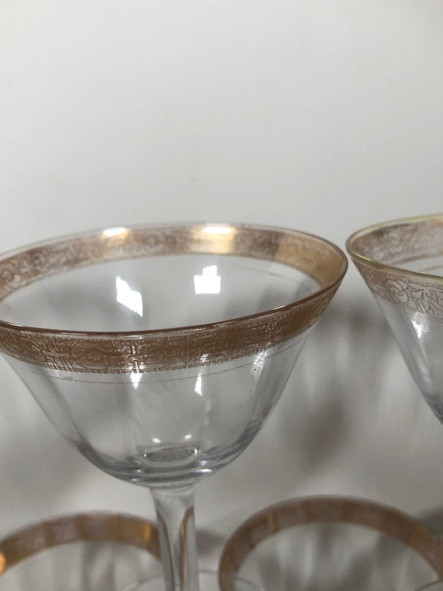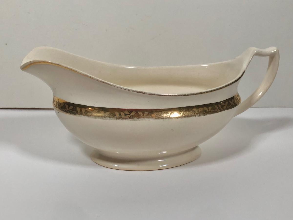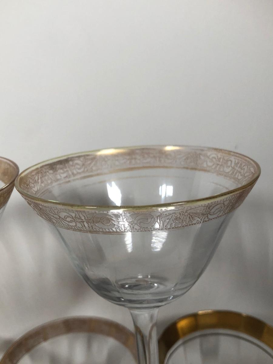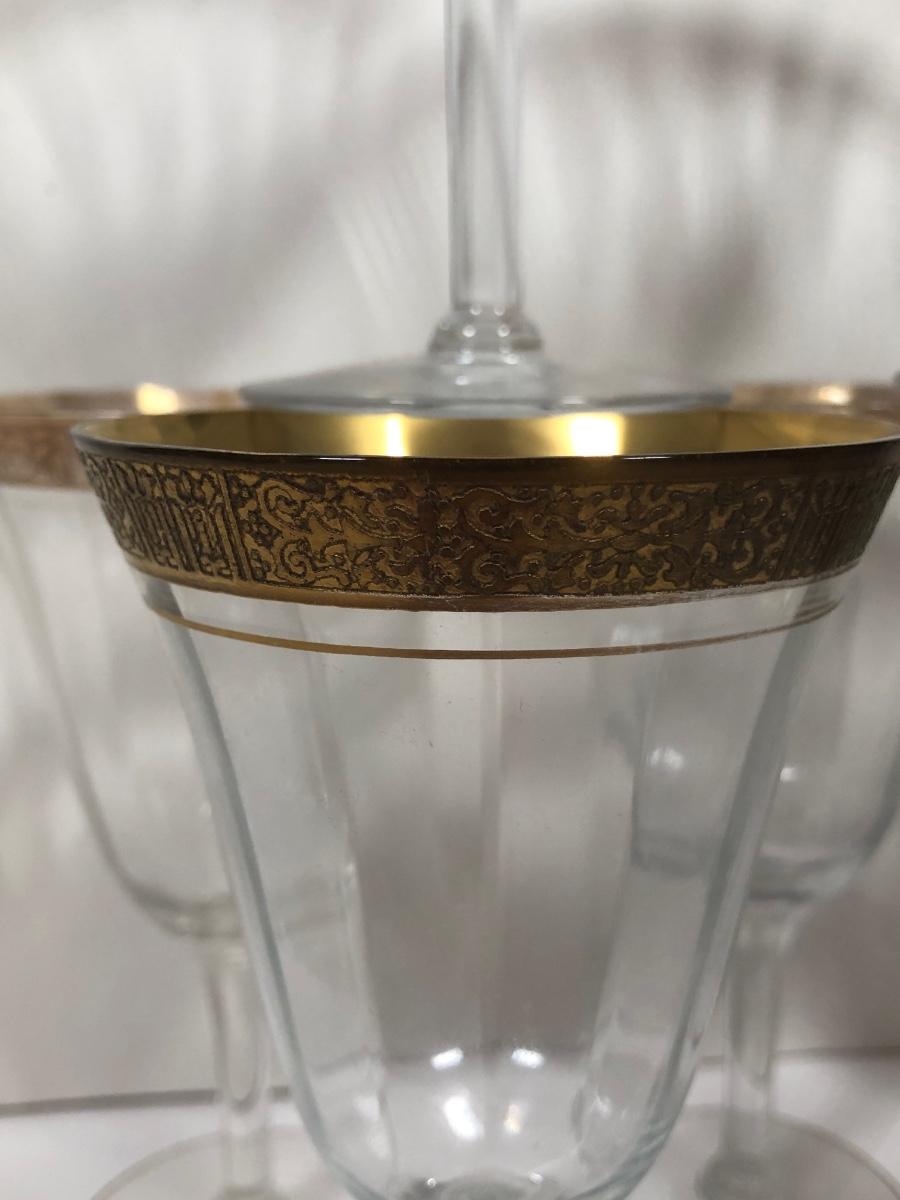 LOT 59: The Etched Design S P Co USA 14K Gold Decorated Gravy Boat, Gold Rimmed Stemware, Gold Leaf Pitcher & Green and Gold Candy Bowl