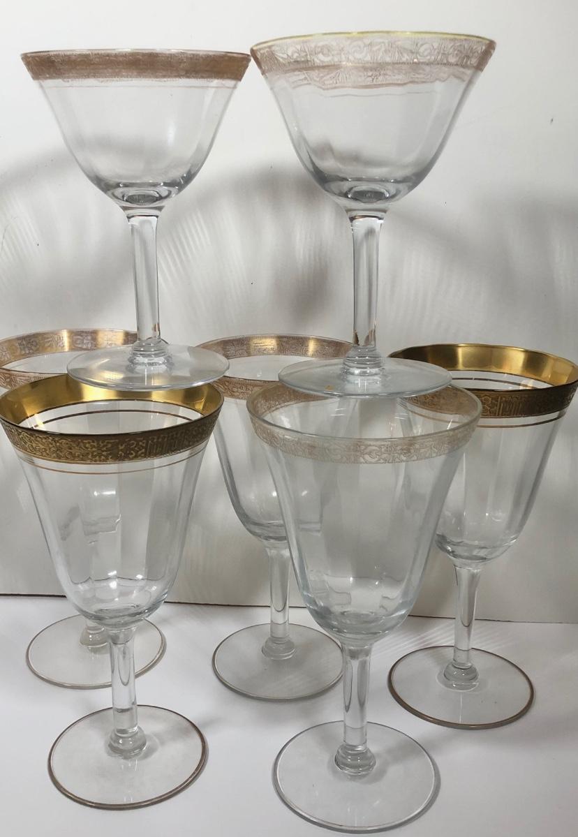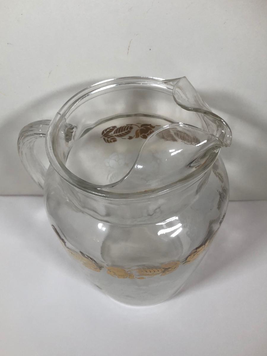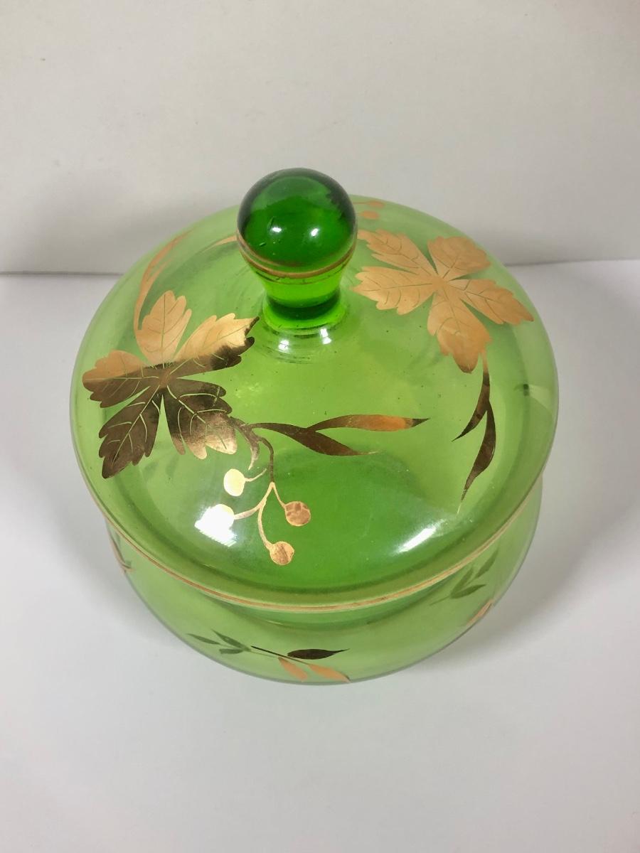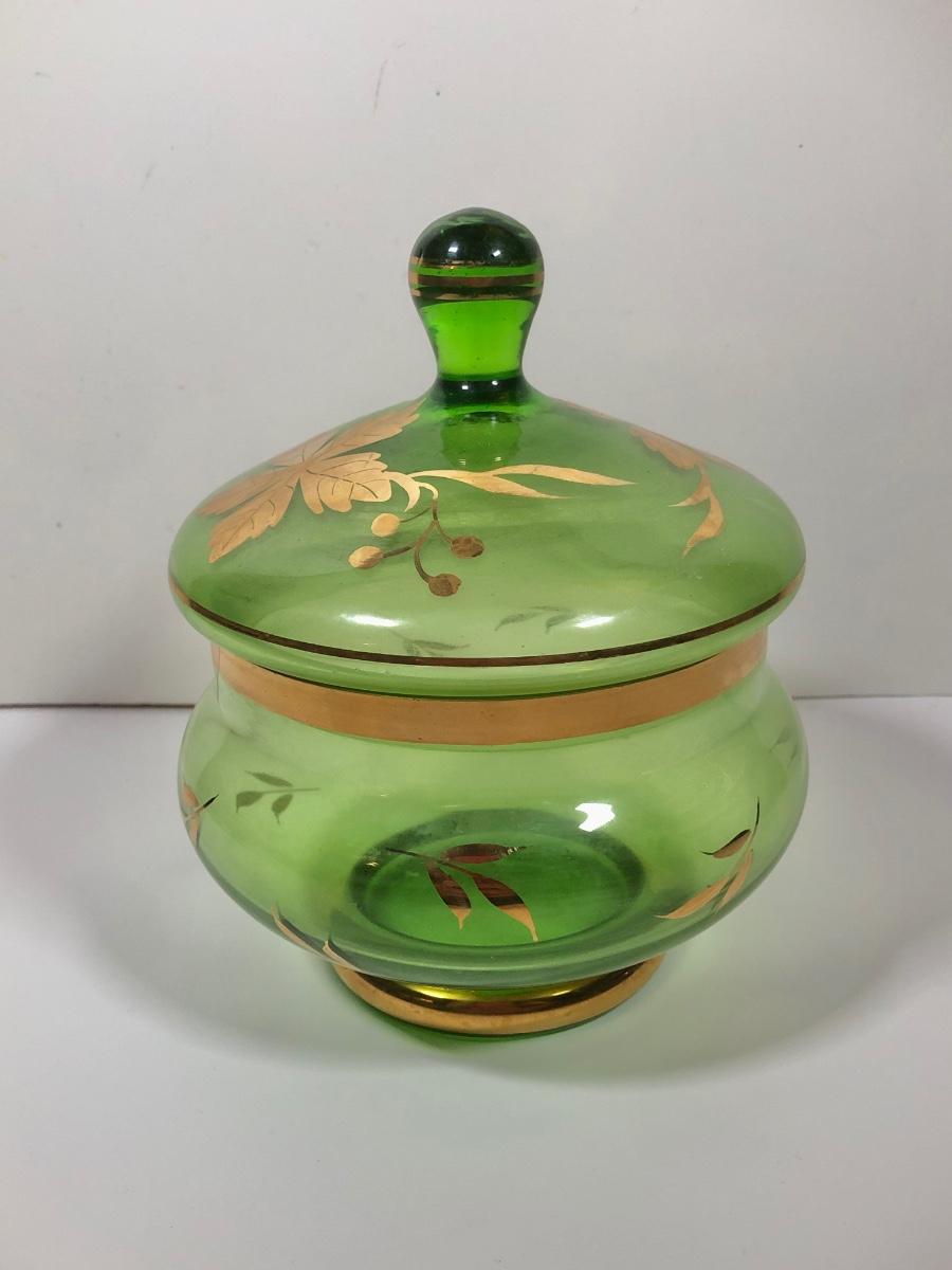 LOT 59: The Etched Design S P Co USA 14K Gold Decorated Gravy Boat, Gold Rimmed Stemware, Gold Leaf Pitcher & Green and Gold Candy Bowl