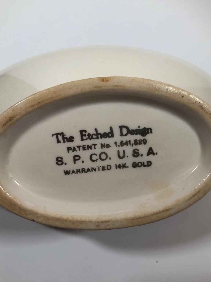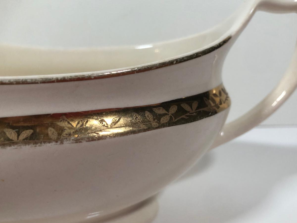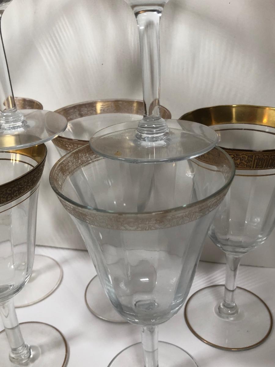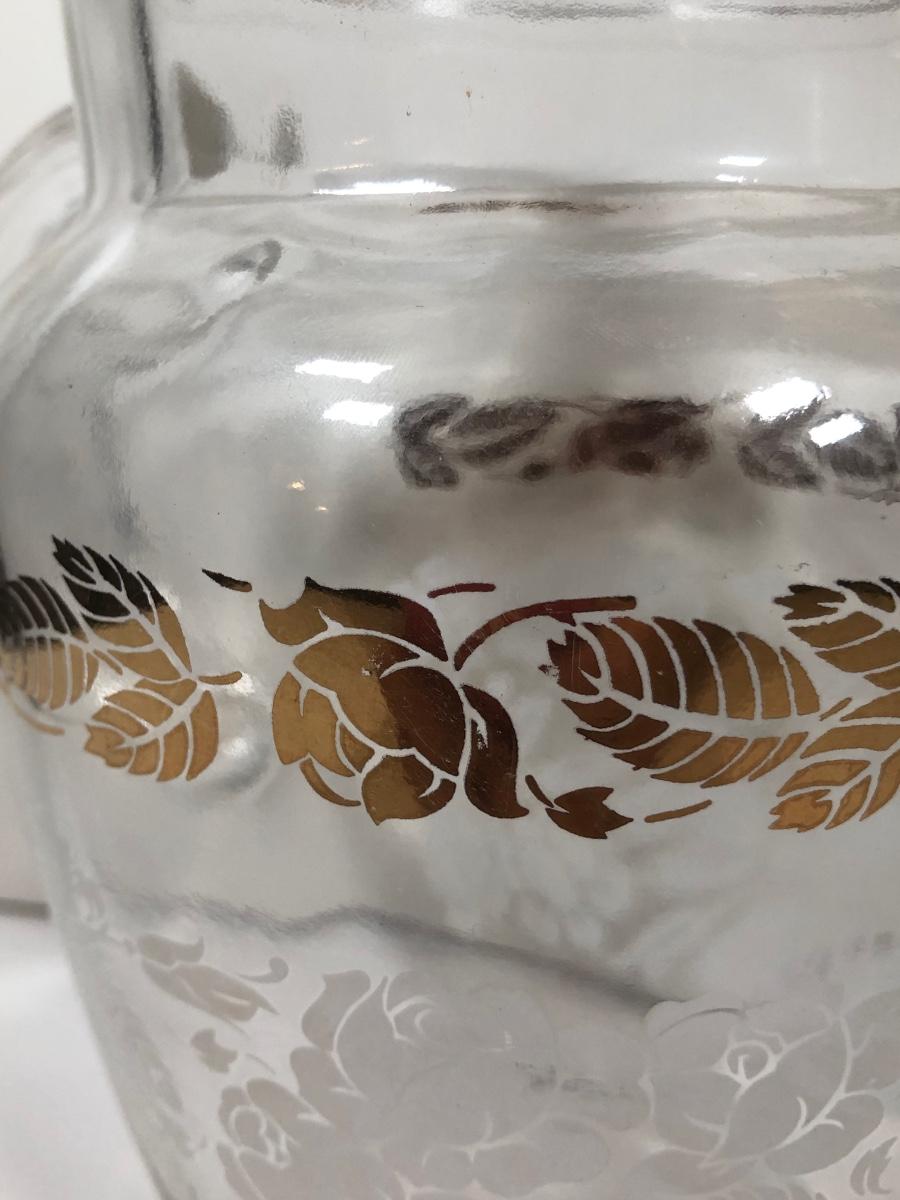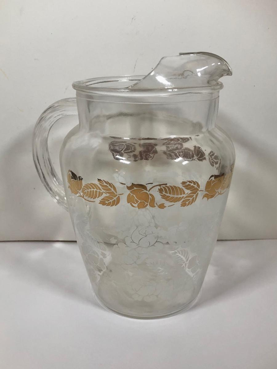 LOT 59: The Etched Design S P Co USA 14K Gold Decorated Gravy Boat, Gold Rimmed Stemware, Gold Leaf Pitcher & Green and Gold Candy Bowl