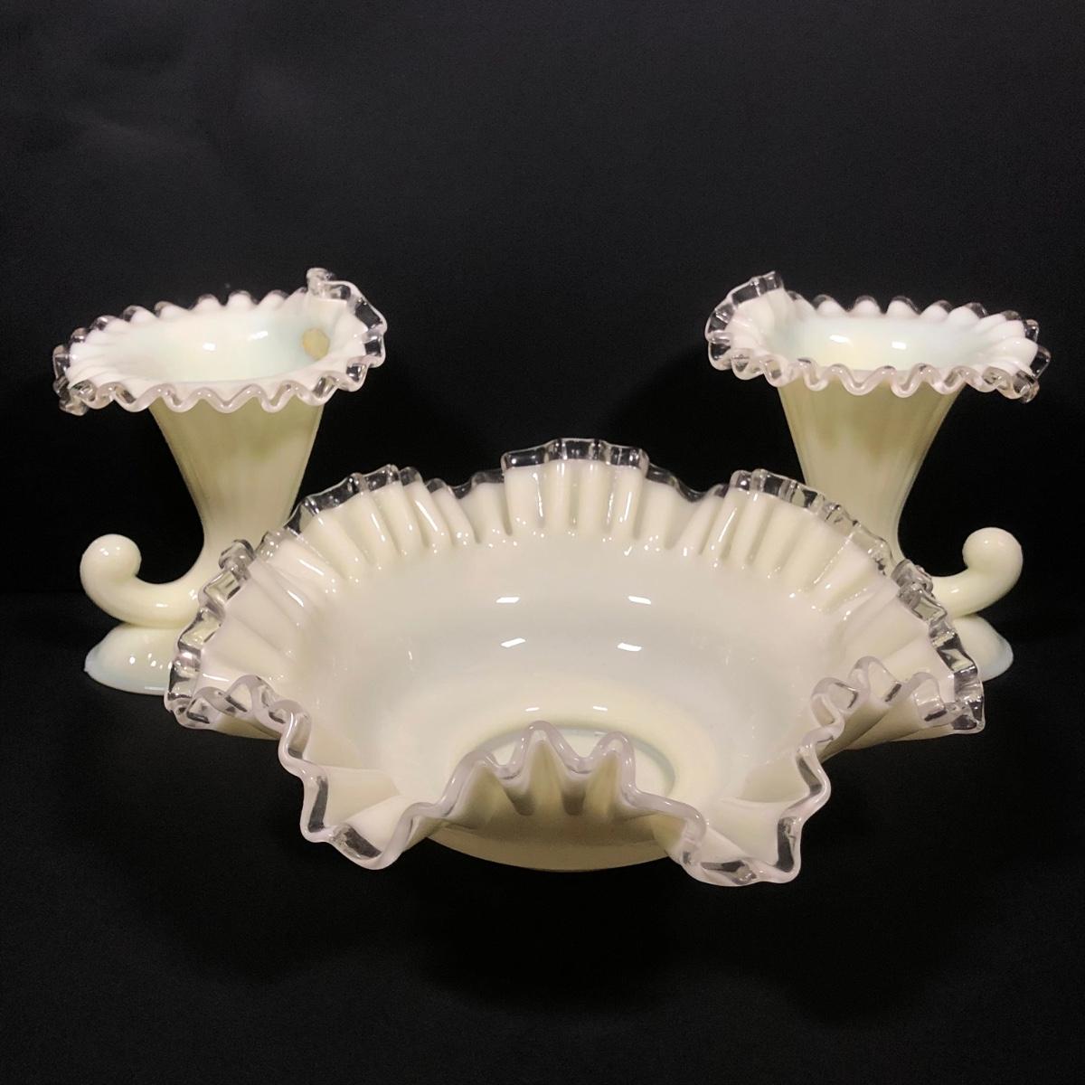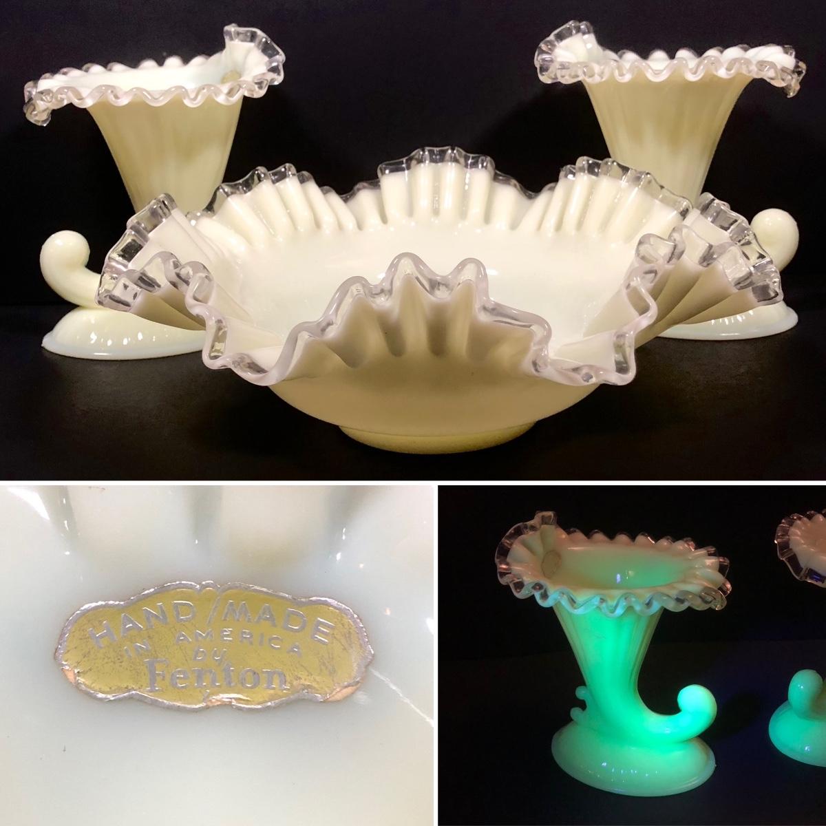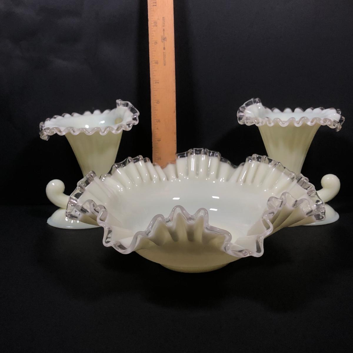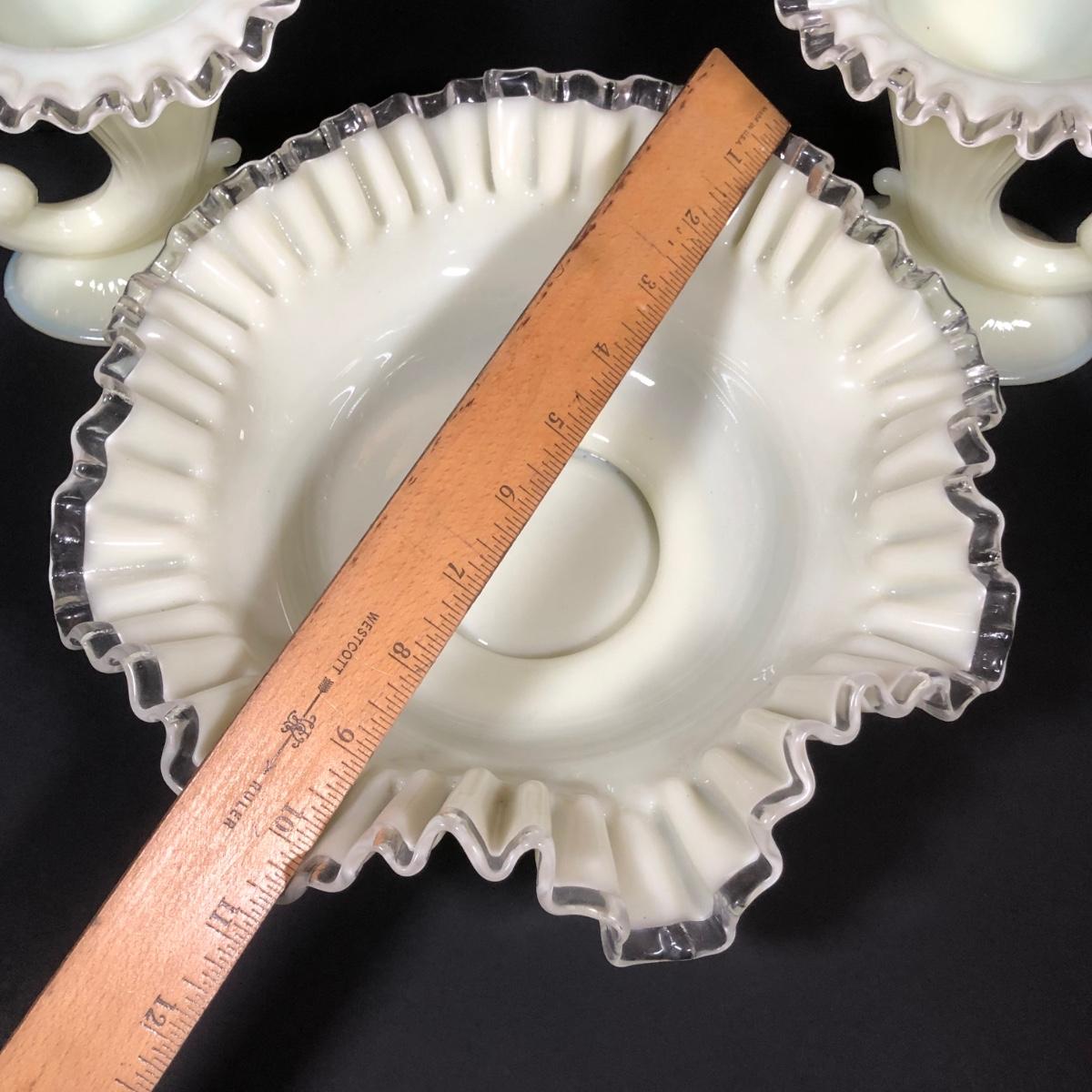 LOT 60: Vintage Fenton Uranium Milk Glass Ruffled Edge Silvercrest Bowl & Unique Candle Holders