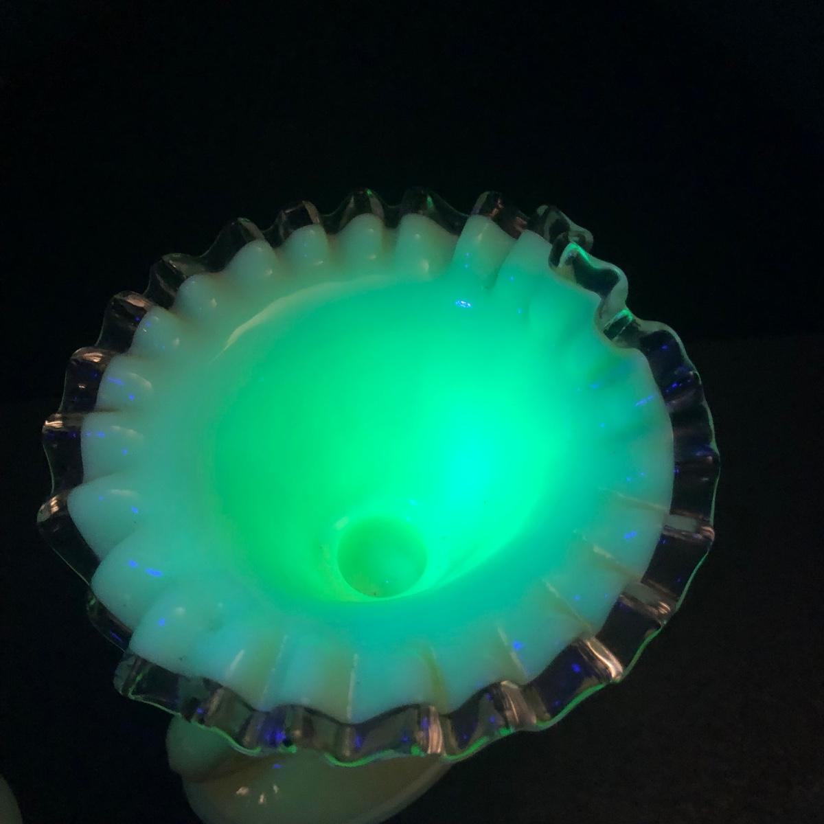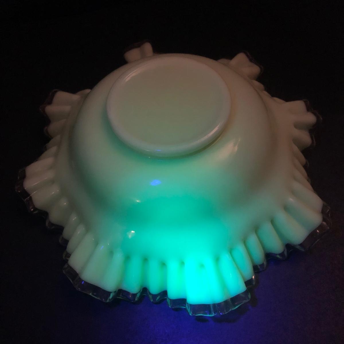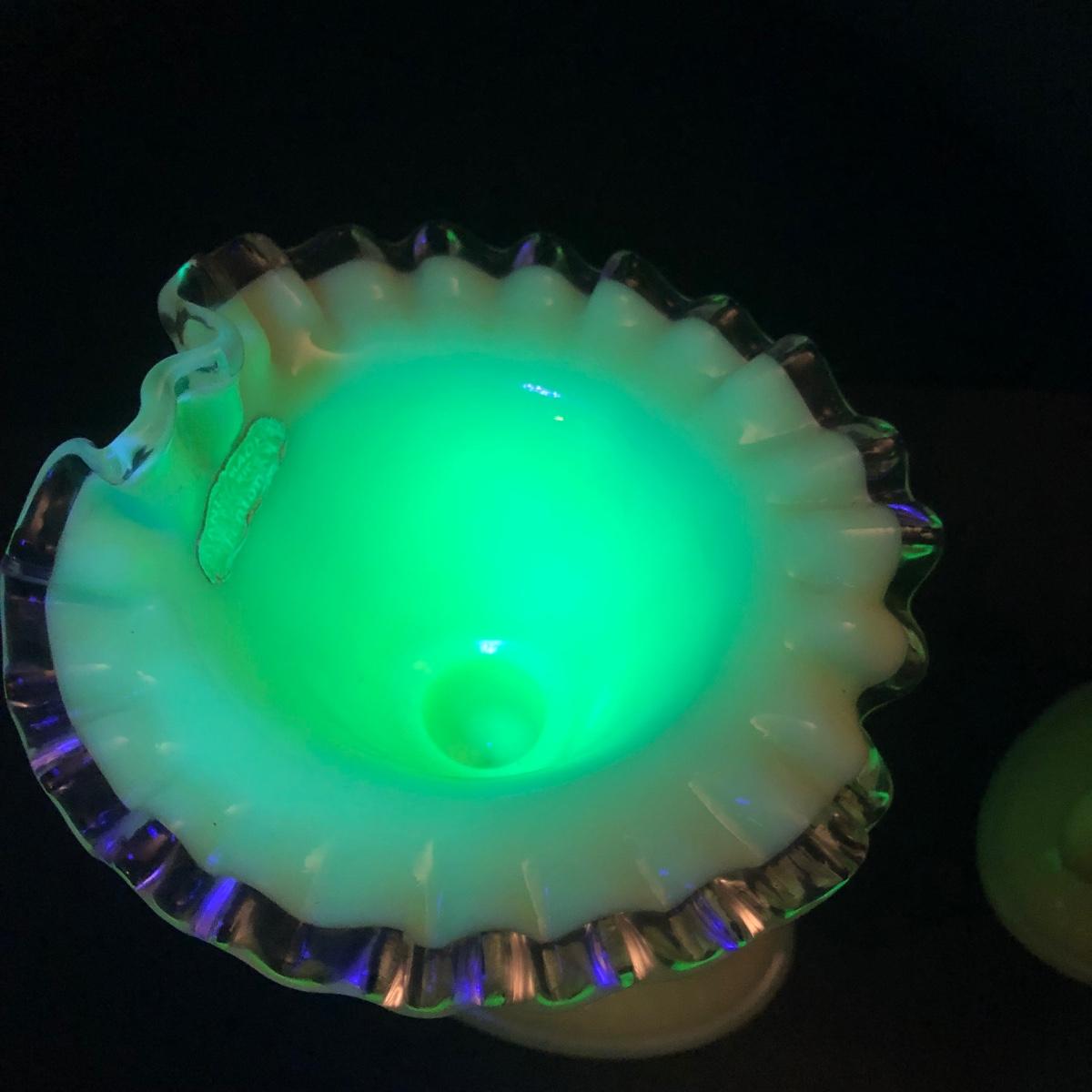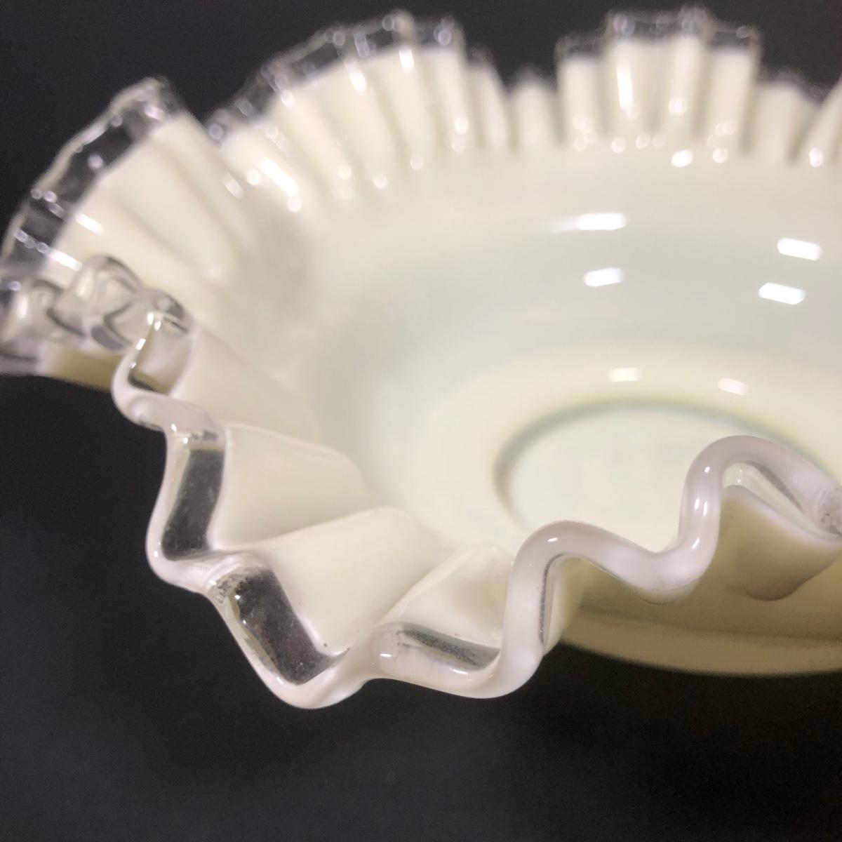 LOT 60: Vintage Fenton Uranium Milk Glass Ruffled Edge Silvercrest Bowl & Unique Candle Holders