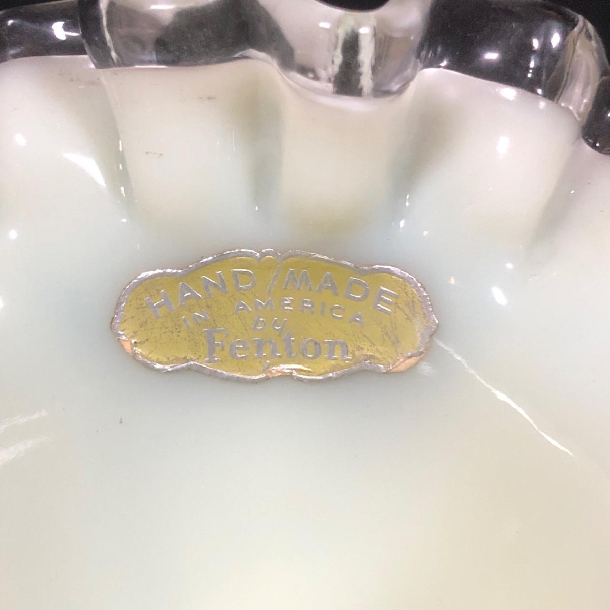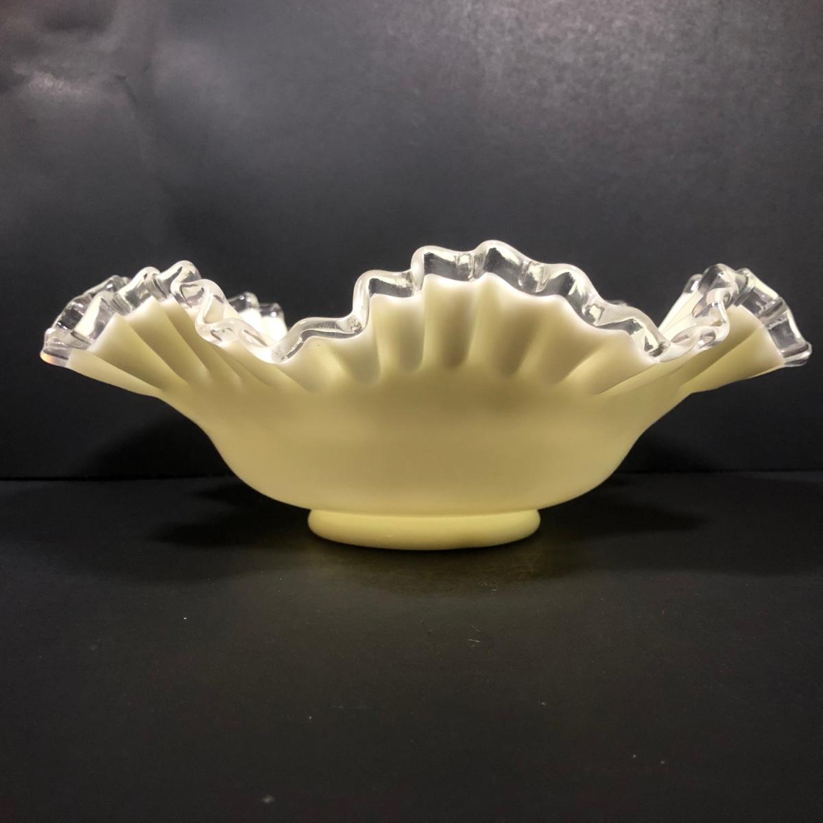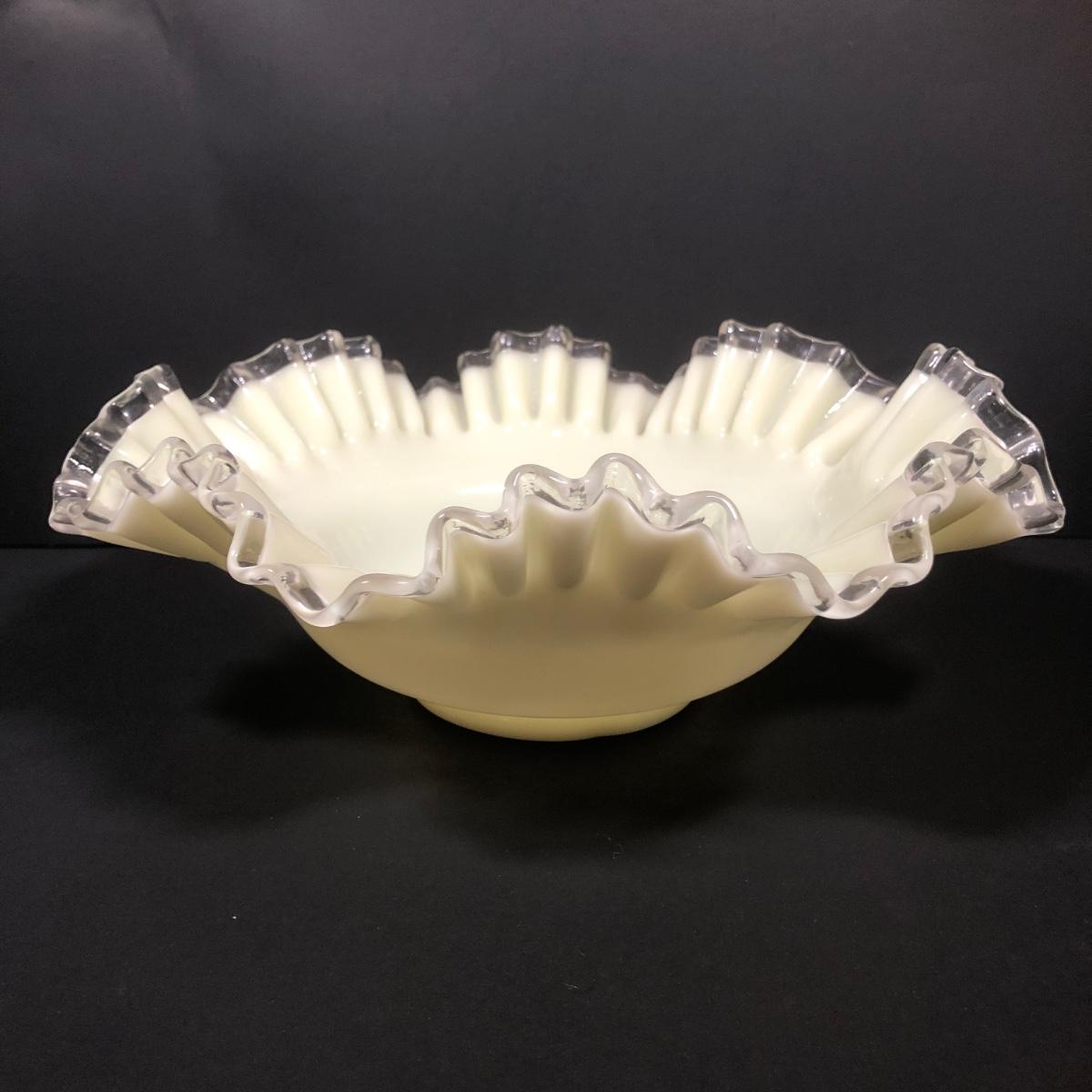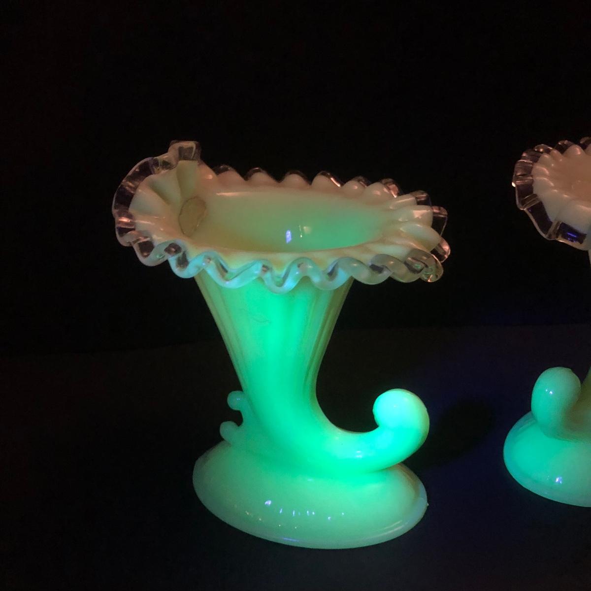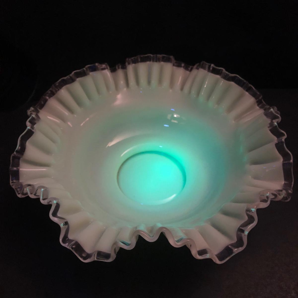 LOT 60: Vintage Fenton Uranium Milk Glass Ruffled Edge Silvercrest Bowl & Unique Candle Holders
