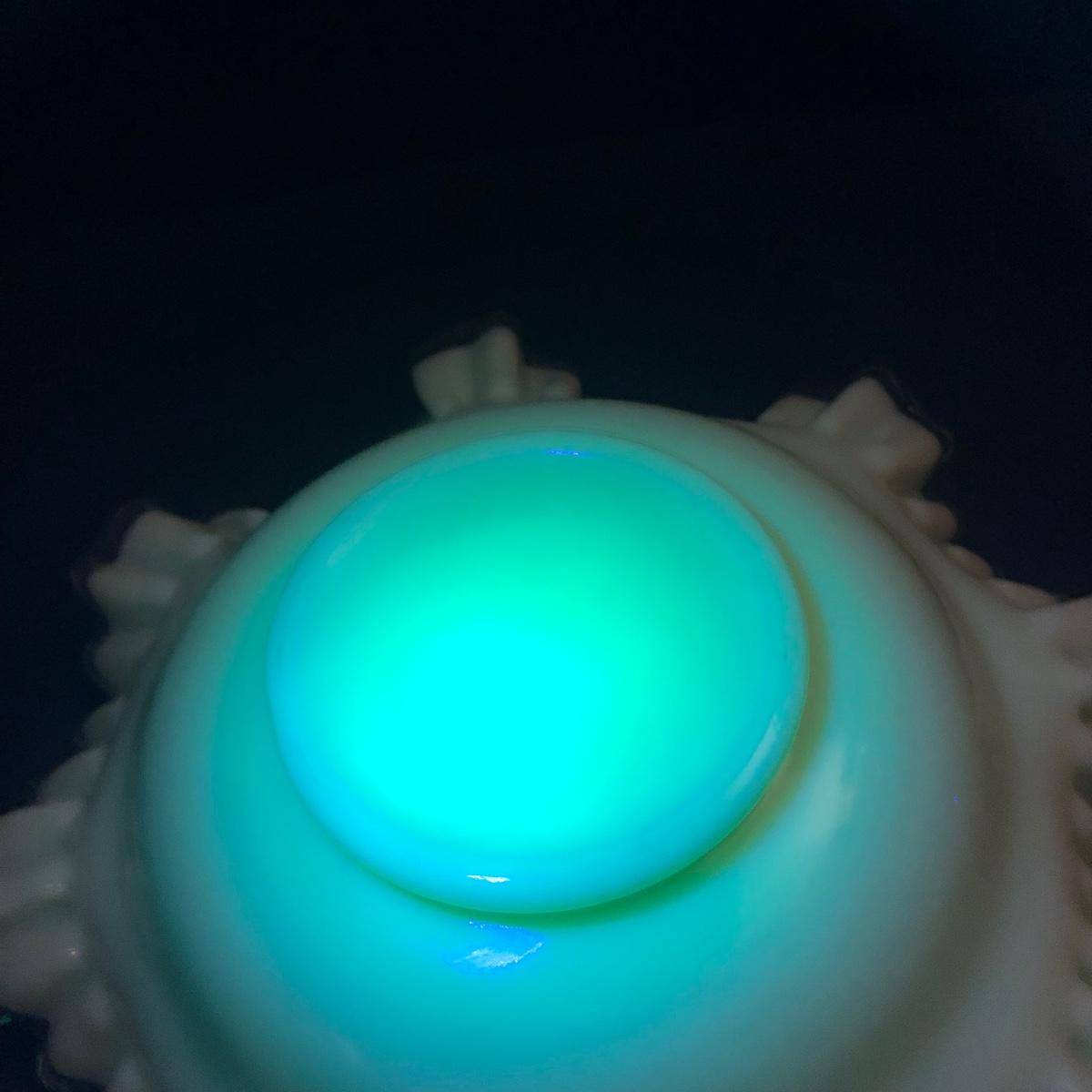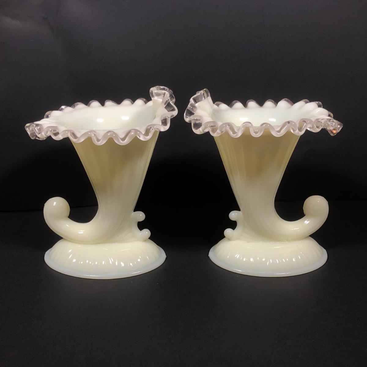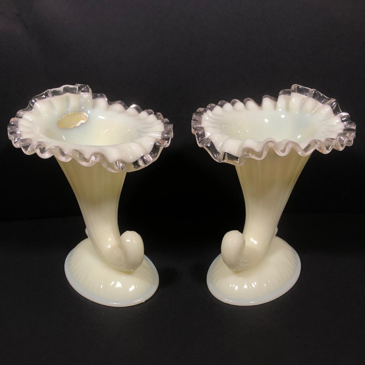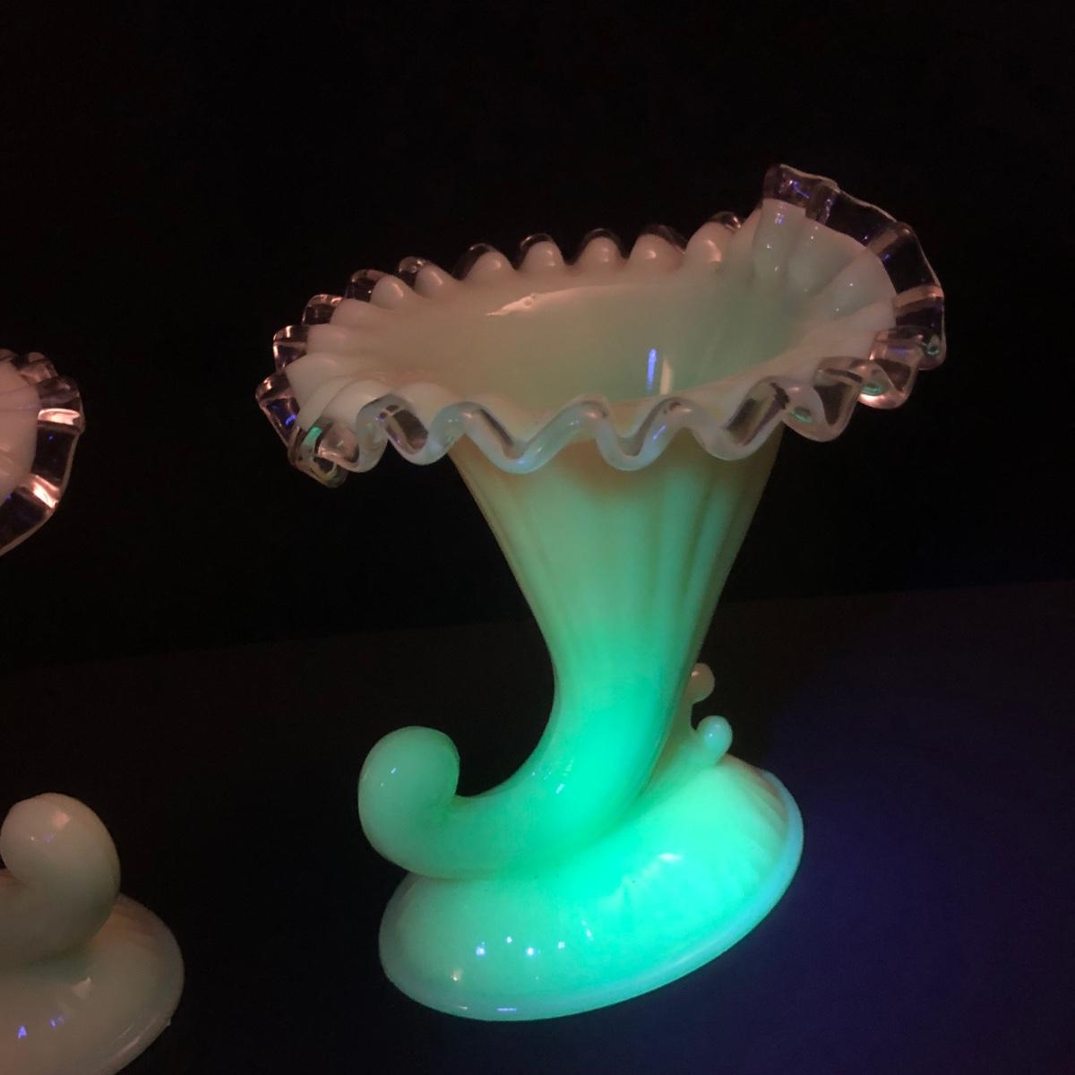 LOT 60: Vintage Fenton Uranium Milk Glass Ruffled Edge Silvercrest Bowl & Unique Candle Holders