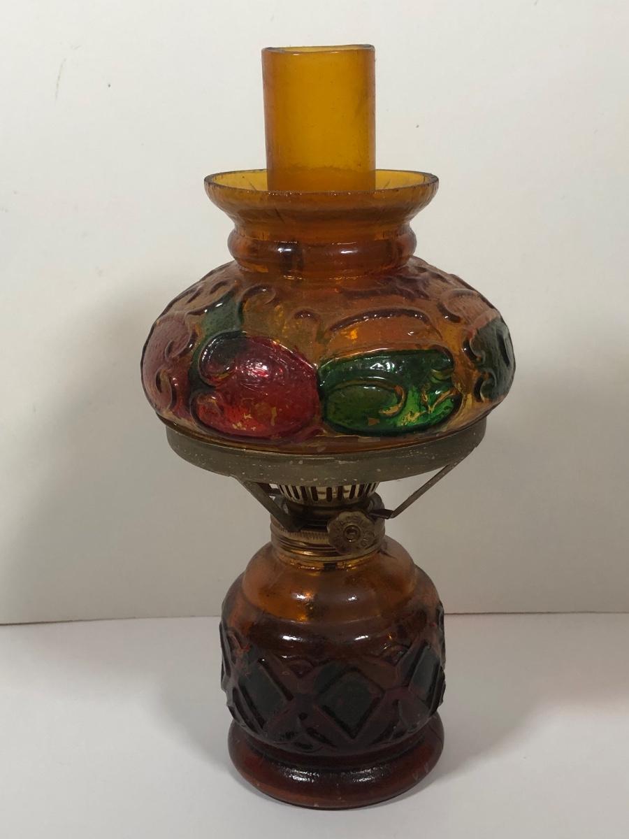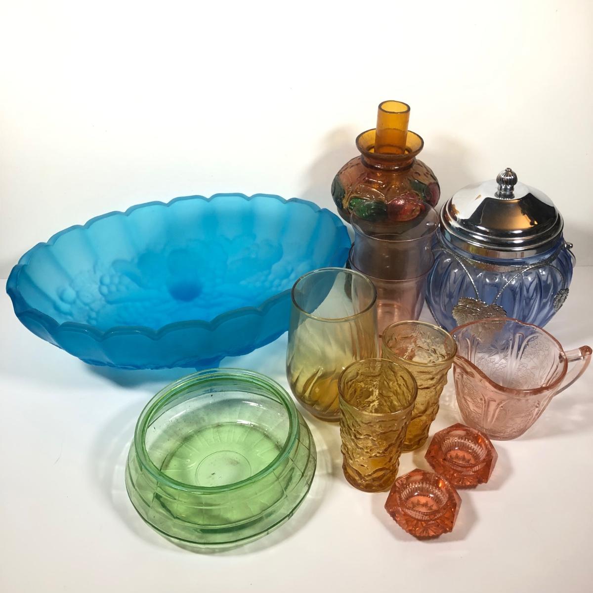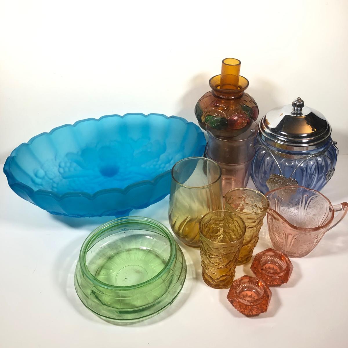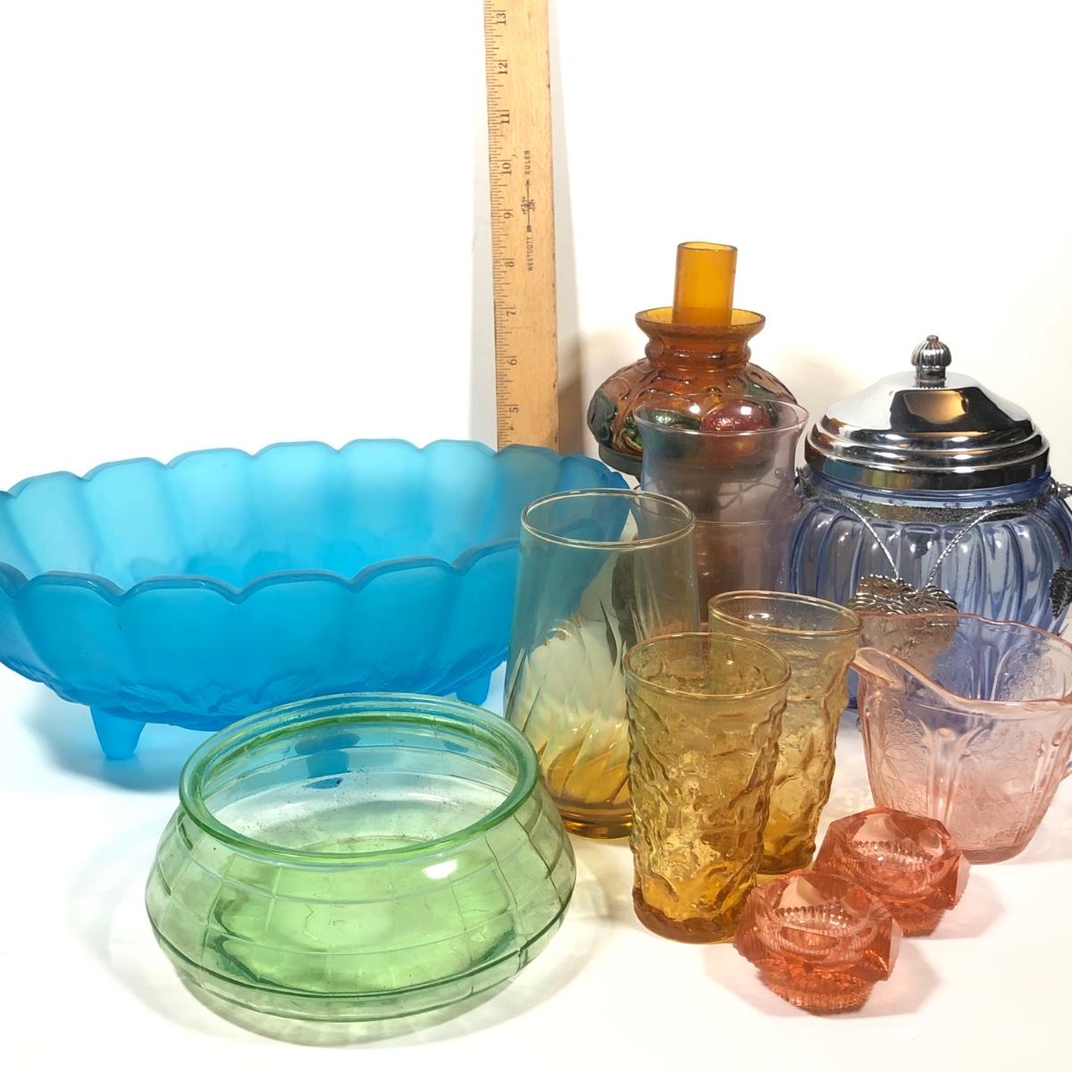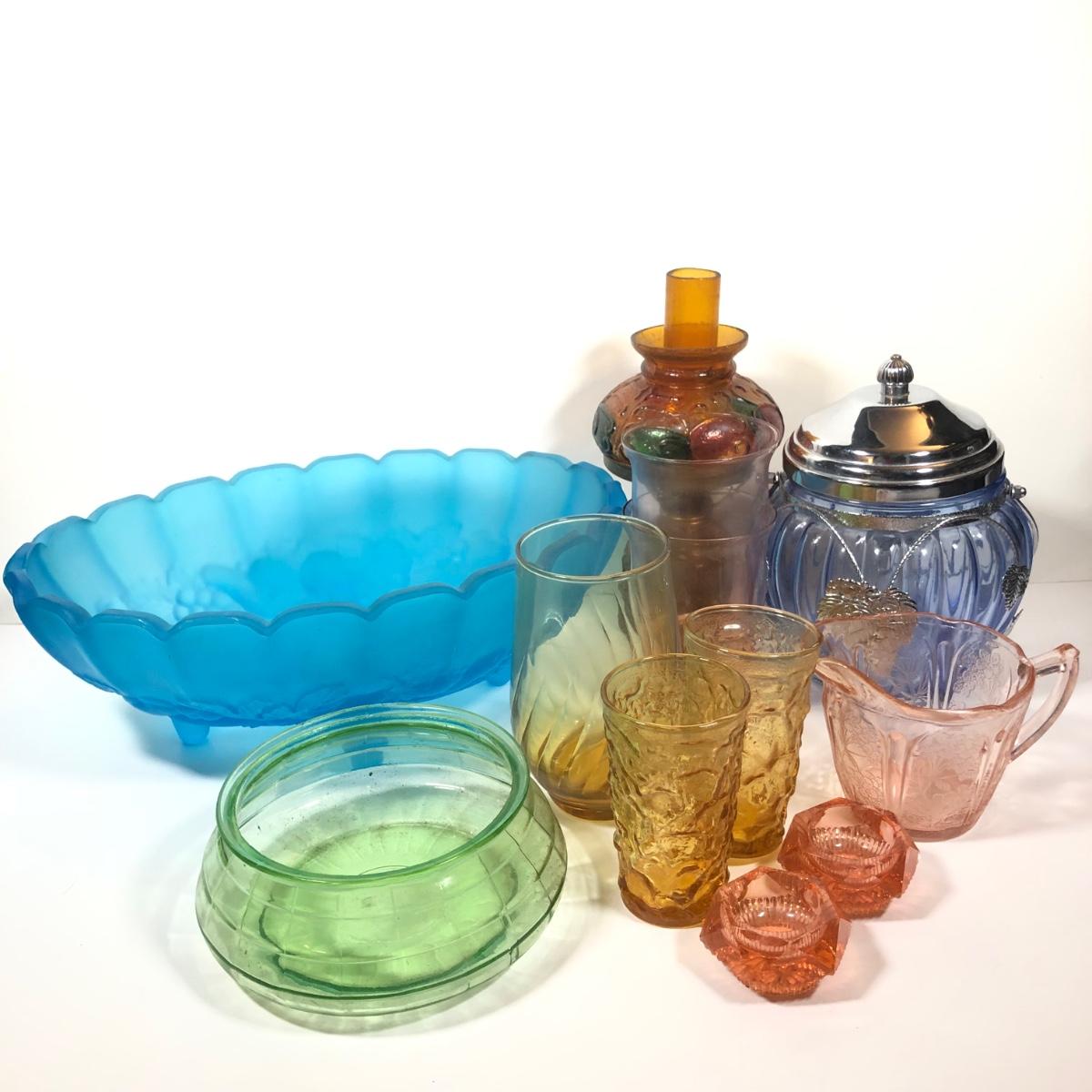 LOT 64: Colorful Glass Collection - Uranium Glass Bowl Amber Oil Lamp, Lara's Theme Musical Blue Jar & More