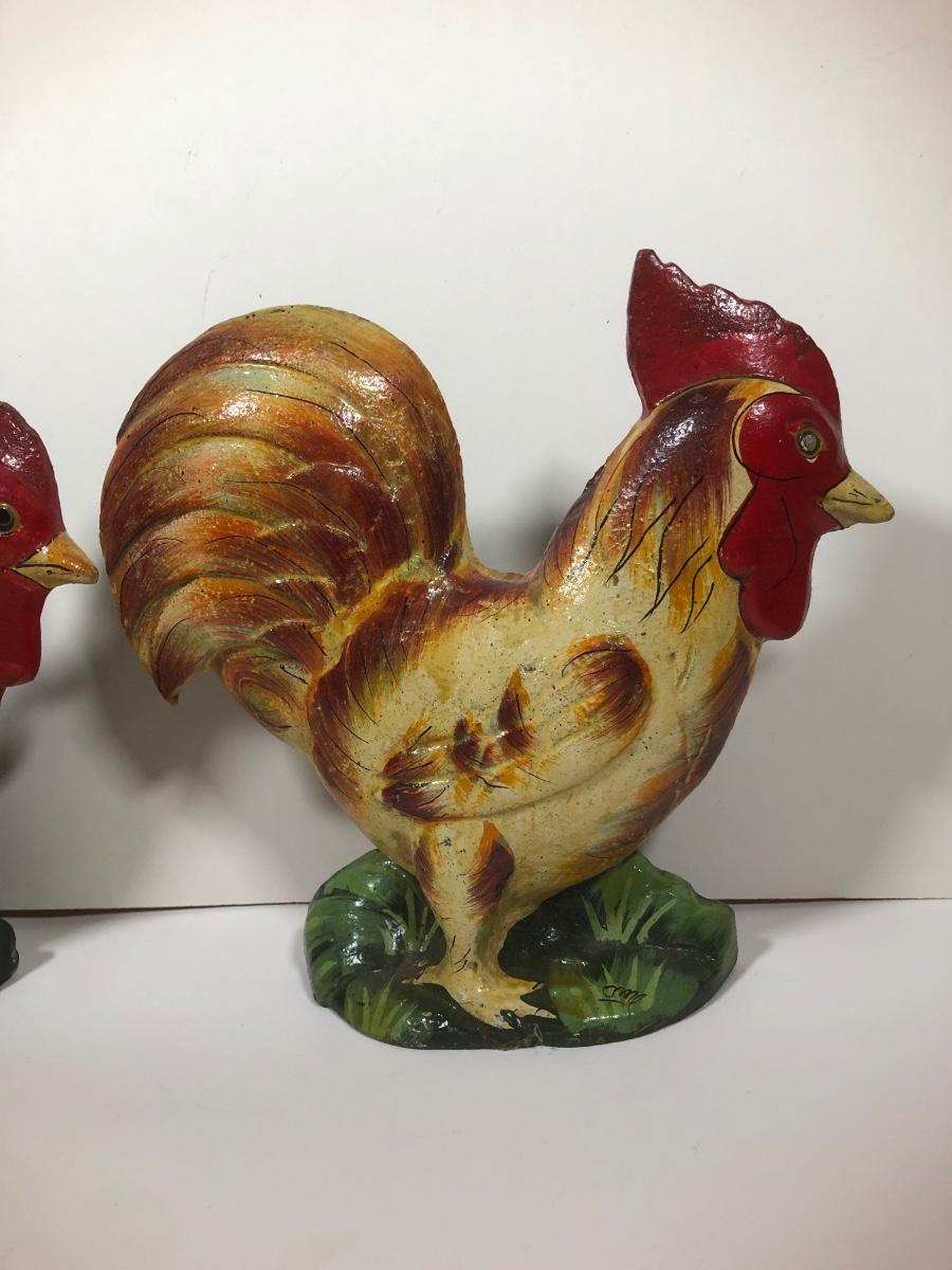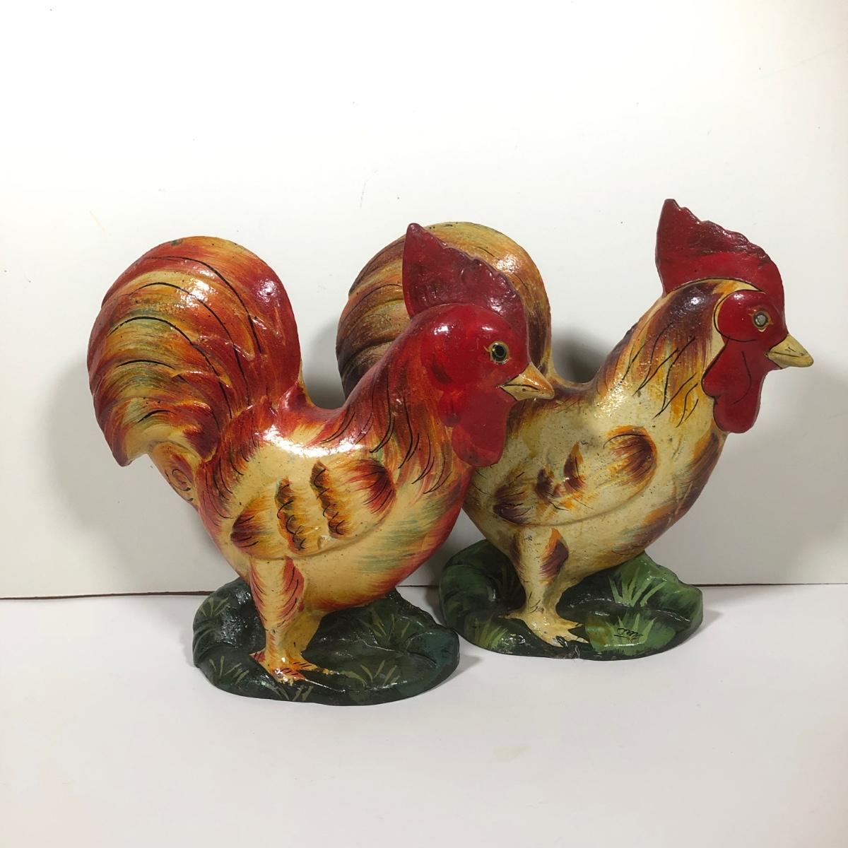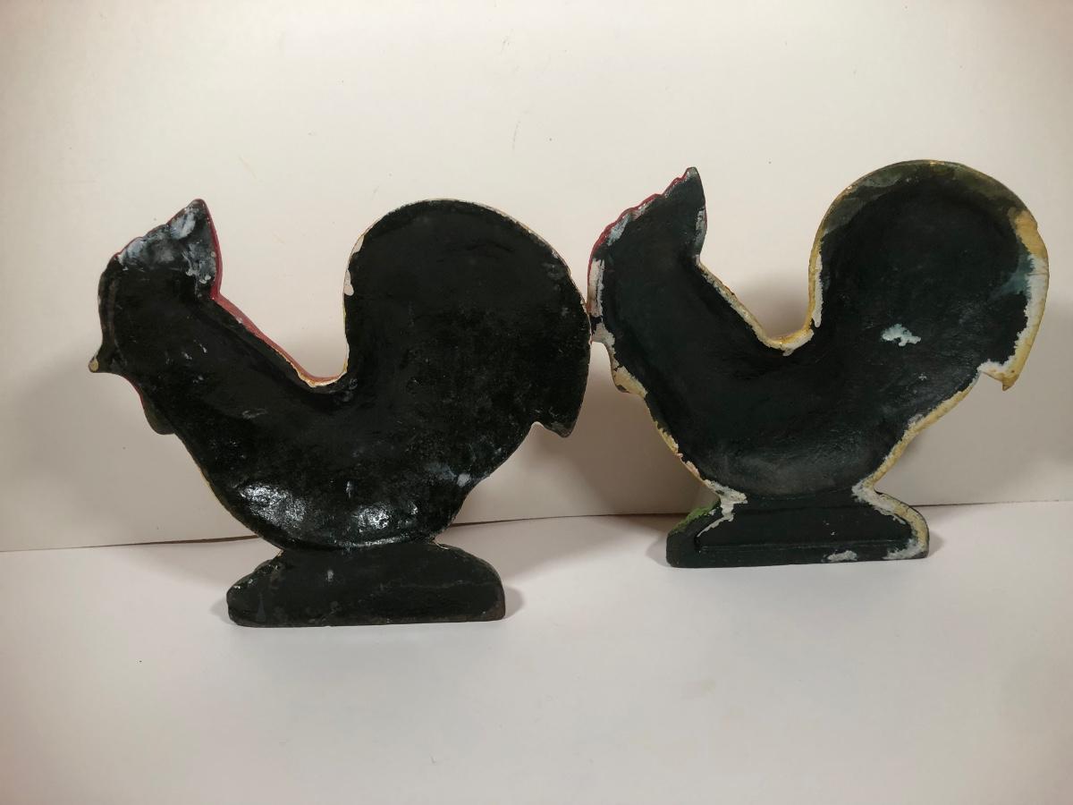 LOT 65: Two Vintage Painted Rooster Cast Iron Door Stops