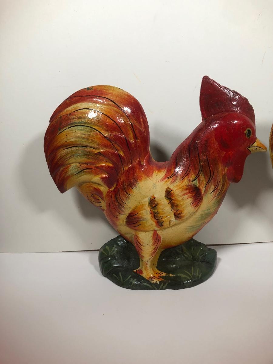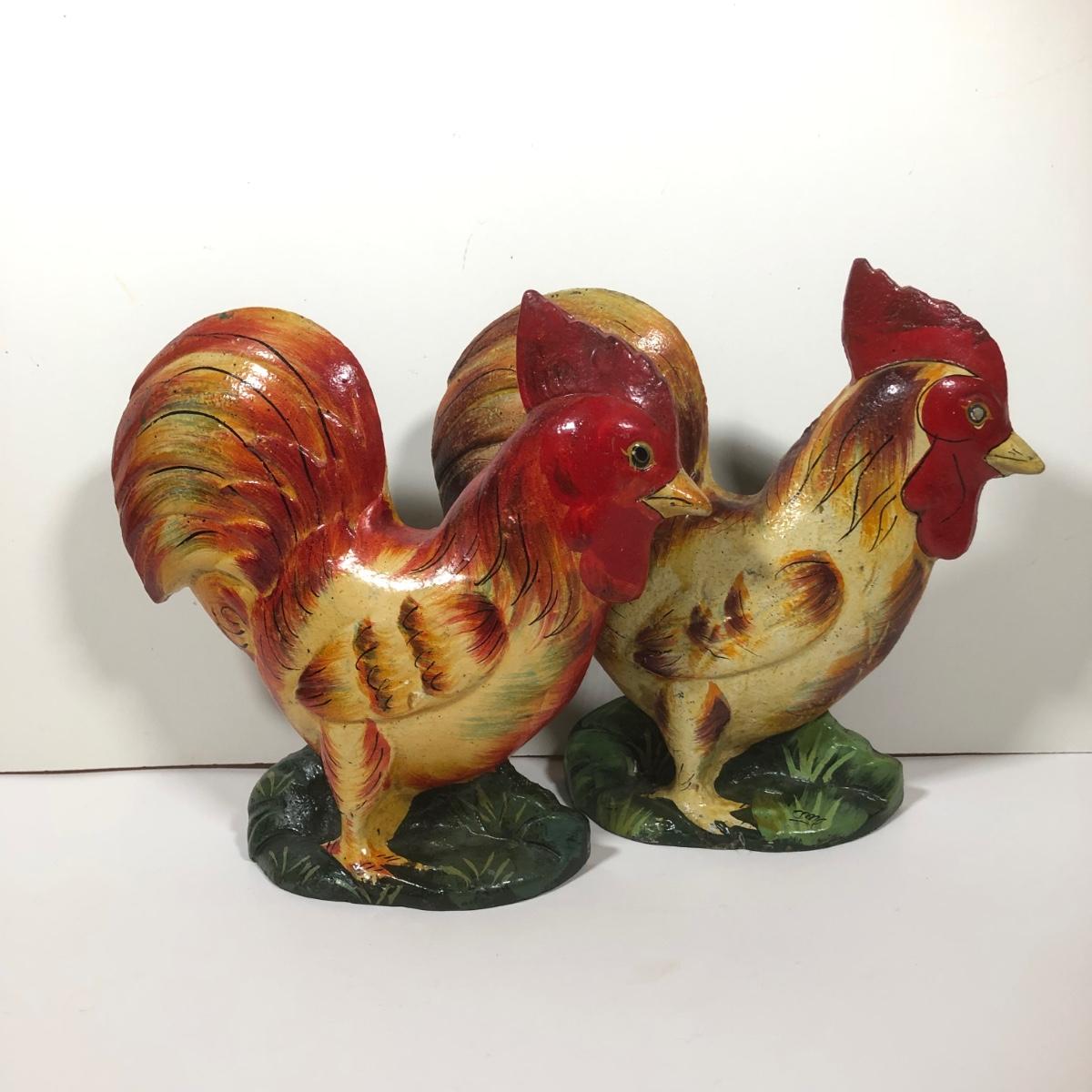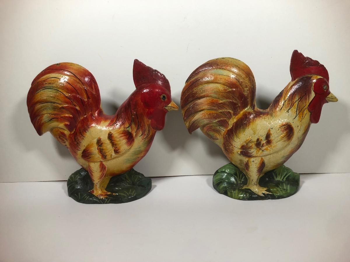 LOT 65: Two Vintage Painted Rooster Cast Iron Door Stops