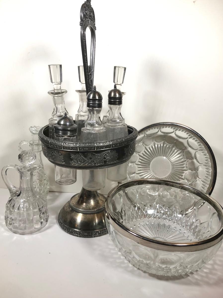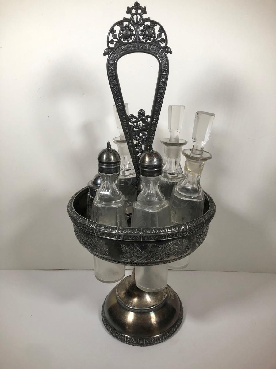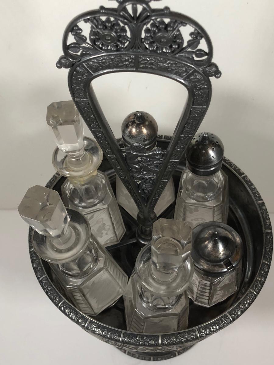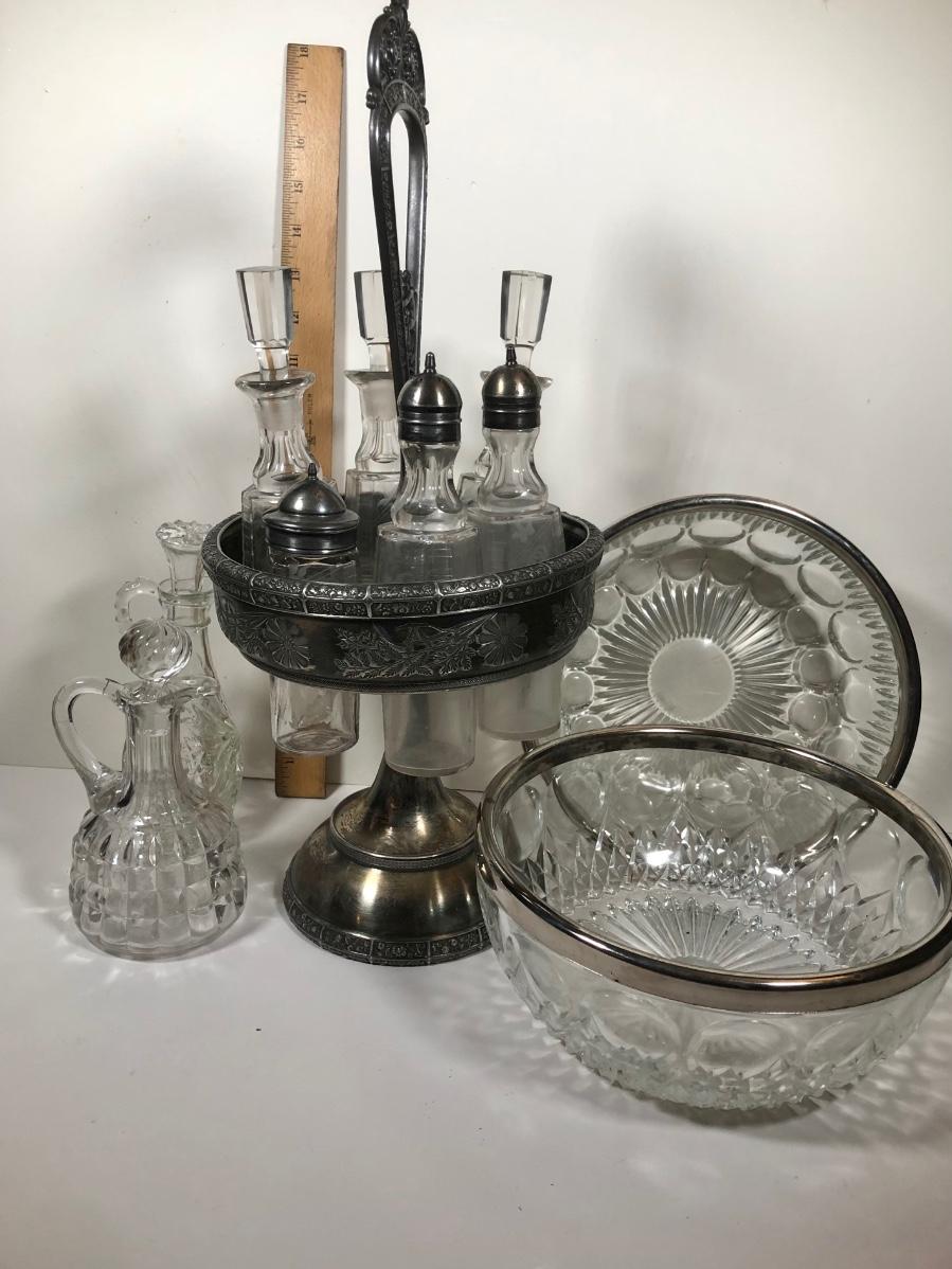 LOT 67: Antique/Vintage Victorian Style Cruet Condiment Serving Set, Crystal Cruets & Bowls
