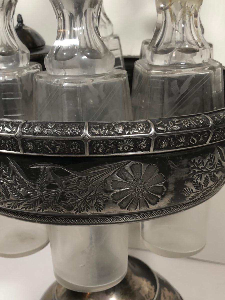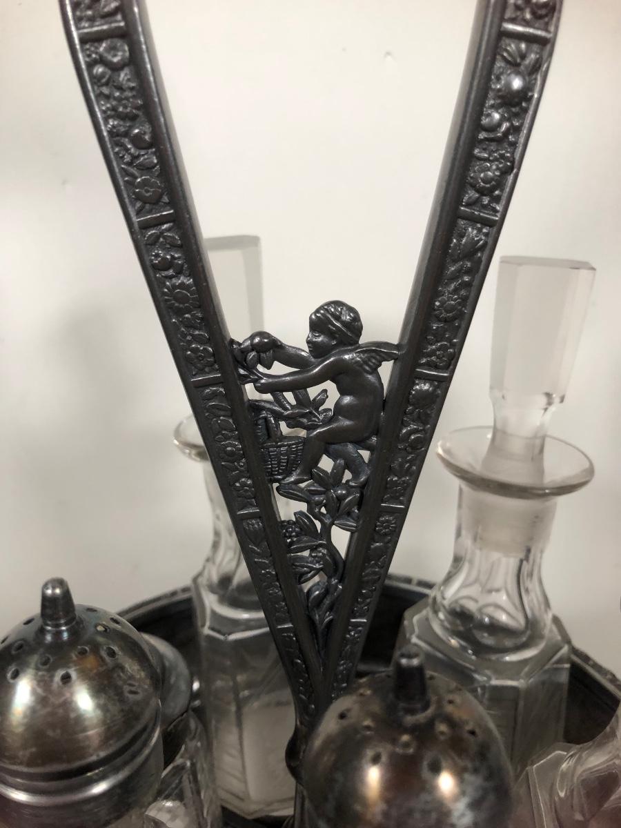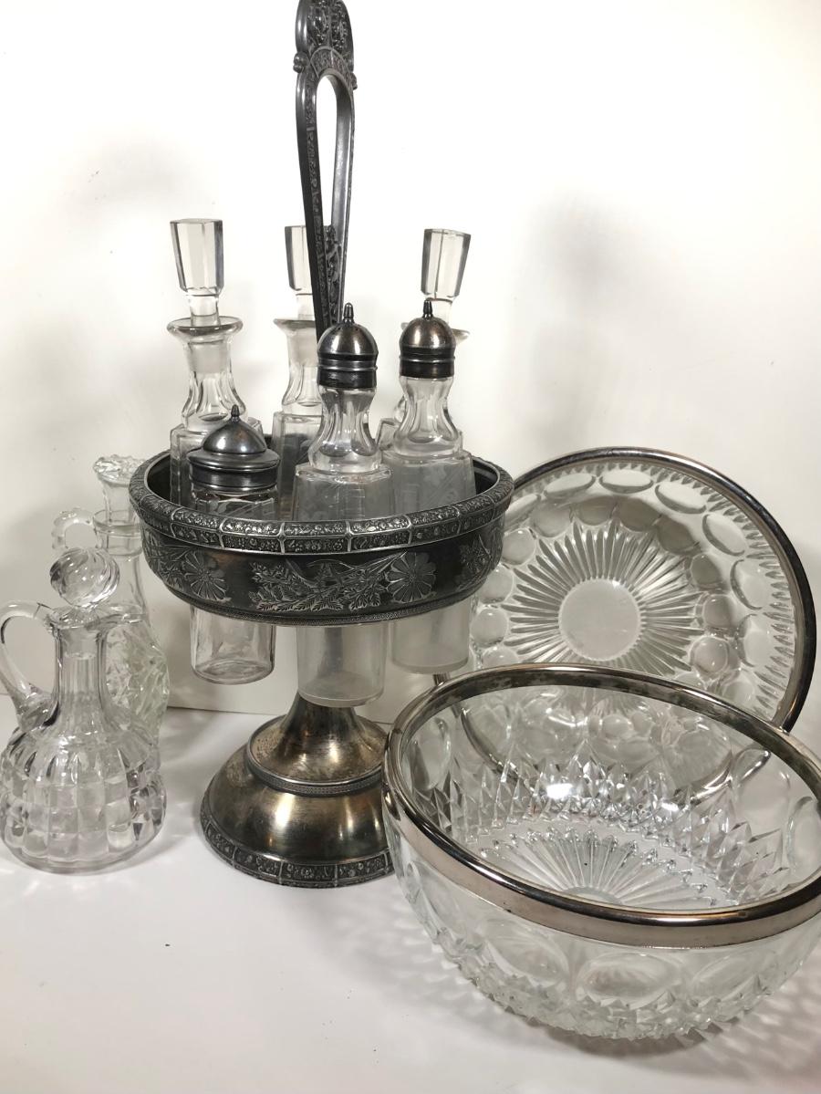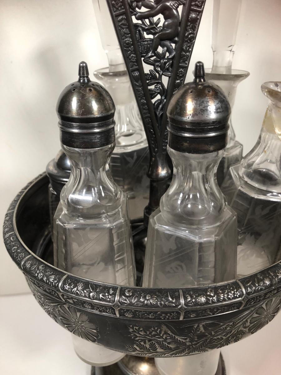 LOT 67: Antique/Vintage Victorian Style Cruet Condiment Serving Set, Crystal Cruets & Bowls