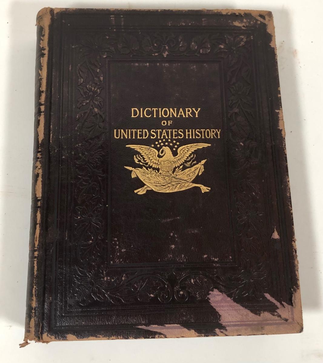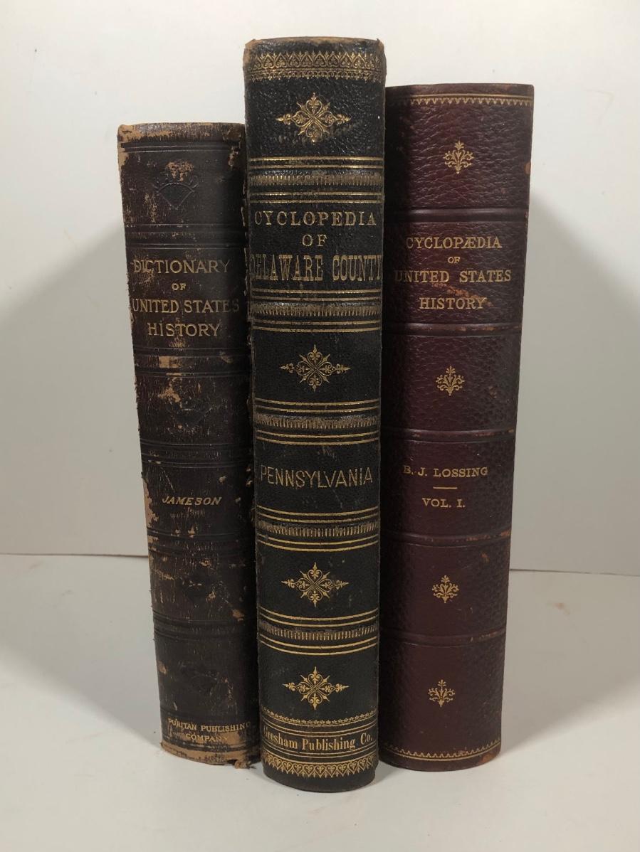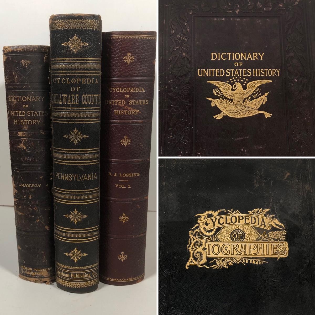LOT 74: Antique Books - 1893 Harpers' Popular Cyclopedia of US History Vol I, 1894 Biographical & Historical Cyclopedia of Delaware Country PA & 1898 Dictionary of US History