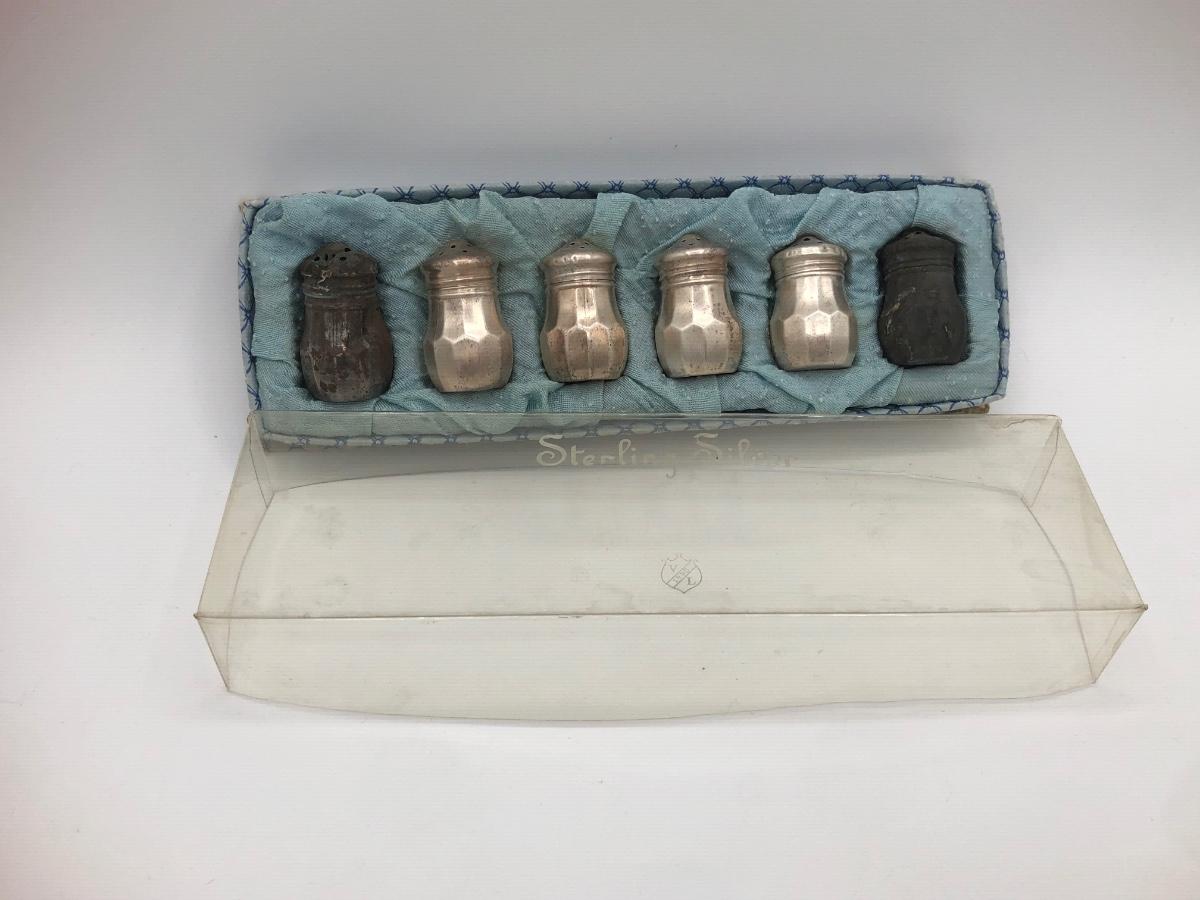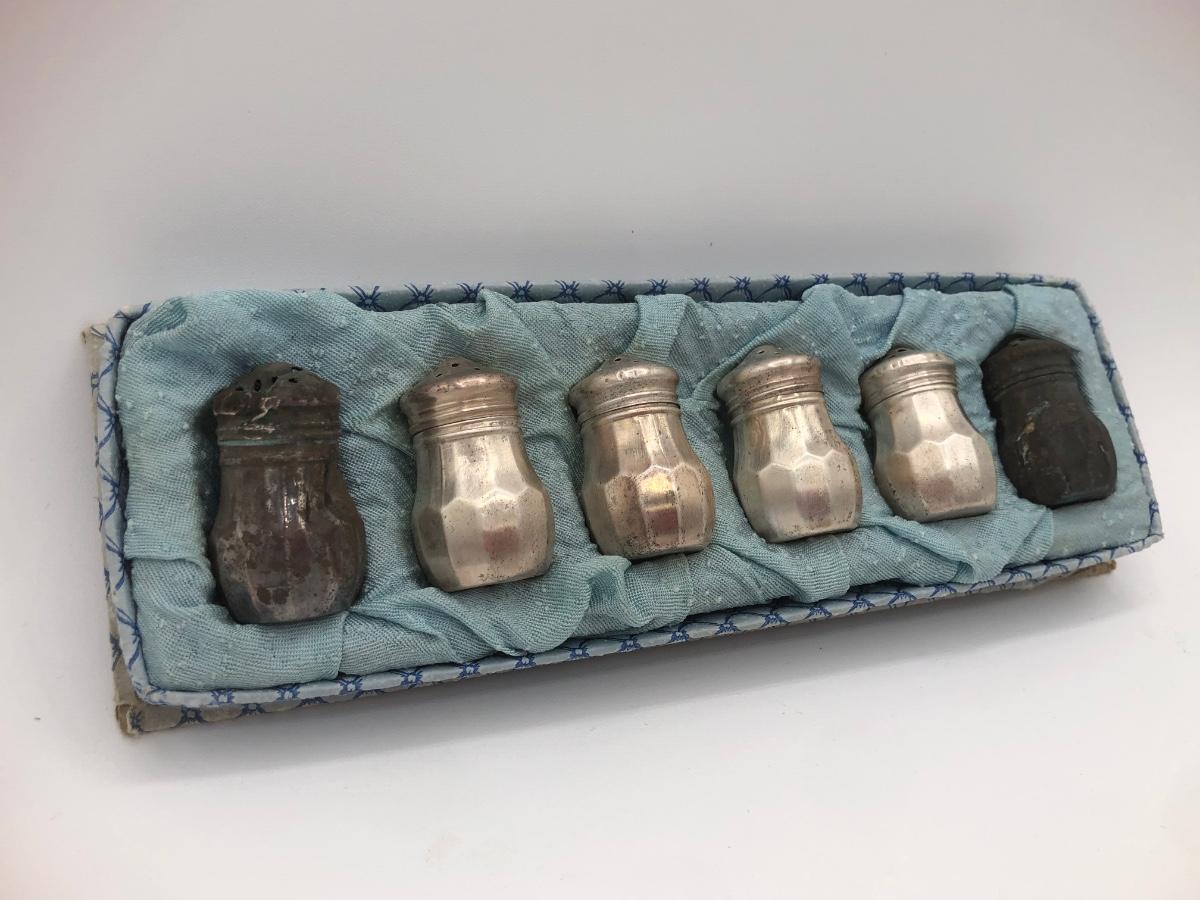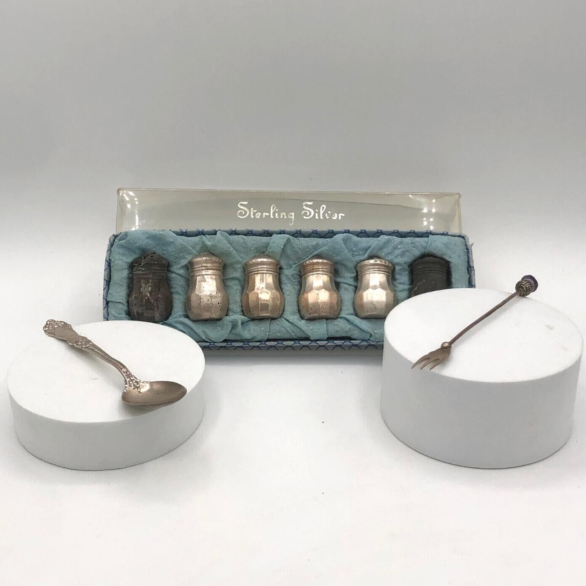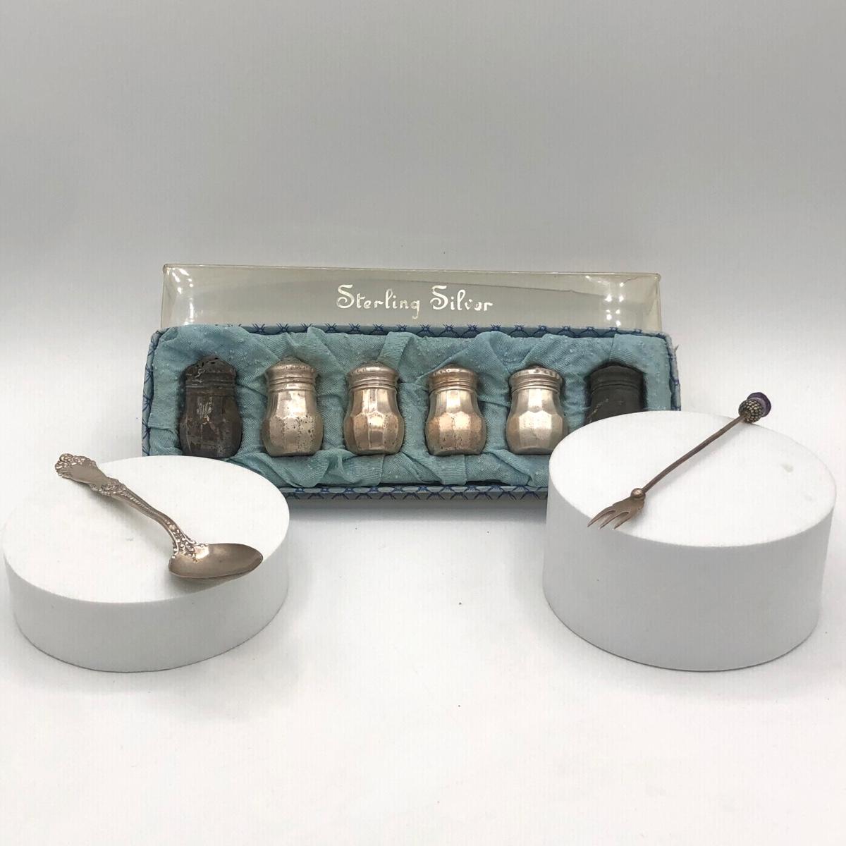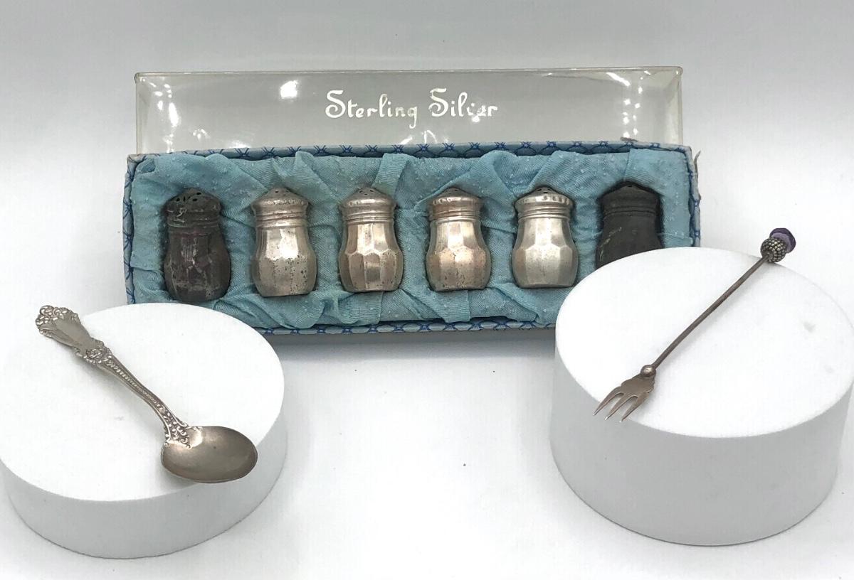 LOT 135J: Antique 1911 Birmingham Sterling Silver Olive / Pickle Fork (5.6g), Set of 6 S&P Shakers (38g) & Sterling Silver Spoon (17.5g)