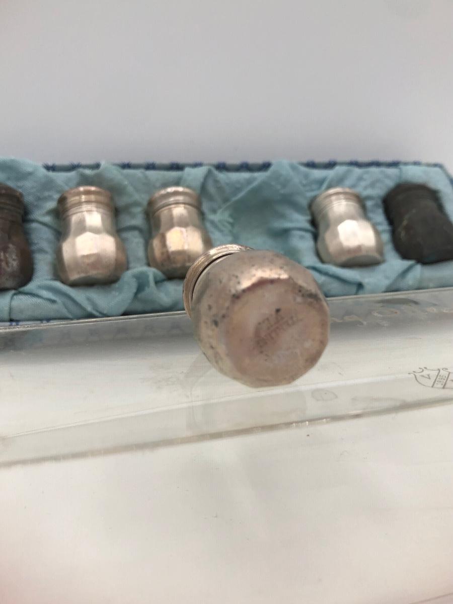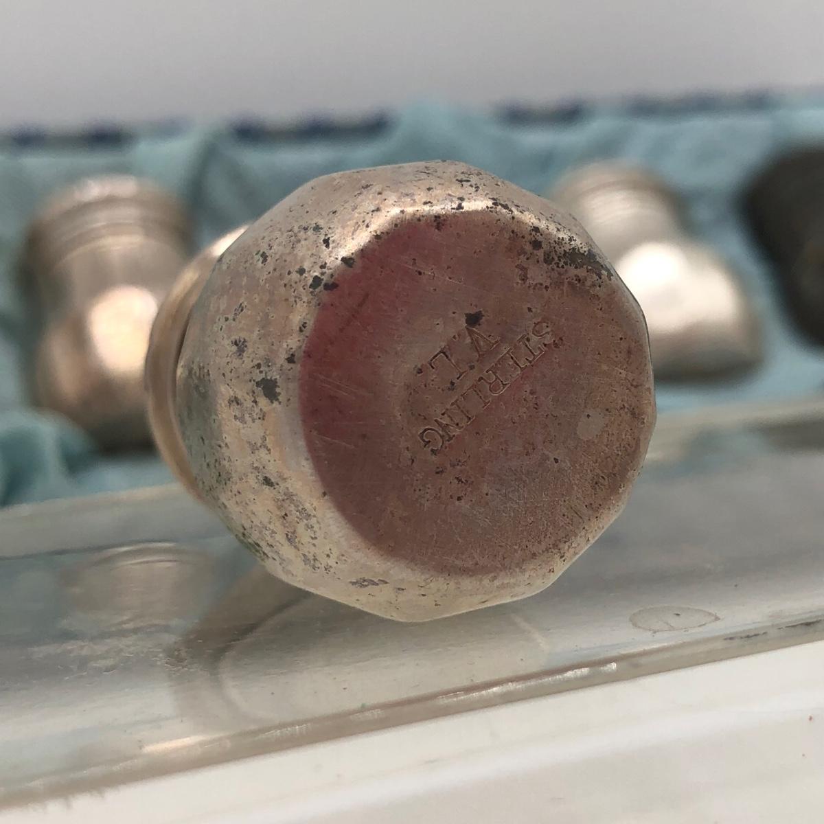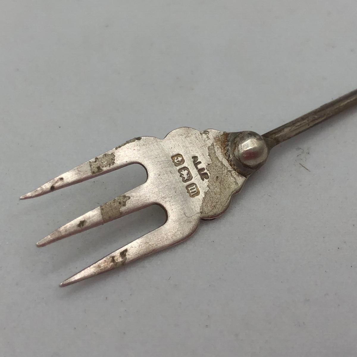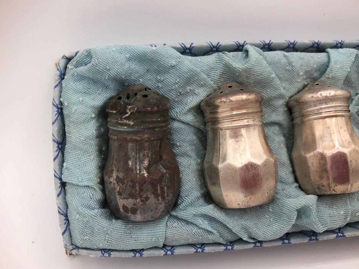 LOT 135J: Antique 1911 Birmingham Sterling Silver Olive / Pickle Fork (5.6g), Set of 6 S&P Shakers (38g) & Sterling Silver Spoon (17.5g)