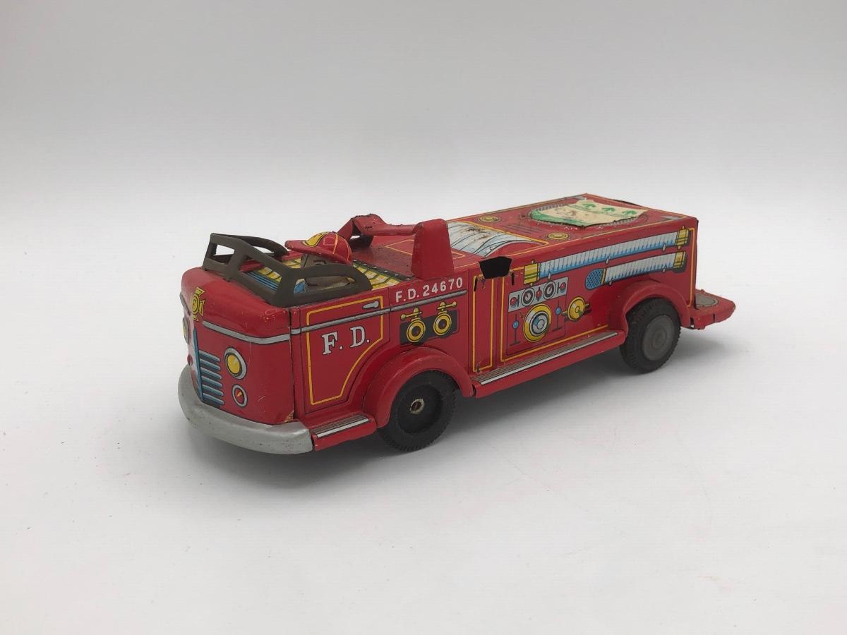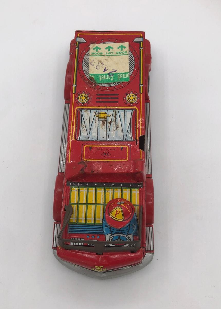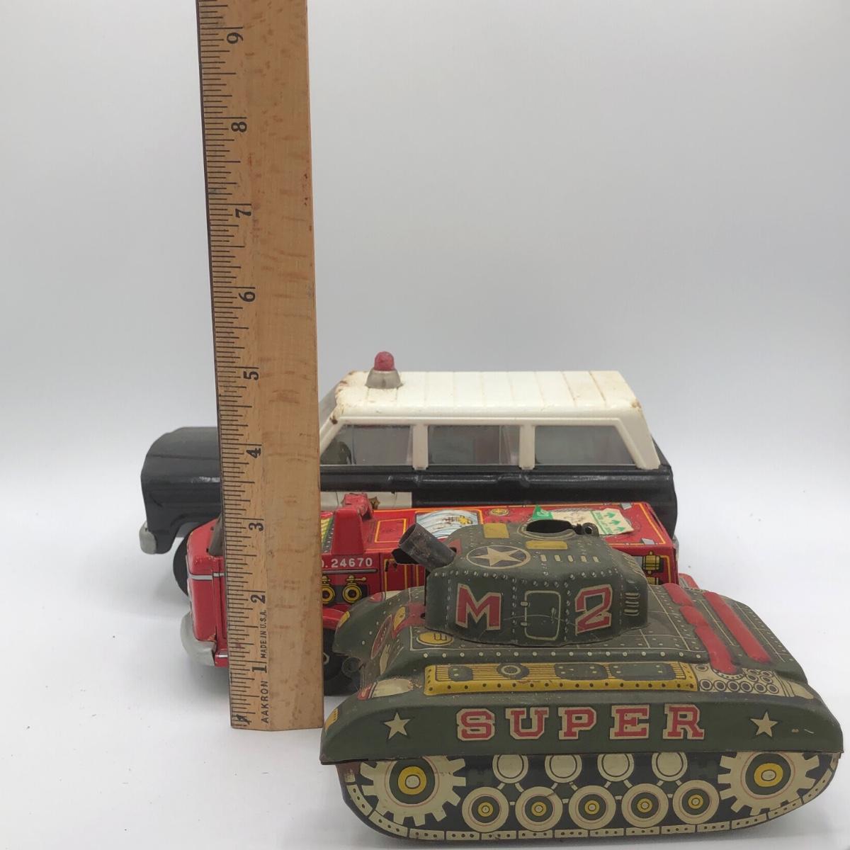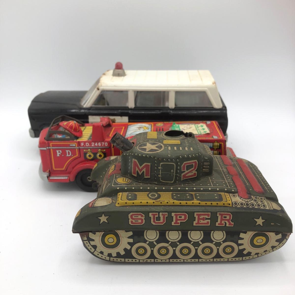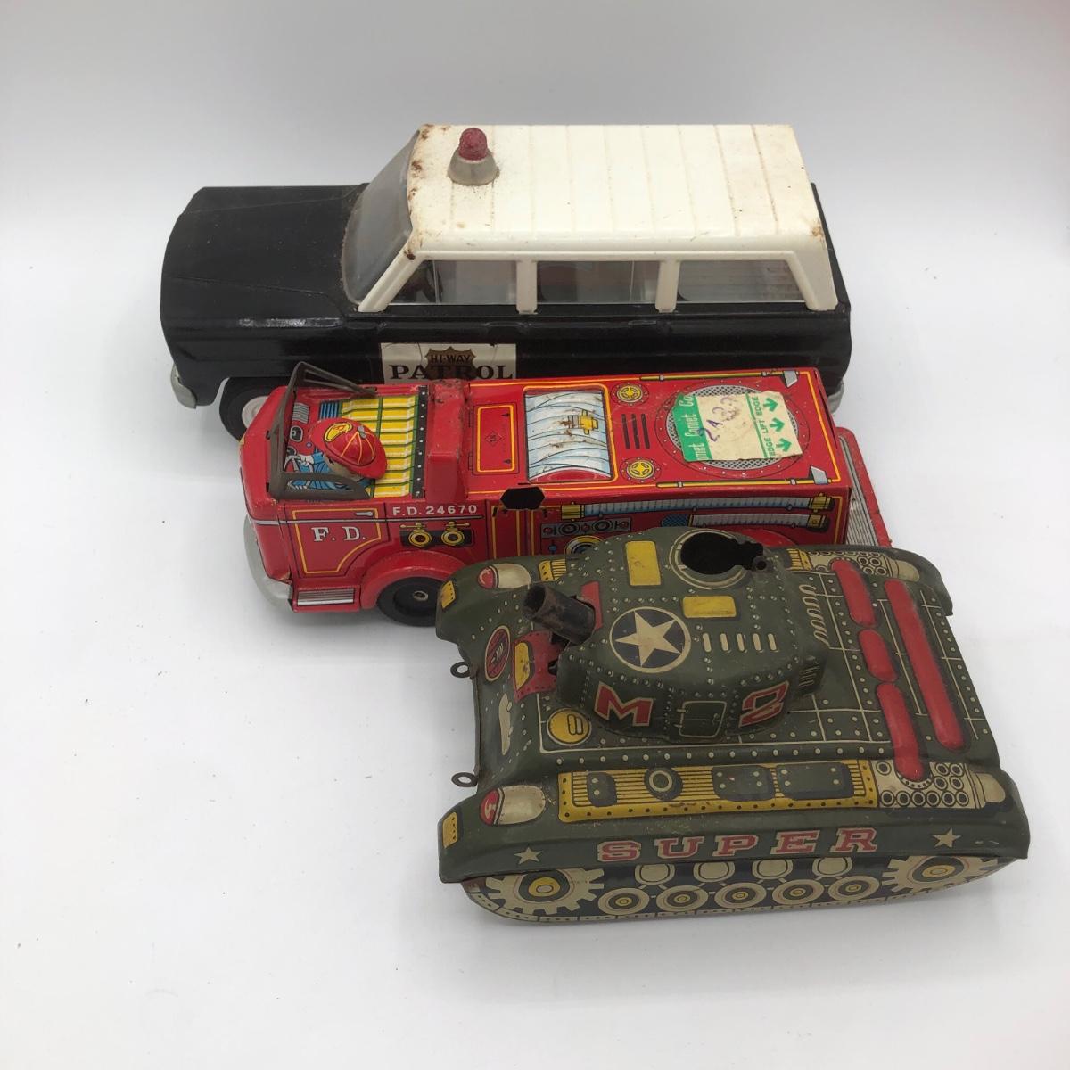 LOT 144B: Vintage 1960s Tonka Highway Patrol Wagoneer, Vintage 1960s Tin Firetruck & 1950s Sato Tin Litho Super Tank Toy