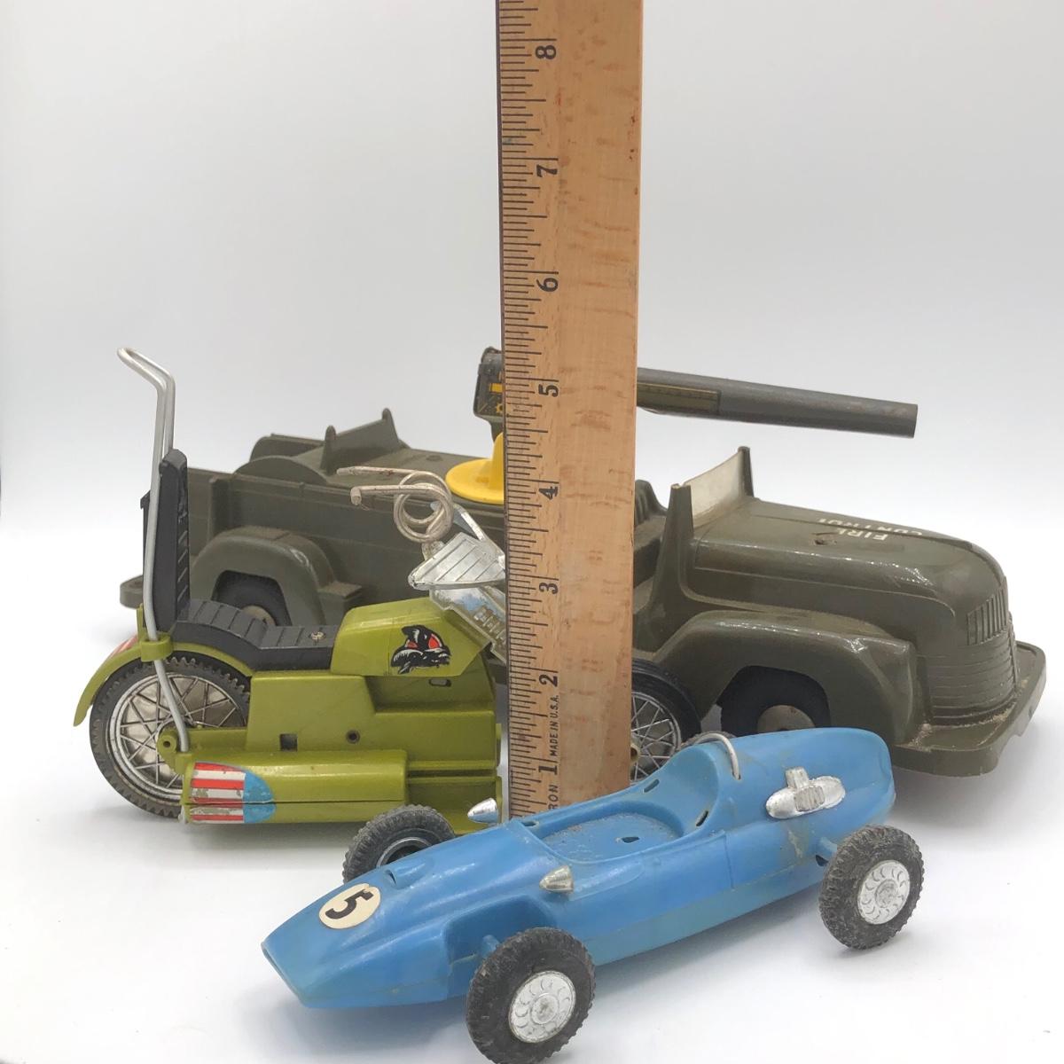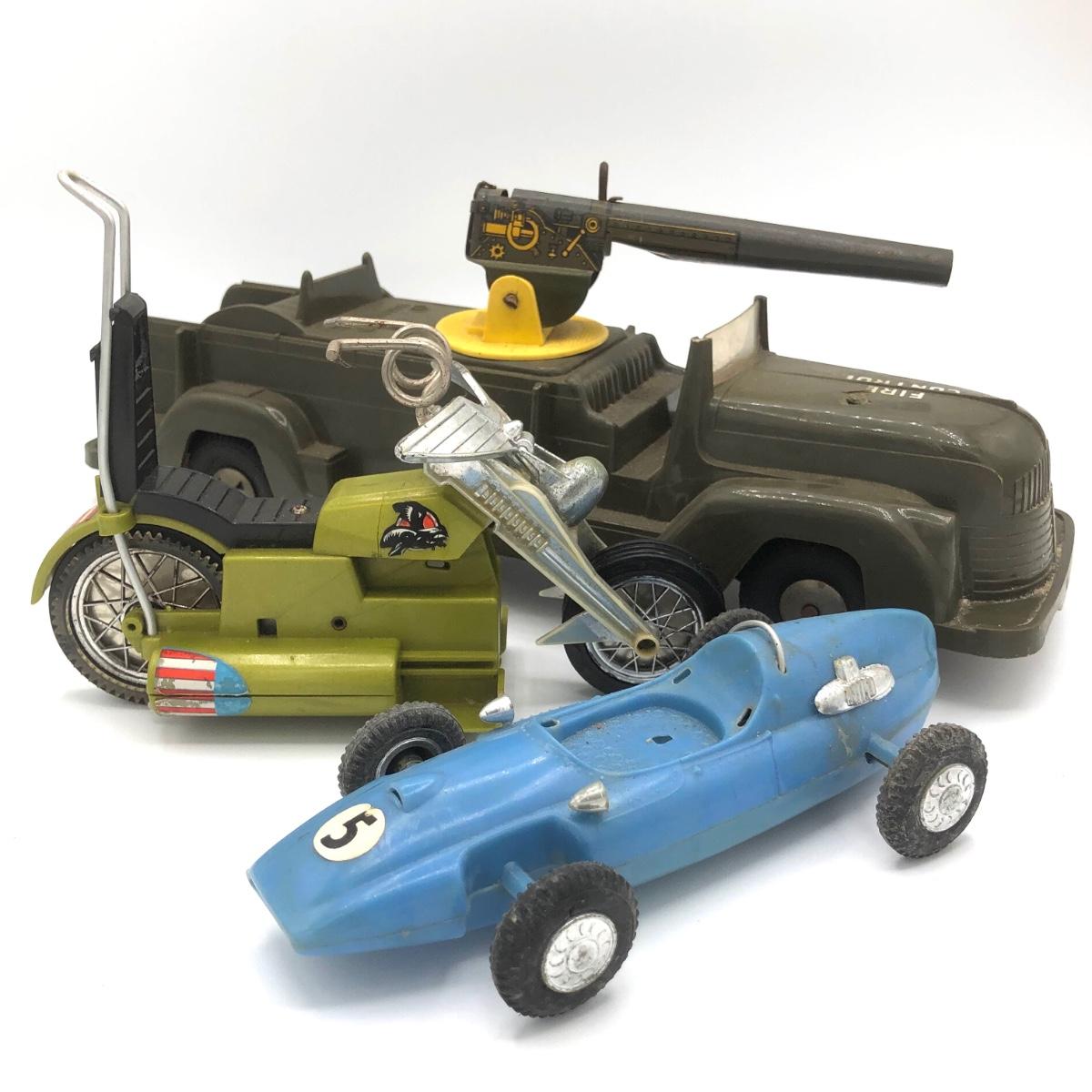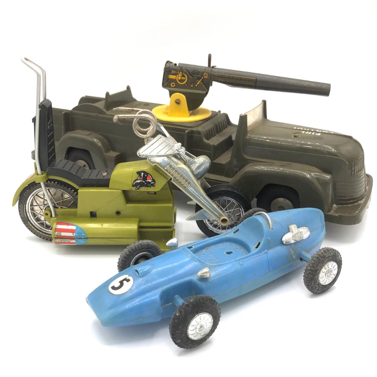 LOT 149B: Vintage 1950s Marx Toys Anti-Aircraft Vehicle, 1971 Hasbro Buzzard Screamin Demons Daredevil's Bike (No Doll) & Vintage Plastic Derby Car