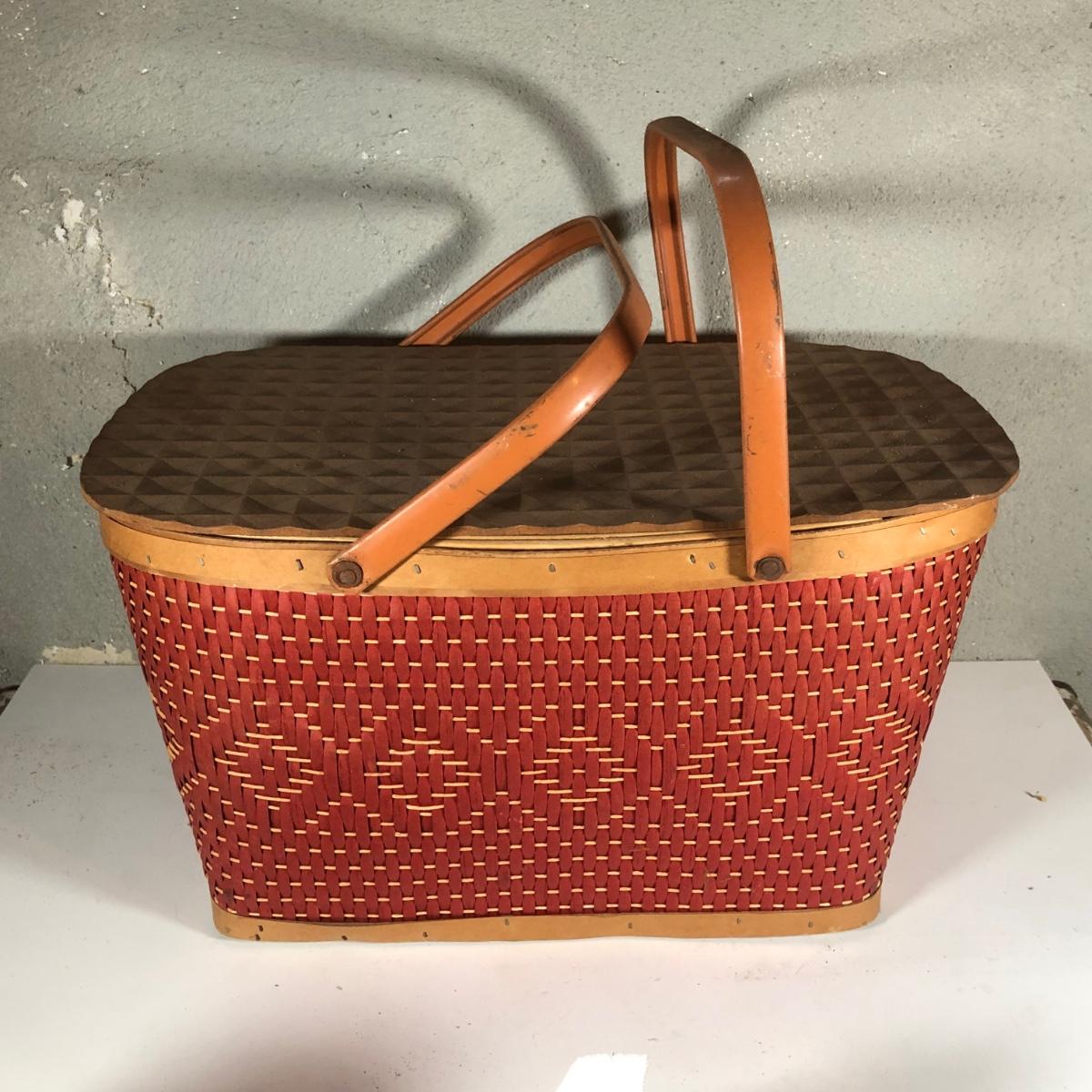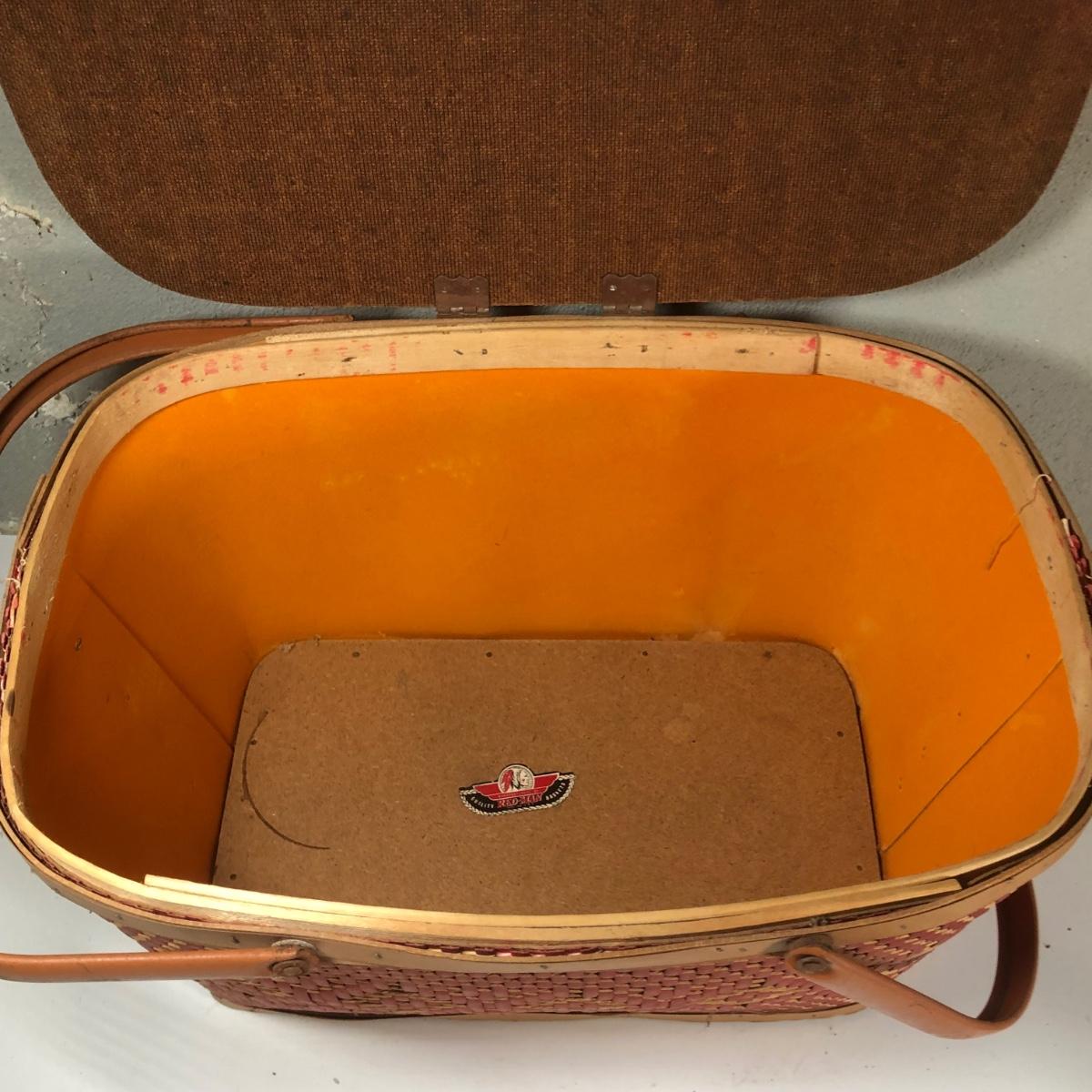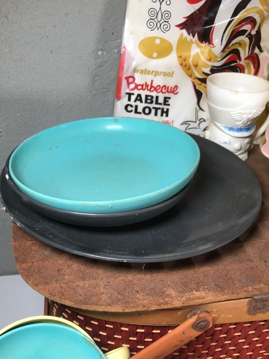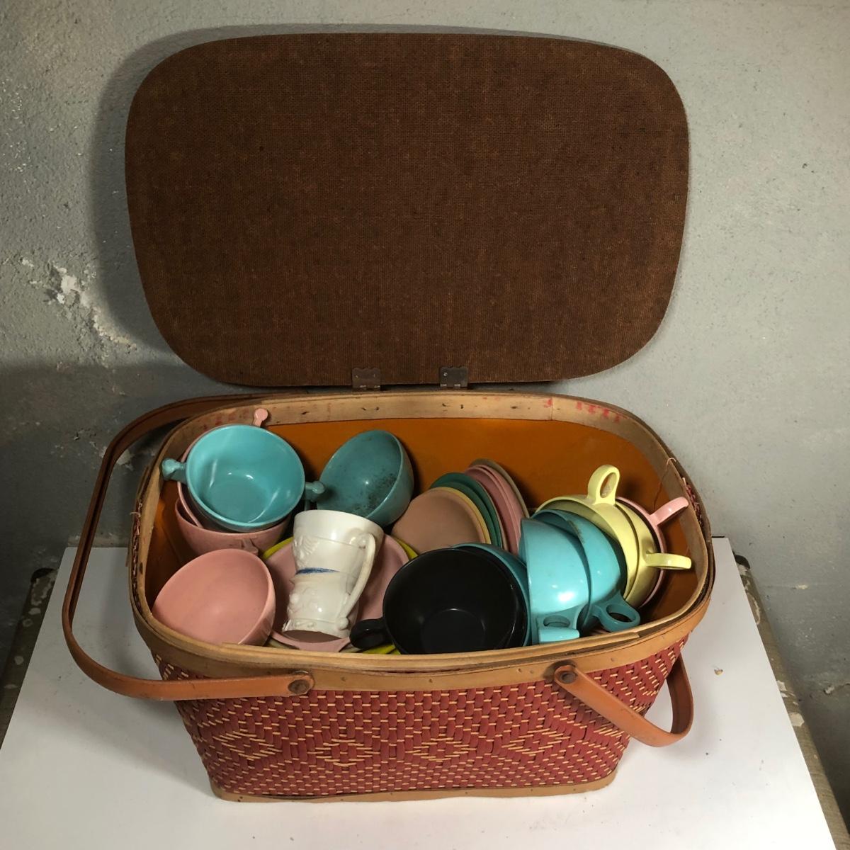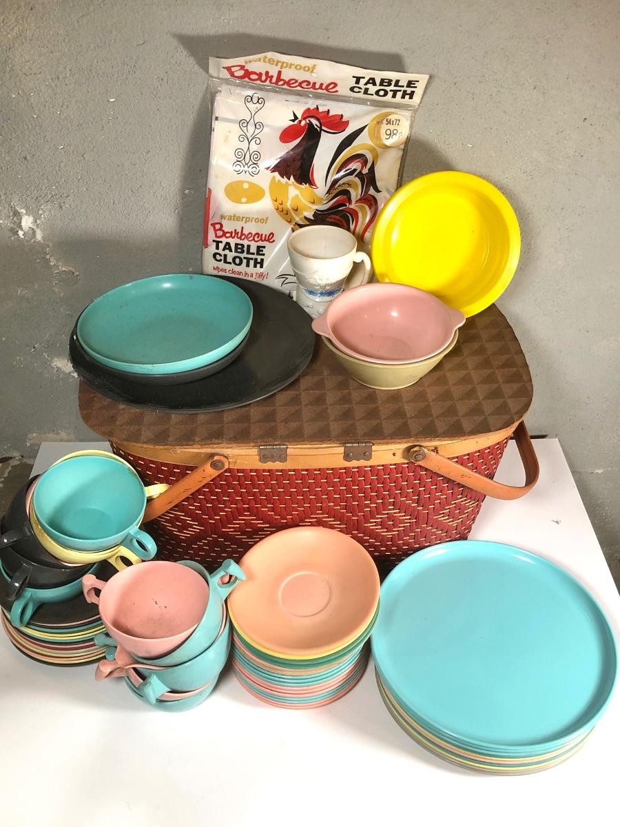 LOT 267B: Picnic Party! Vintage Red-Man Picnic Basket & Plastic Dishware - Aladdin, Grant Crest, Mallo-Ware, Spaulding Ware & More