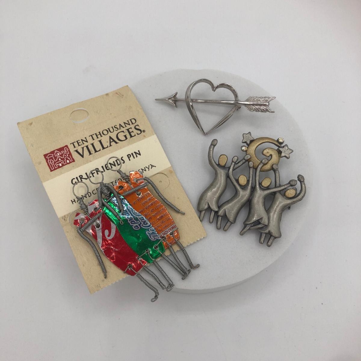 LOT 2J: BEAU Sterling Cupids Arrow Pin, Pewter & Brass Brooch signed “DD” & Packaged Hand Crafted Girlfriend Sisterhood Pin