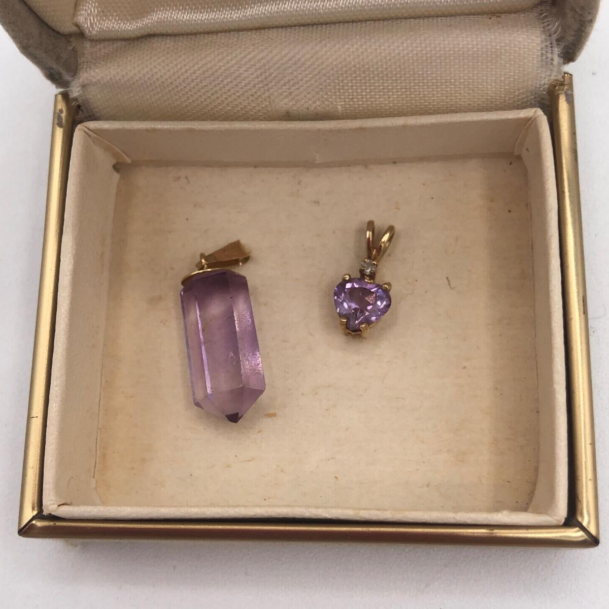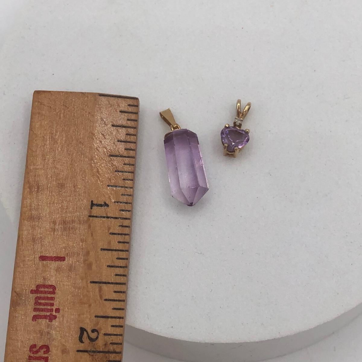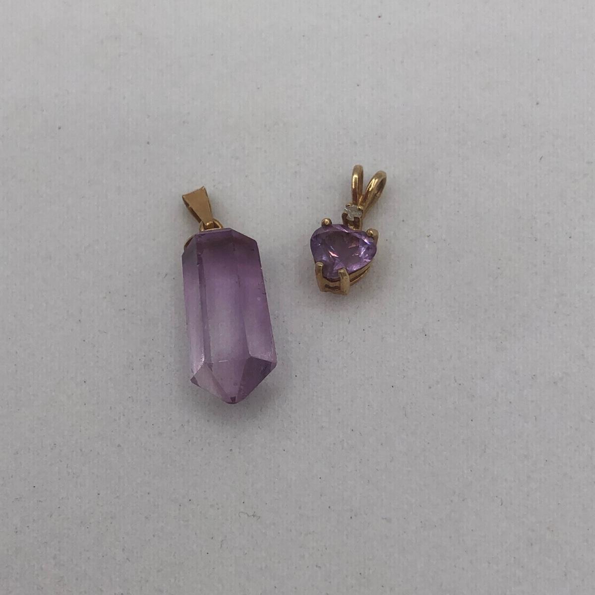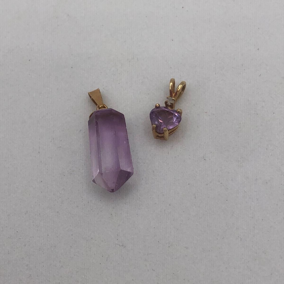 LOT 12J: 14k Amethyst & Diamond Chip Heart Pendant & 14KP Amethyst Crystal Mini Point Pendant