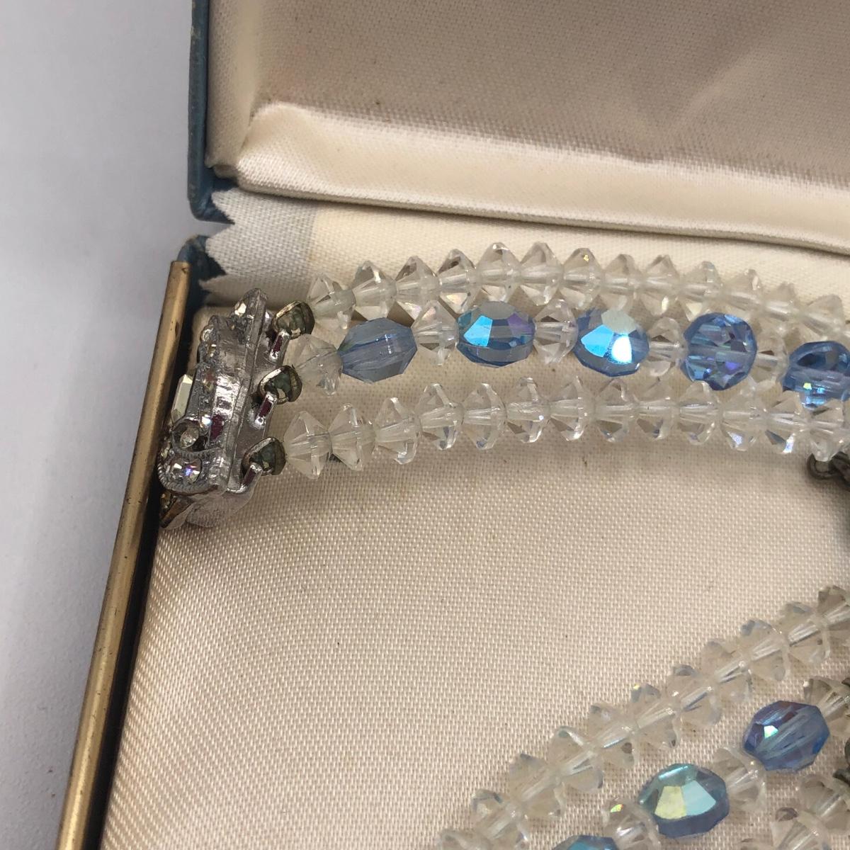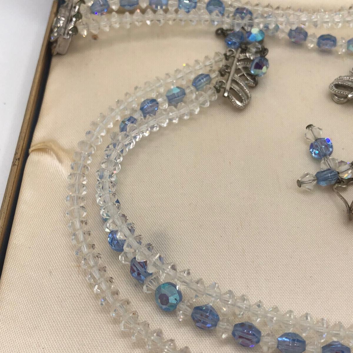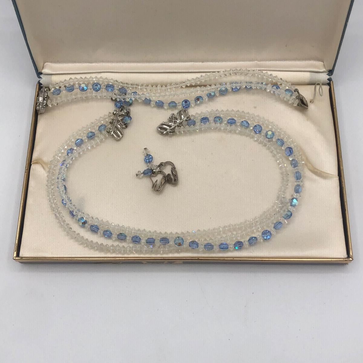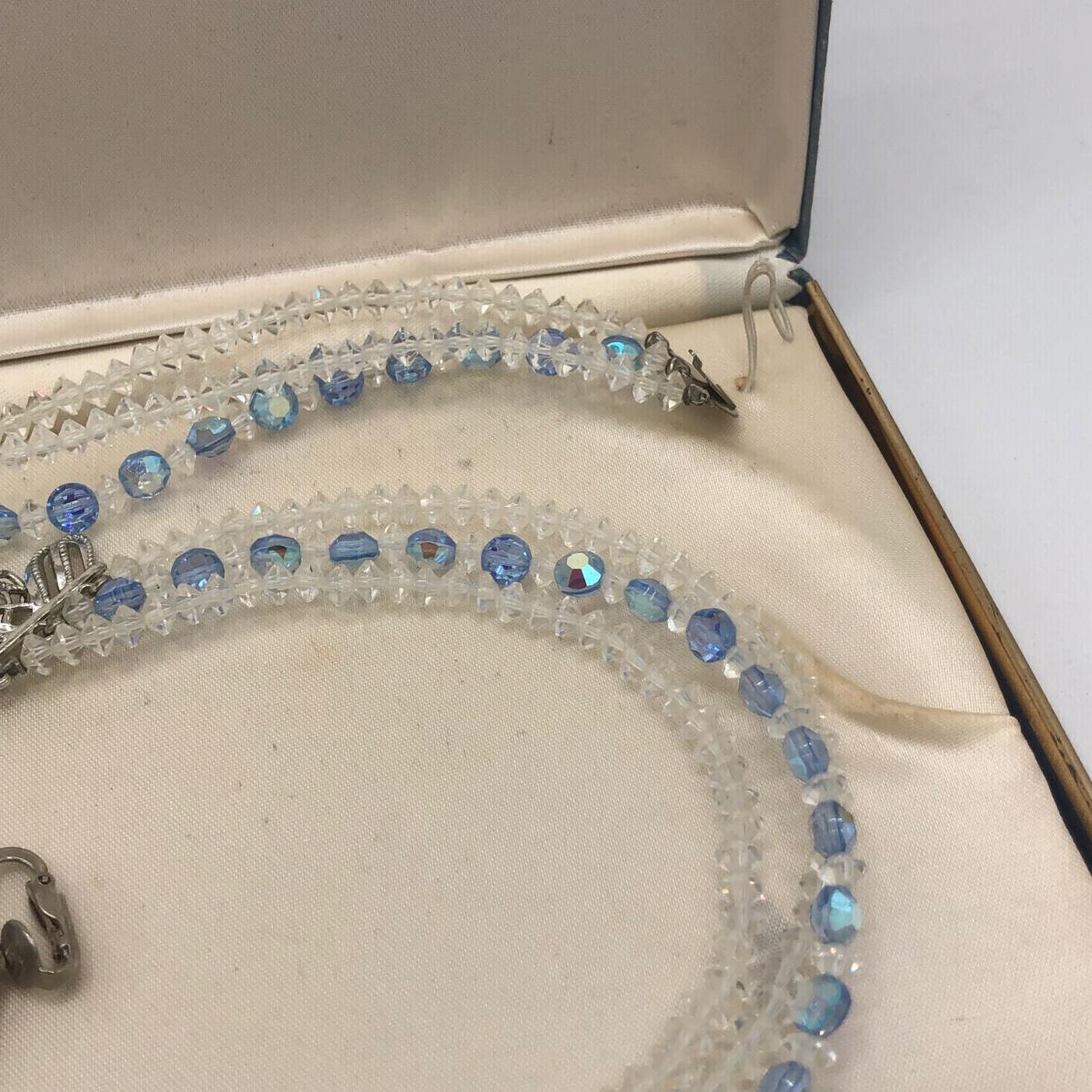LOT 17J: Vintage Triple Strand Swarovski Crystal & Blue Aurora Borealis Bead Necklace (16”), Bracelet (7.5”) & Earrings w/ Silvertone Findings in Box