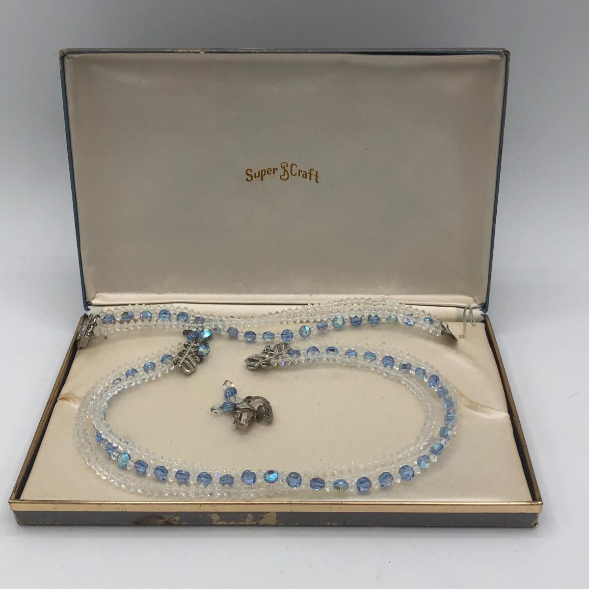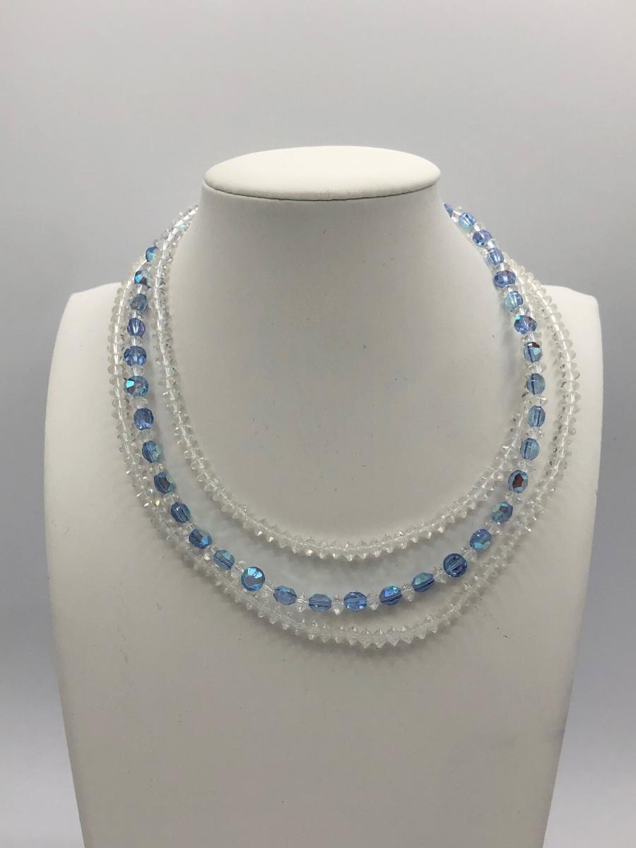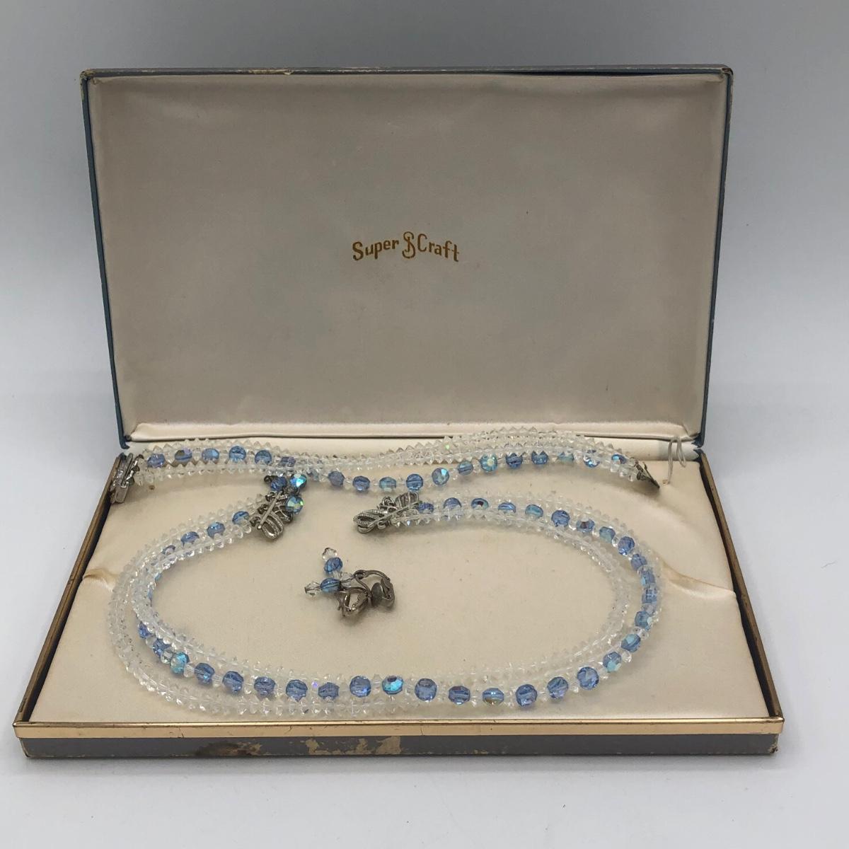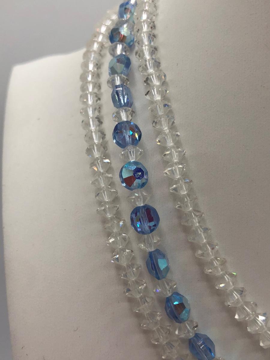 LOT 17J: Vintage Triple Strand Swarovski Crystal & Blue Aurora Borealis Bead Necklace (16”), Bracelet (7.5”) & Earrings w/ Silvertone Findings in Box