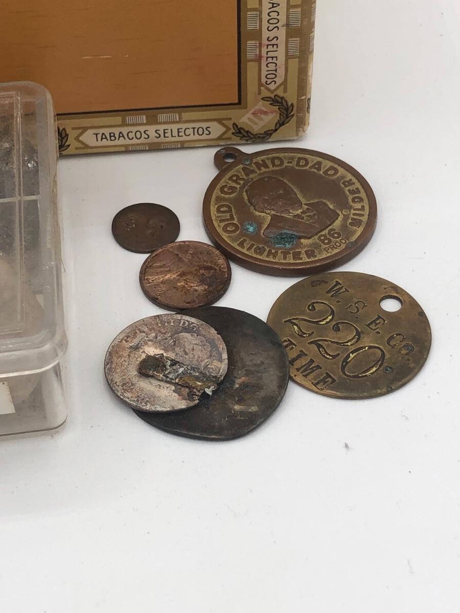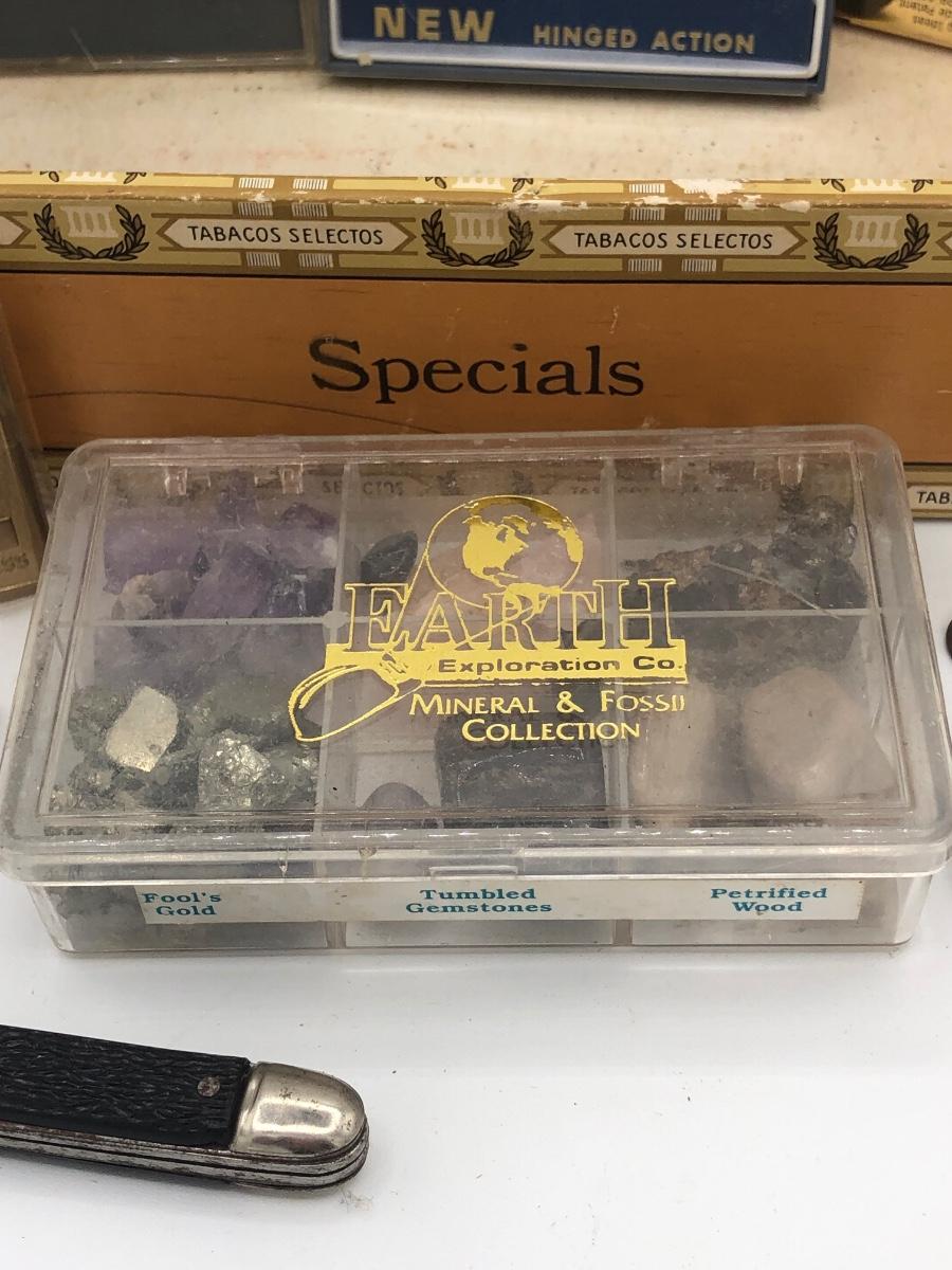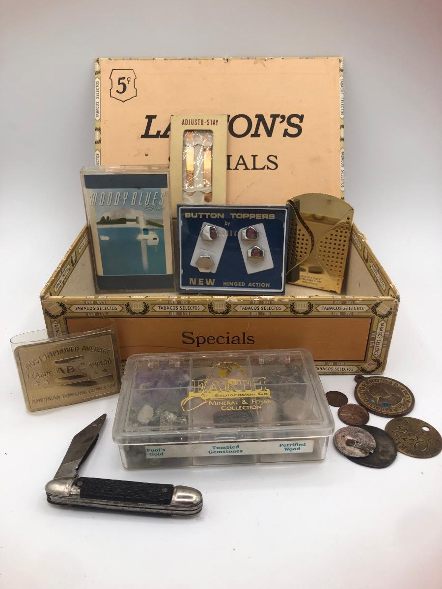 LOT 26K: Vintage Layton’s Cigar Box filled with Goodies! Coins, Swank Accessories NIP, Folding Pocket Knife, Earth Exploration Co Mineral and Fossil Collection & More